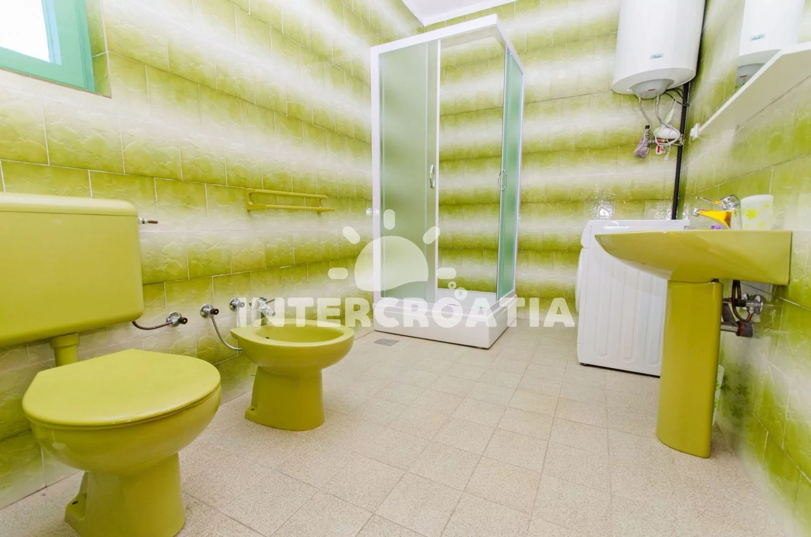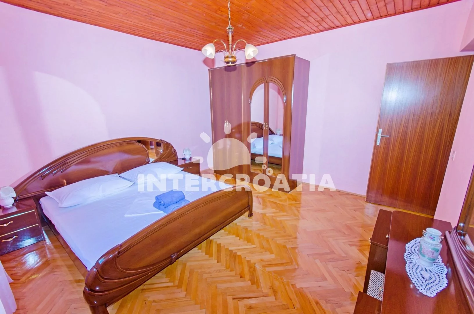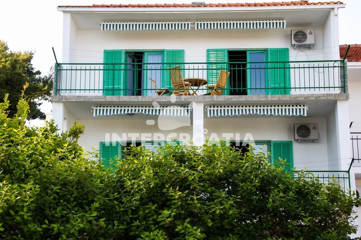 Apartmán (70 m2) s terasou, venkovním posezením a výhledem na moře se nachází ve 2. patře domu. Apartmán má 2 ložnice a je vhodný pro 4 až 6 osob. Obývací pokoj je spojený s kuchyní. Kuchyňská linka je vybavena sklokeramickou varnou deskou, digestoří, vestavěnou troubou, mikrovlnnou troubou, rychlovarnou konvicí, nádobím a lednicí s mrazákem. Obývací pokoj s jídelním stolem, pohovkou (rozložitelná na extra lůžko pro 2 osoby), televizí se satelitním programem, klimatizací a vstupem na terasu. První ložnice s dvoulůžkem. Druhá ložnice s dvěma jednolůžky a vstupem na terasu. Koupelna se sprchovým koutem, umyvadlem, fénem, pračkou, bidetem a wc. Hostům je k dispozici parkování u objektu zdarma.