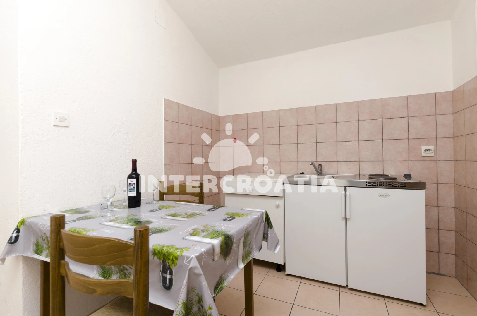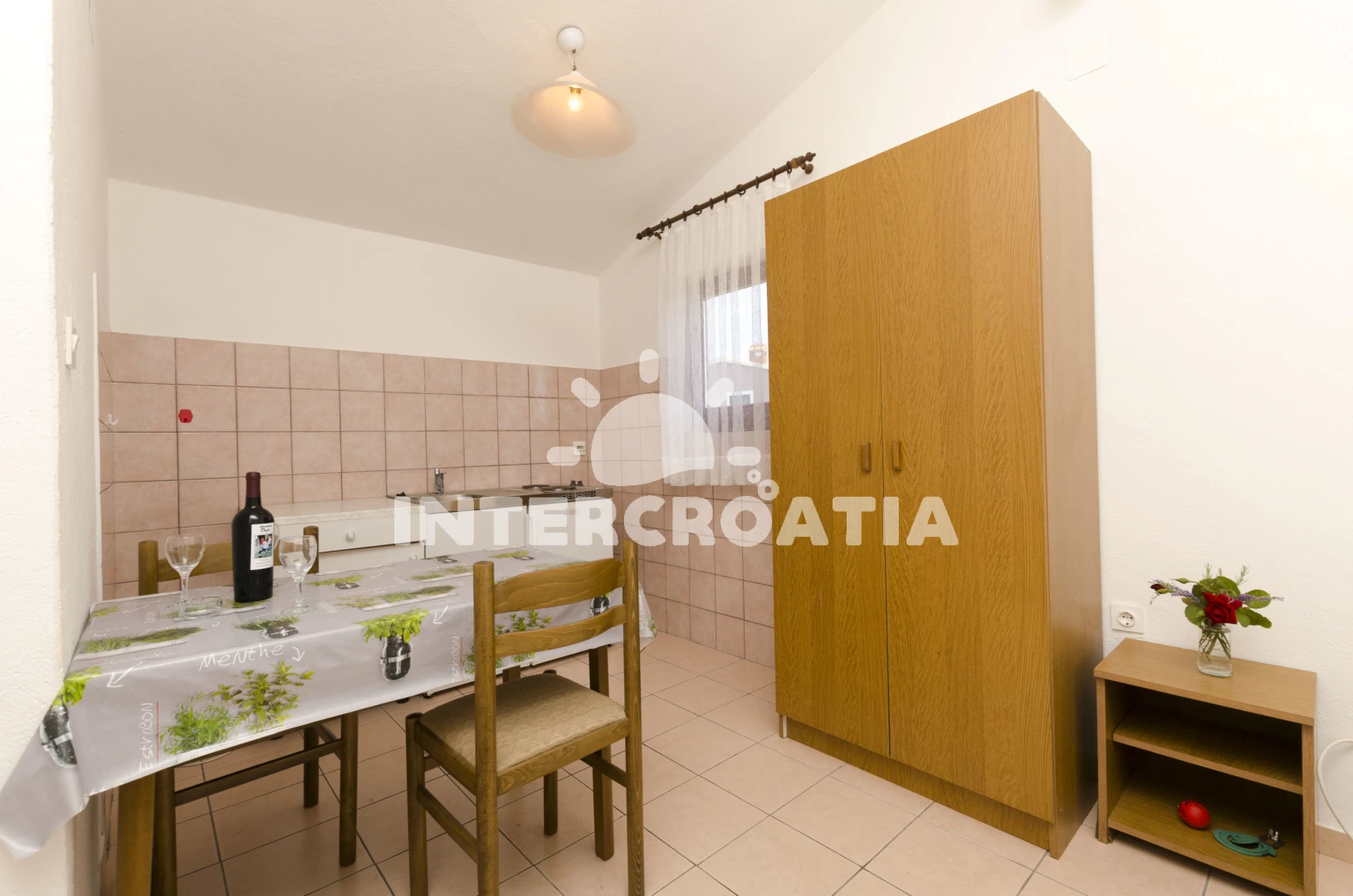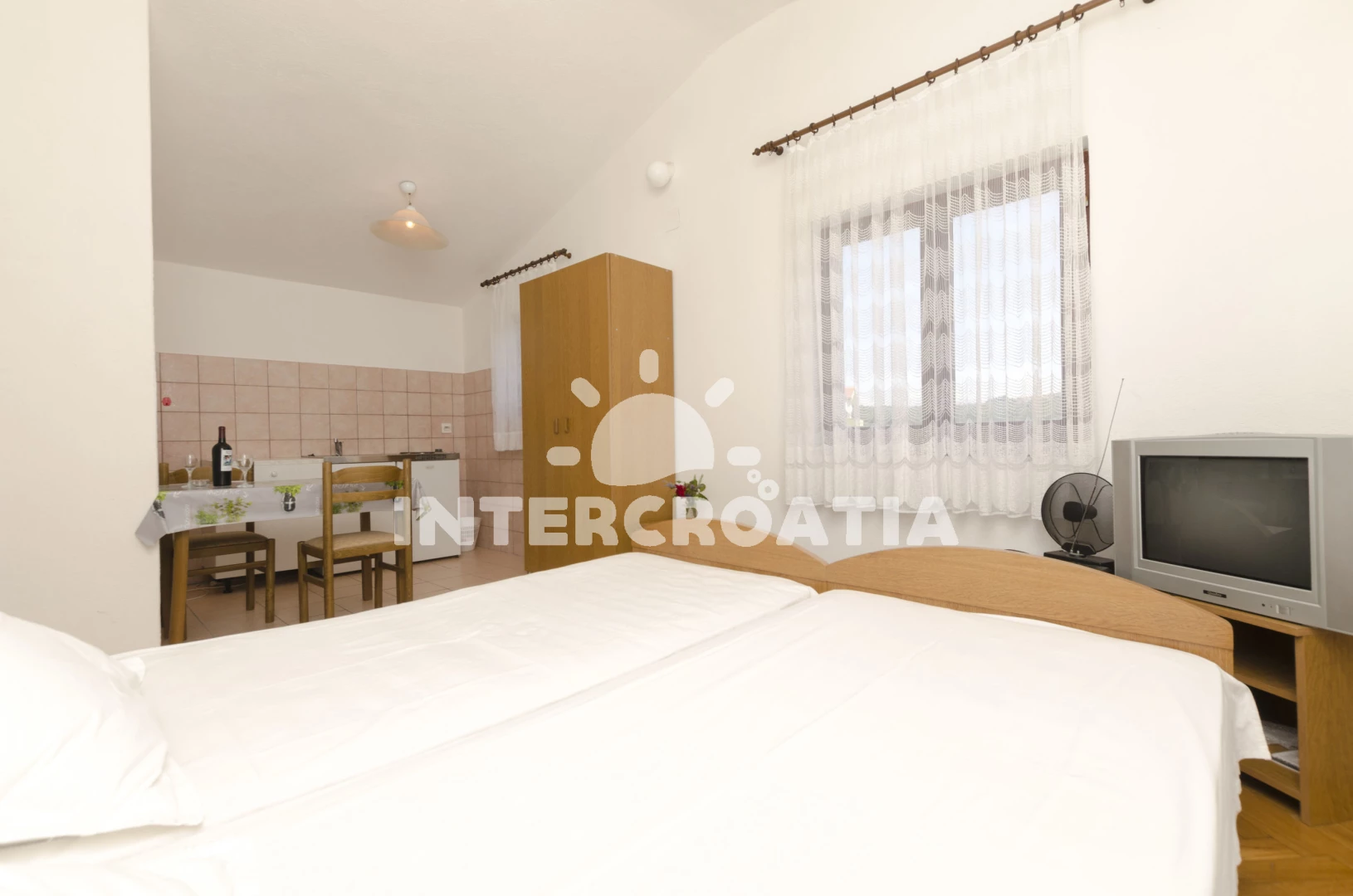 Apartmán (25 m2) typu studio se nachází ve 2. patře domu. Apartmán má 1 místnost a je vhodný pro 2 osoby. Kuchyňská linka je vybavena dvouplotýnkovým vařičem, nádobím a lednicí s mrazákem. Obývací místnost s jídelním stolem, dvoulůžkem, televizí a klimatizací. Koupelna se sprchovým koutem, umyvadlem a wc. Hostům je k dispozici parkování u objektu zdarma.