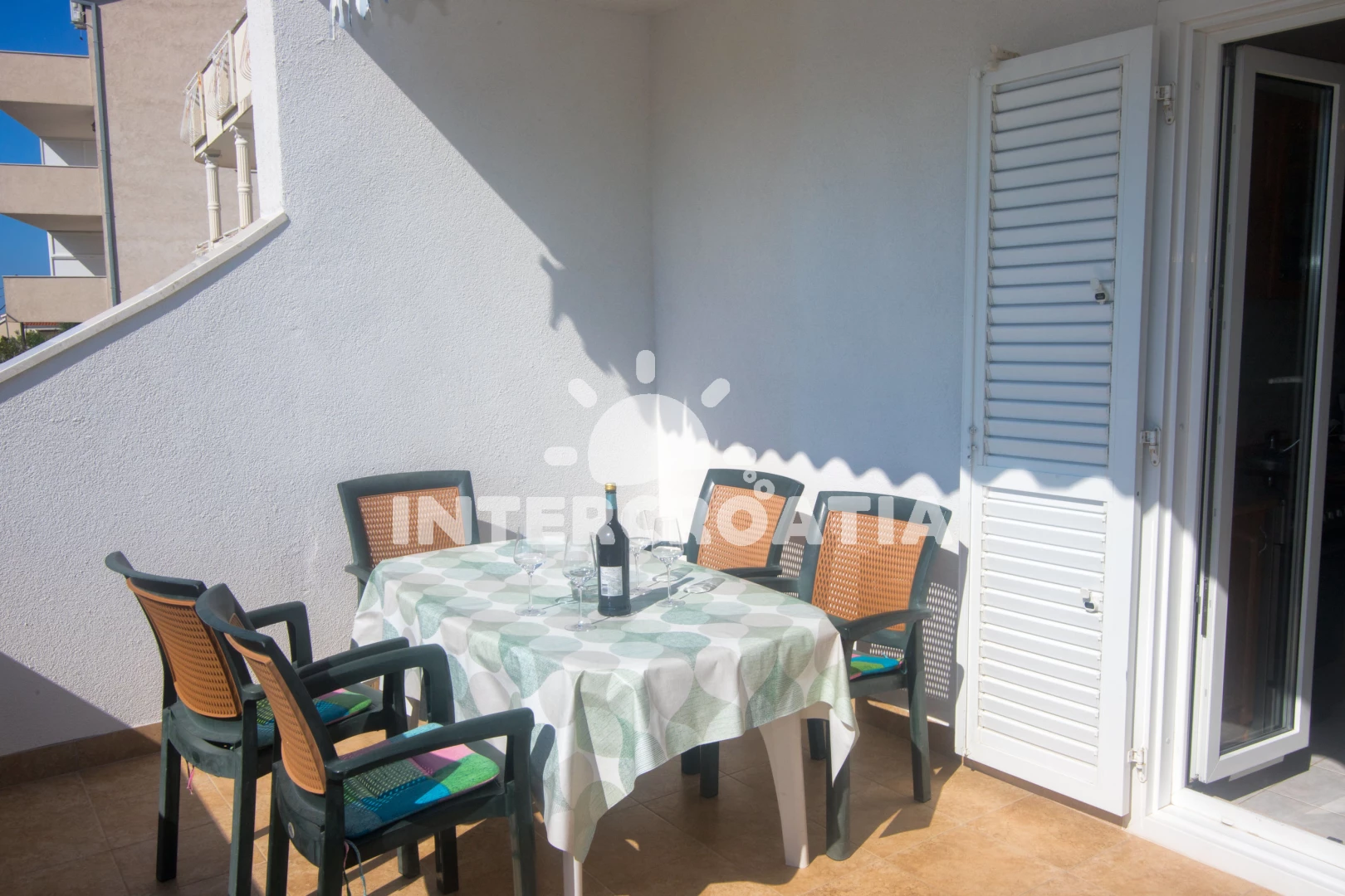 Apartmán se nachází 70 m od moře a pláže. Pláž je kamenné a betonové desky. Apartmán disponuje bazénem s lehátky pro ubytované hosty. U objektu je k dispozici společná zahrada s posezením a grilem.