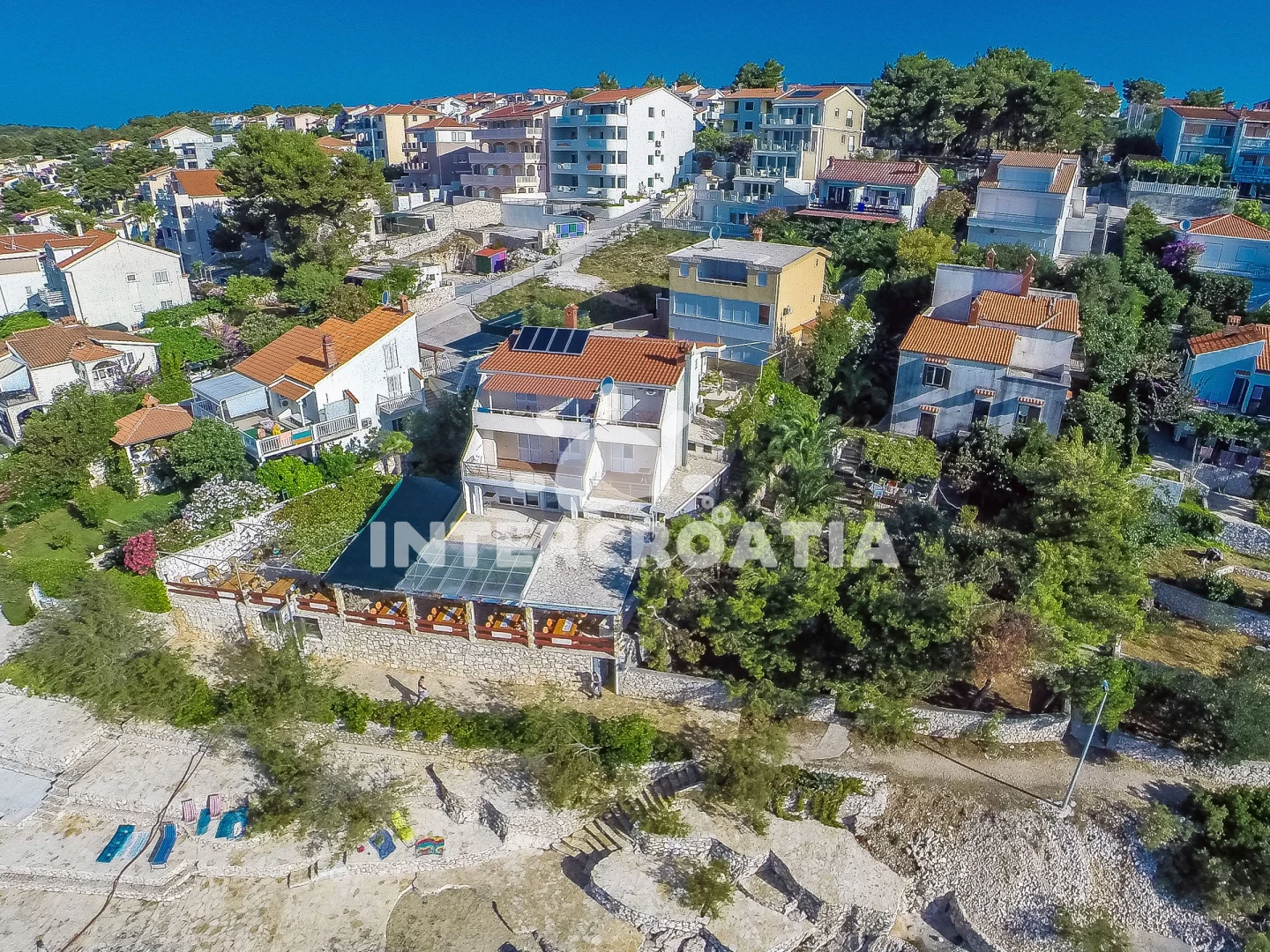 Apartmán se nachází 20 m od moře a pláže. Pláž je betonové desky. Apartmán disponuje bazénem s lehátky pro ubytované hosty. Parkování je 50m - 150 m od domu.