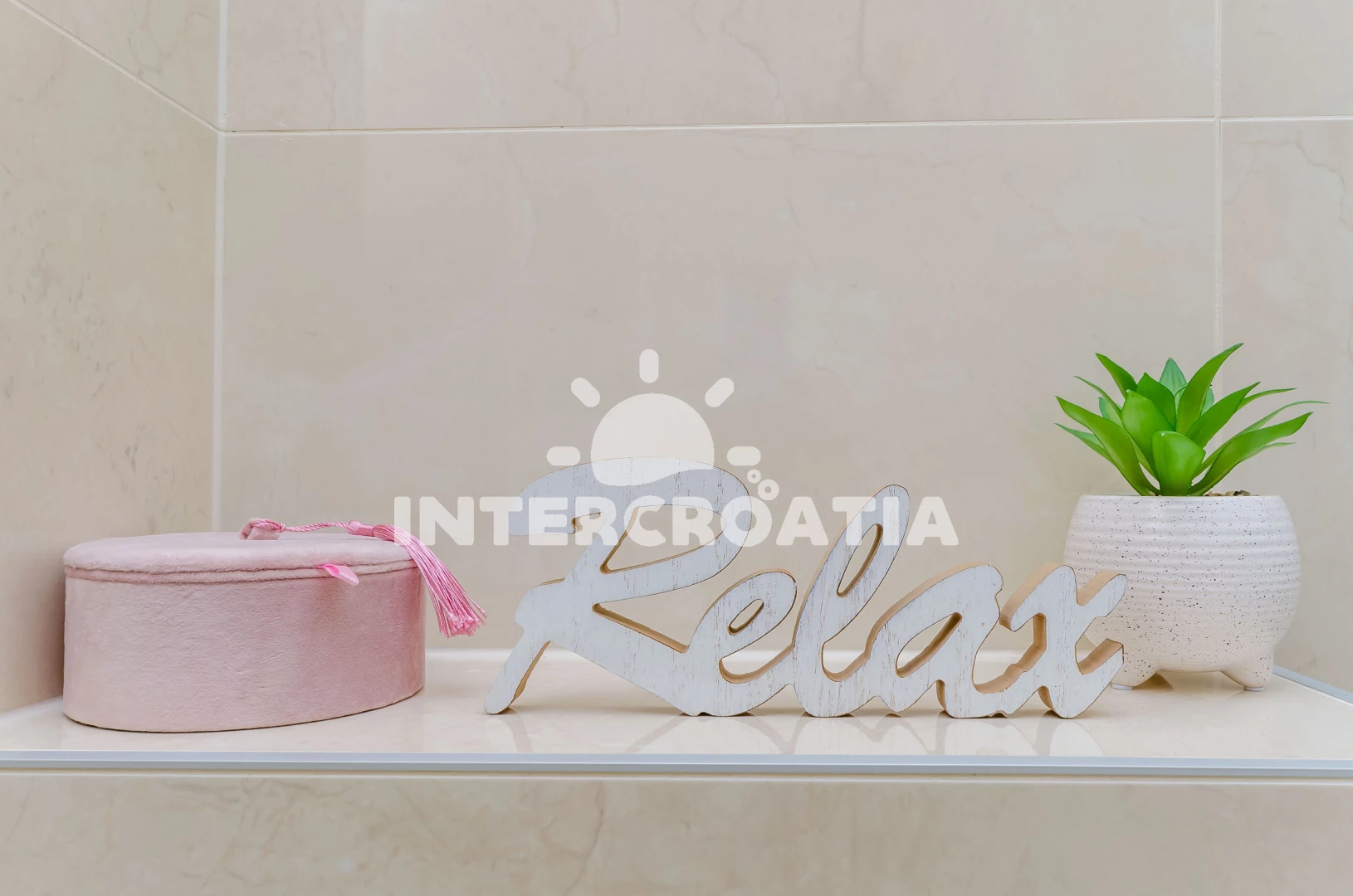 Apartmán se nachází 700 m od moře a pláže. Pláž je skalnatá, oblázková a betonové desky. Apartmán disponuje bazénem s lehátky pro ubytované hosty. U objektu je k dispozici společná zahrada s posezením a grilem.