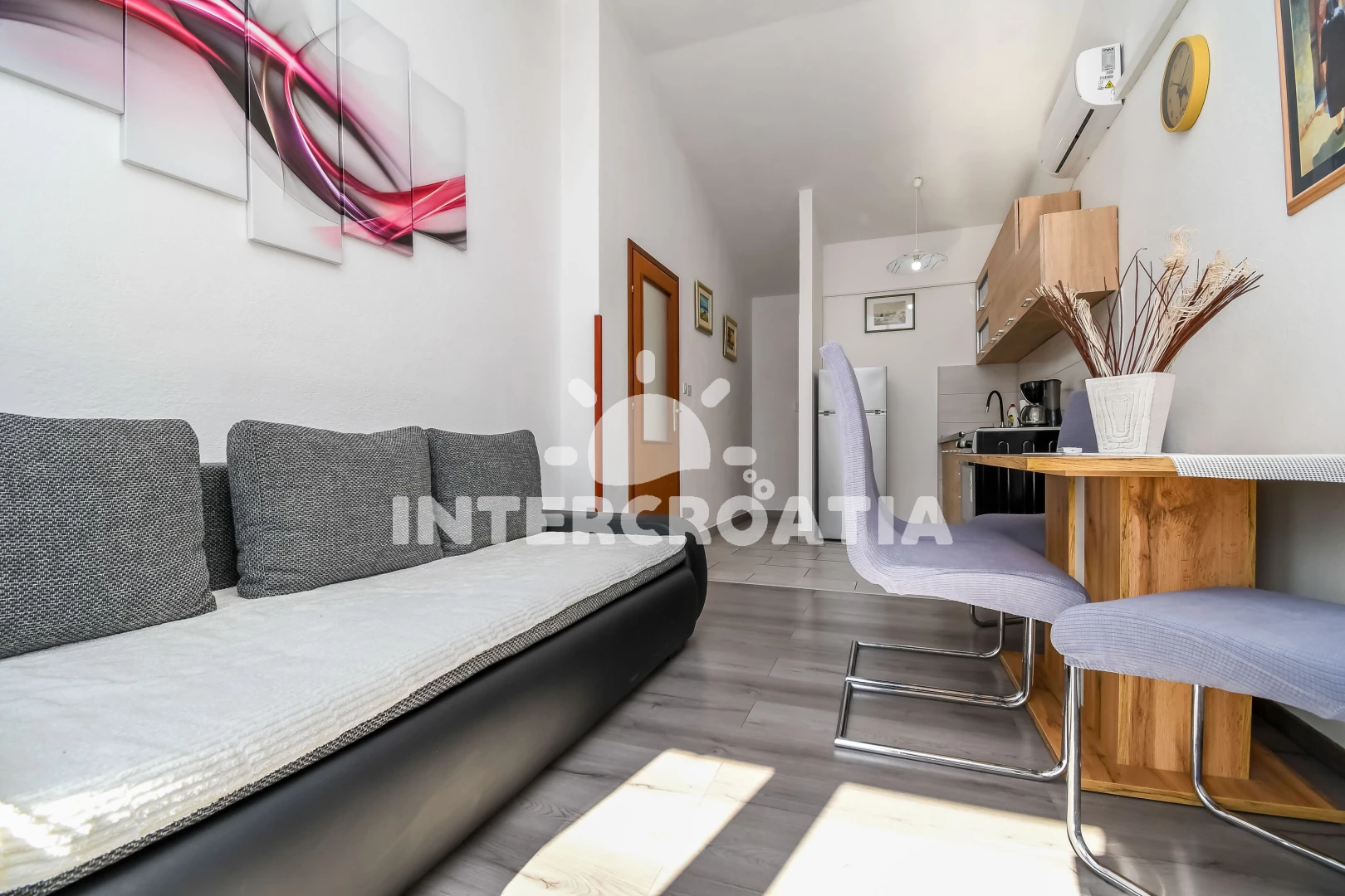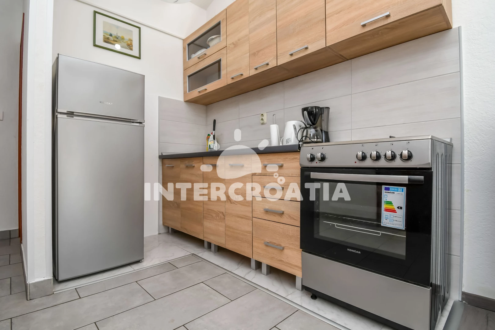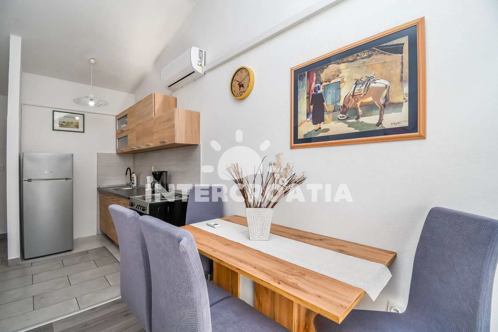 Vzdálenosti: Moře 100 m, pláž 100 m (kamenné a betonové desky), supermarket 300 m, bar 300 m, restaurace 300 m, centrum 1 km, veřejná doprava 1 km, lékárna 1 km, ambulance 1 km, směnárna 1 km, banka 1 km, pošta 1 km, čerpací stanice 3 km, letiště (Split) 5 km, trajekt (Split) 25 km, park Plitvice 64 km,