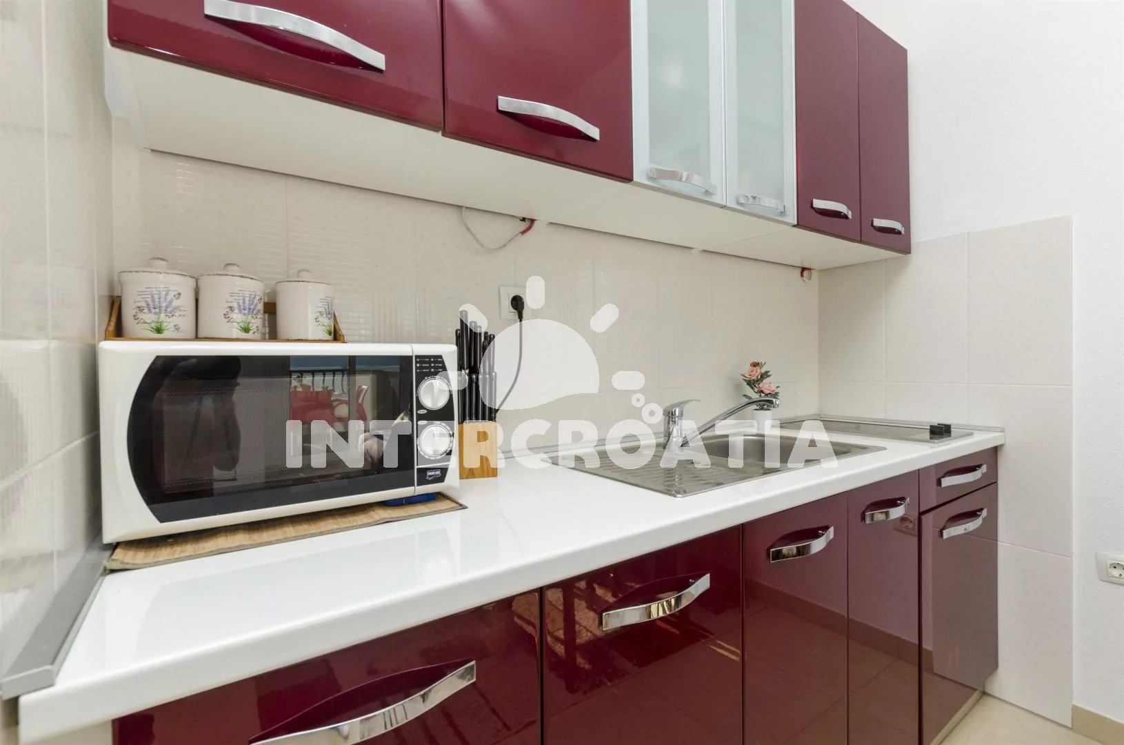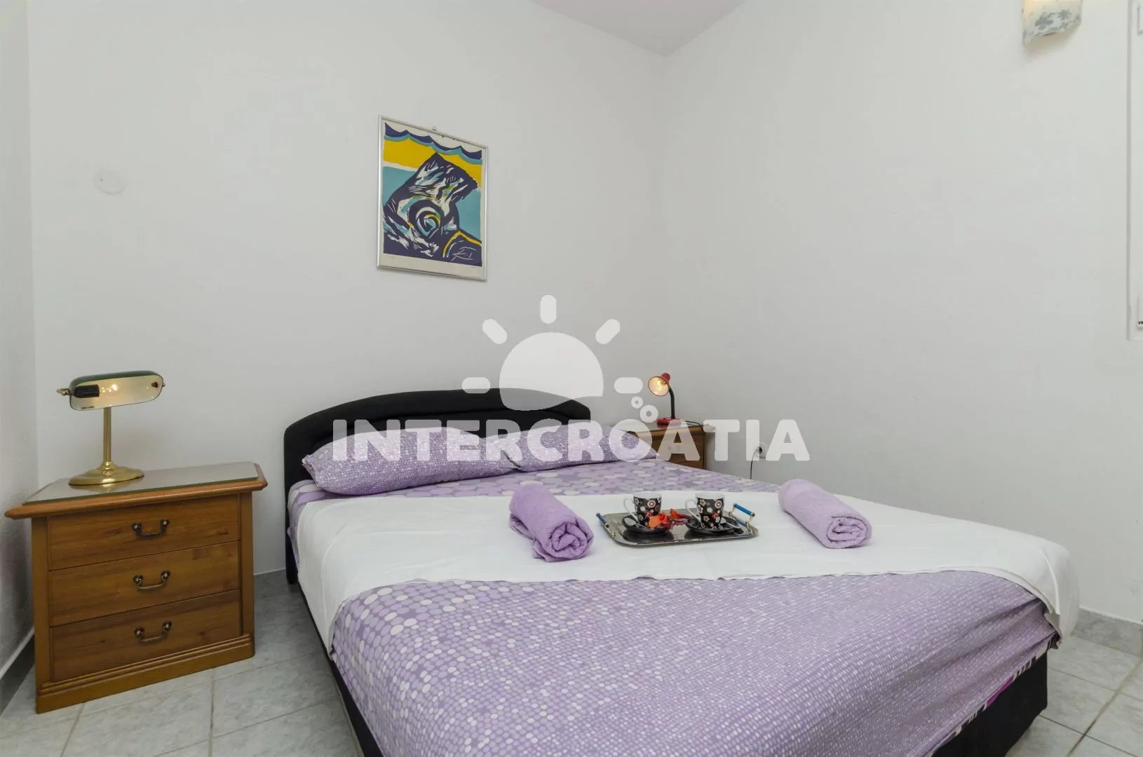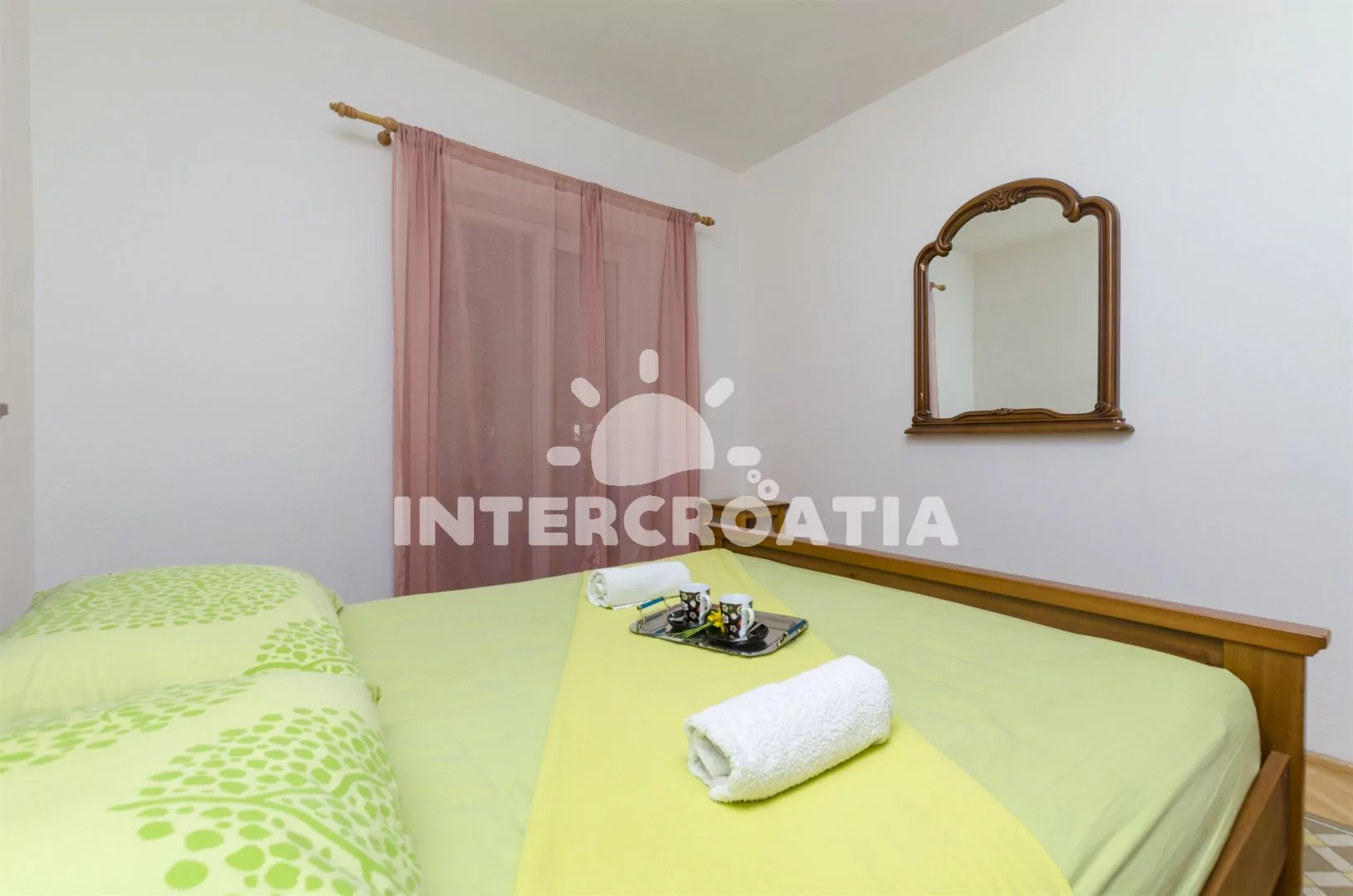 Apartmán až pro 6 osob se nachází v prvním patře domu. Kuchyň spojena s obývacím pokojem. Kuchyňský kout s pracovní deskou, nádobím, elektrickým dvouplotýnkovým sporákem, myčkou na nádobí, mikrovlnnou troubou, rychlovarnou konvicí, kávovarem, lednicí a jídelním stolem. Obývací část s pohovkou (extra lůžko pro 2 osoby) a televizí. První i druhá ložnice je vybavena jedním dvoulůžkem. Koupelna se sprchovým koutem, pračkou, fénem, umyvadlem a wc. K dispozici: klimatizace, WiFi, žehlička, rádio, terasa s posezením a výhledem na moře. Hostům je k dispozici parkování u objektu zdarma.