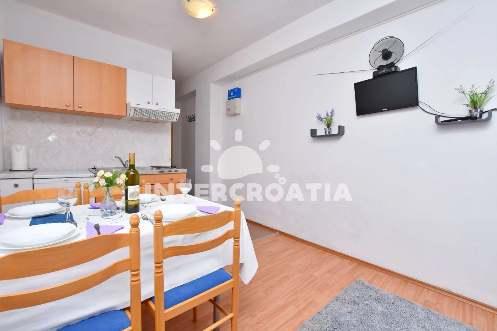 Apartmán s lodžií a výhledem na moře, který je vhodný pro 2 až 4 osoby. Nachází se v přízemí domu. Obývací pokoj je spojený s kuchyní. Kuchyňská linka s elektrickým dvouplotýnkovým vařičem, digestoří…