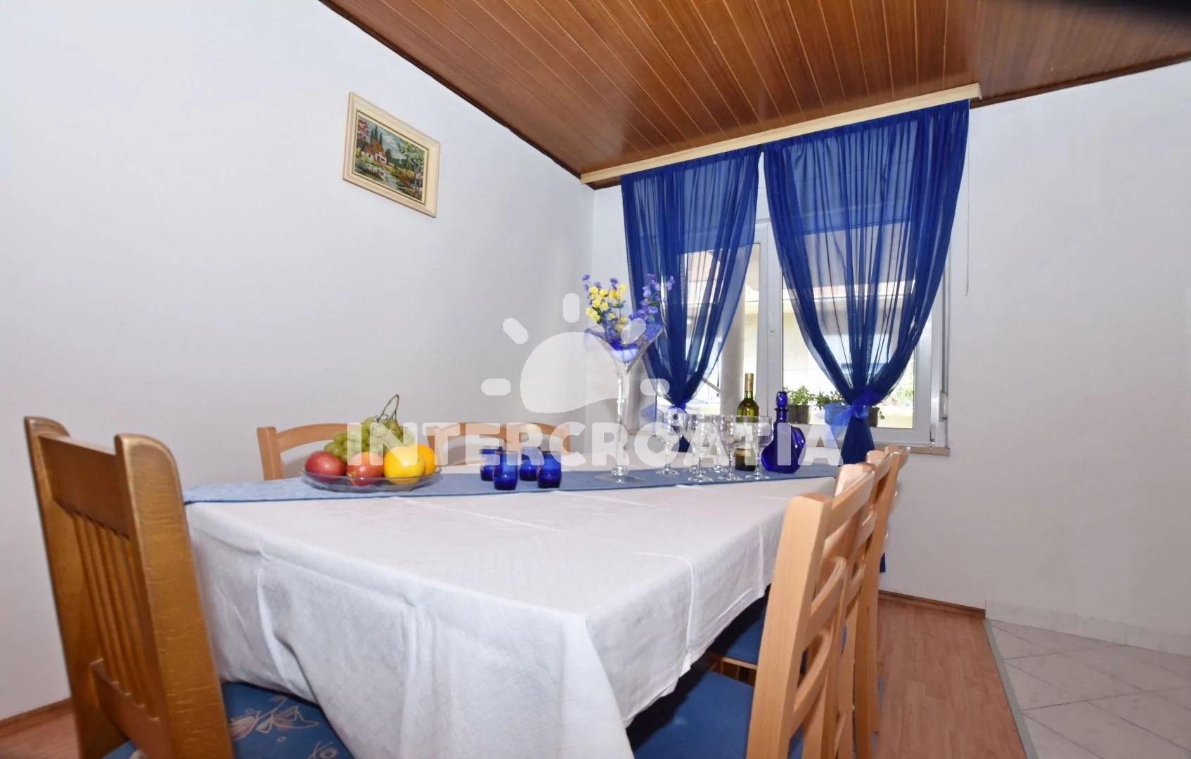 Prostorný apartmán v prvním patře domu s balkony a výhledem na moře je vhodný pro 6 až 8 osob. Samostatná kuchyň a obývací pokoj. Kuchyňská linka se sporákem, troubou, myčkou na nádobí, rychlovarnou…