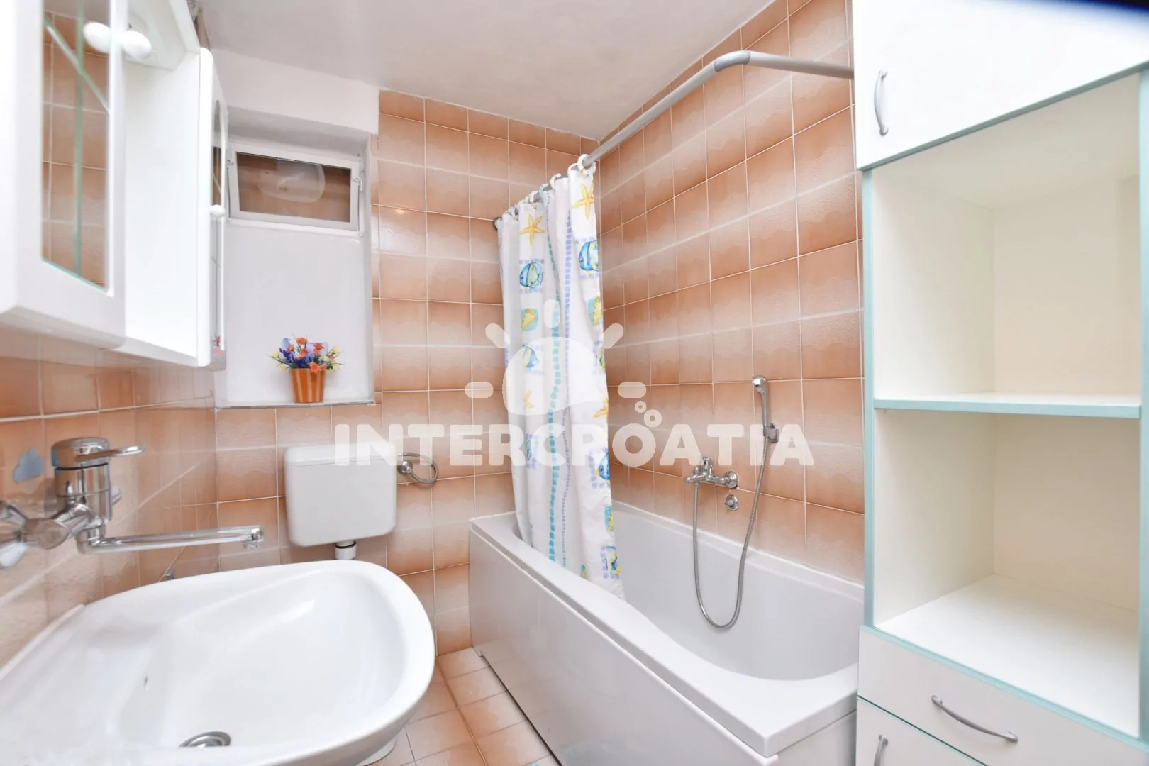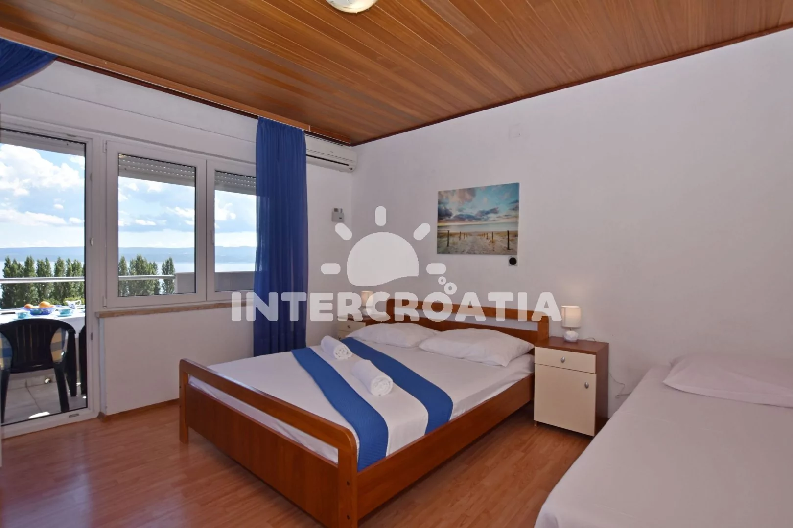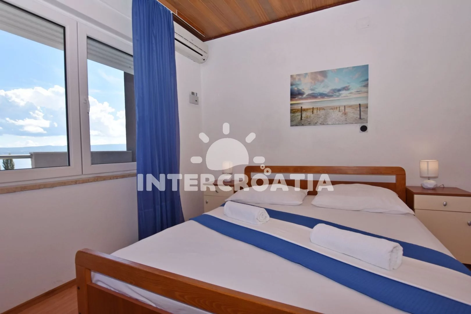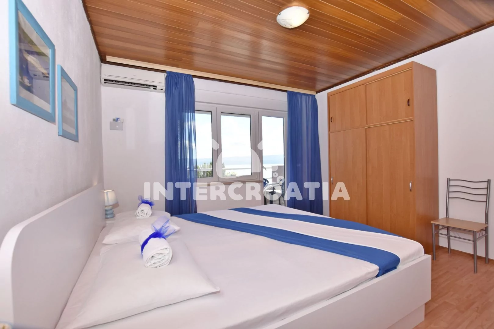Prostorný apartmán v prvním patře domu s balkony a výhledem na moře je vhodný pro 6 až 8 osob. Samostatná kuchyň a obývací pokoj. Kuchyňská linka se sporákem, troubou, myčkou na nádobí, rychlovarnou konvicí, kávovarem, toustovačem, nádobím a chladničkou s mrazákem. Jídelní stůl pro 8 osob. Obývací pokoj s rozložitelnou pohovkou (extra lůžko pro 2 osoby), televizí a klimatizací. Apatmán disponuje třemi ložnicemi. Ložnice jsou klimatizované a vybaveny vždy s jedním dvoulůžkem. První a druhá ložnice má vstup na balkon s výhledem na moře. První koupelna se sprchovým koutem a umyvadlem. Samostatná toaleta s umyvadlem. Druhá koupelna s vanou, sprchovou zástěnou, umyvadlem a wc. Hostům je k dispozici parkování u objektu zdarma (pouze po předchozí dohodě s agenturou).