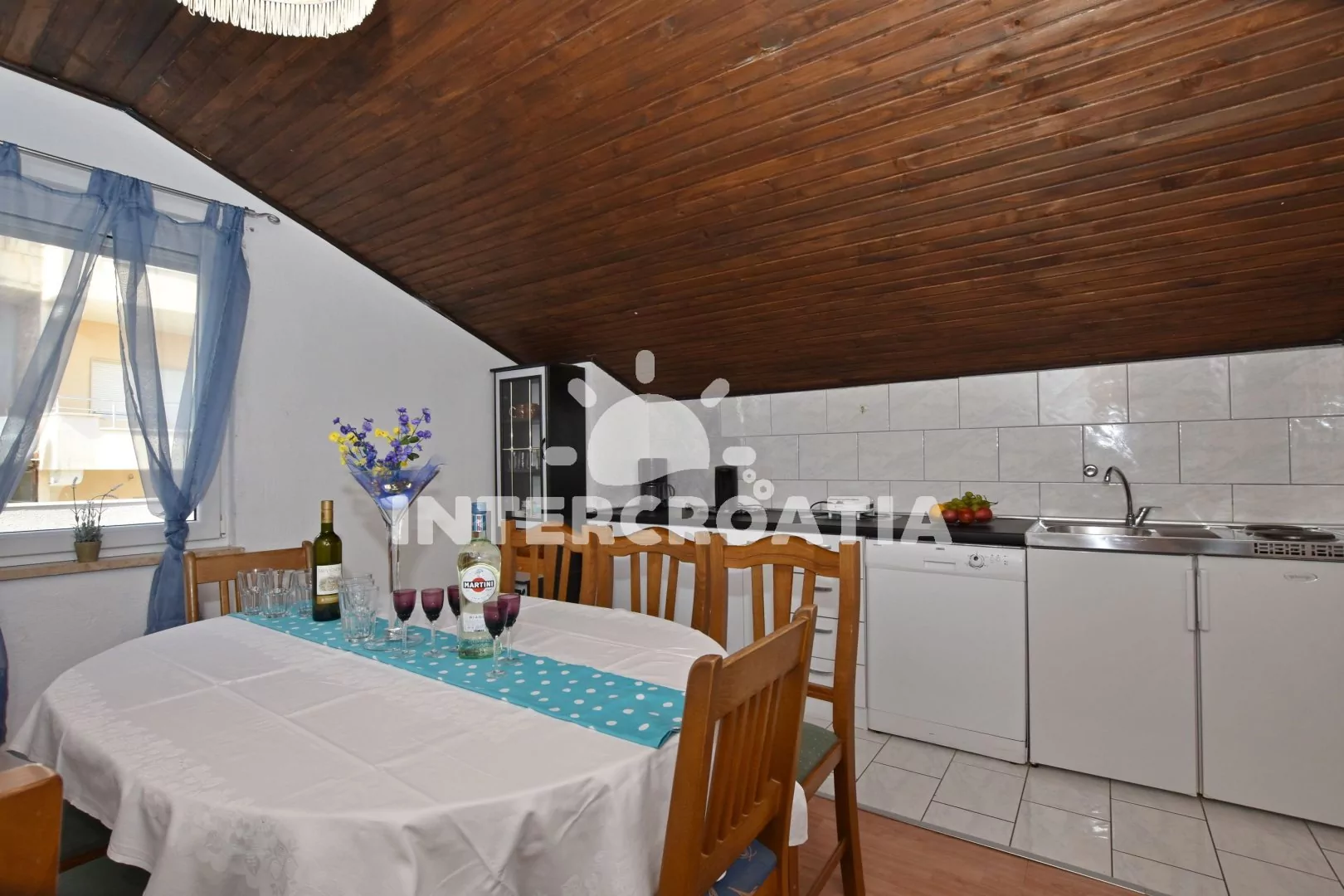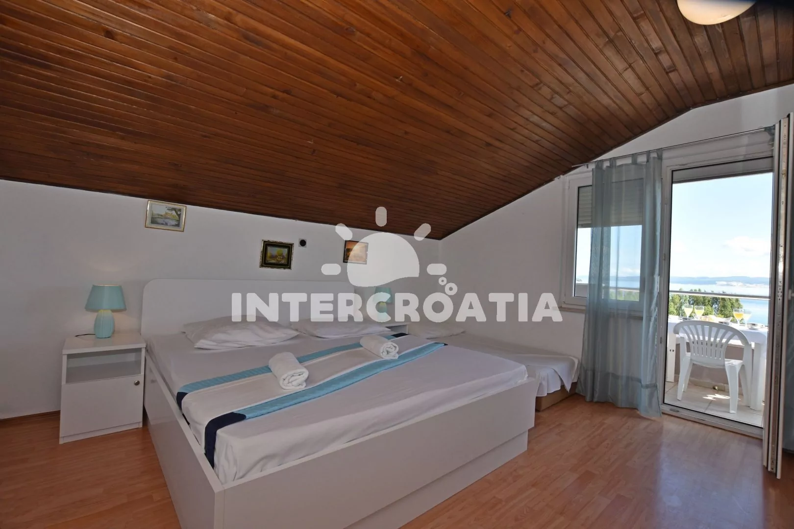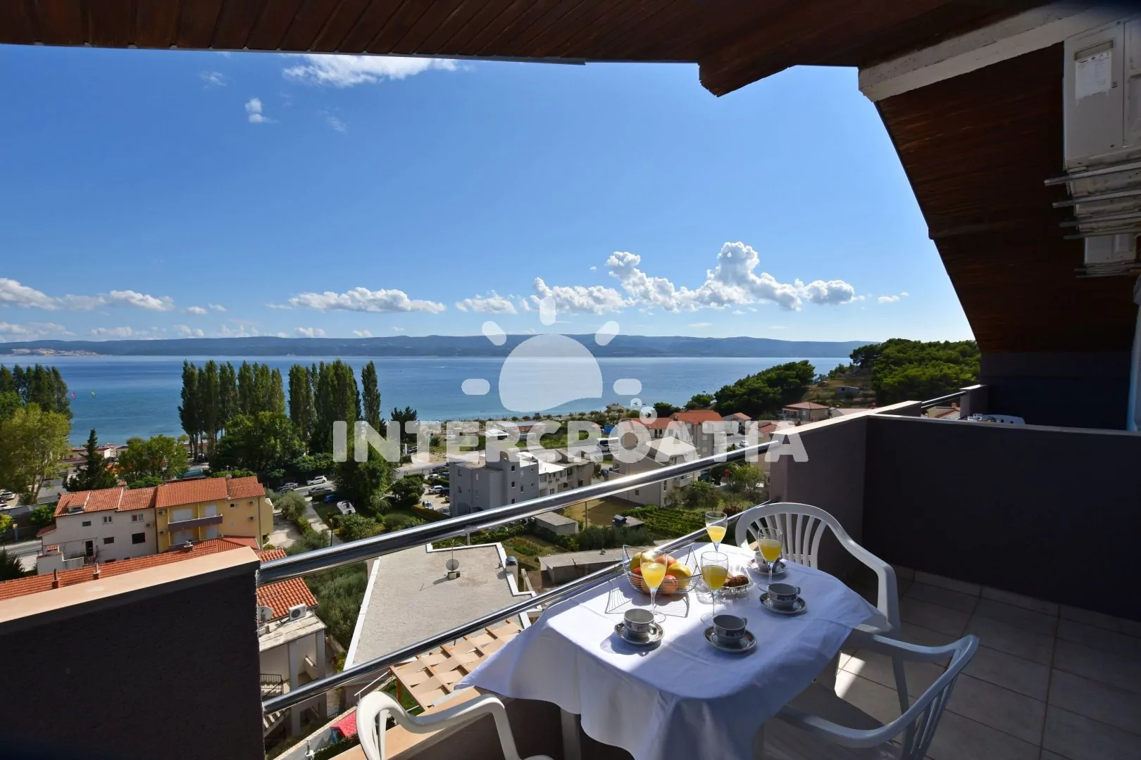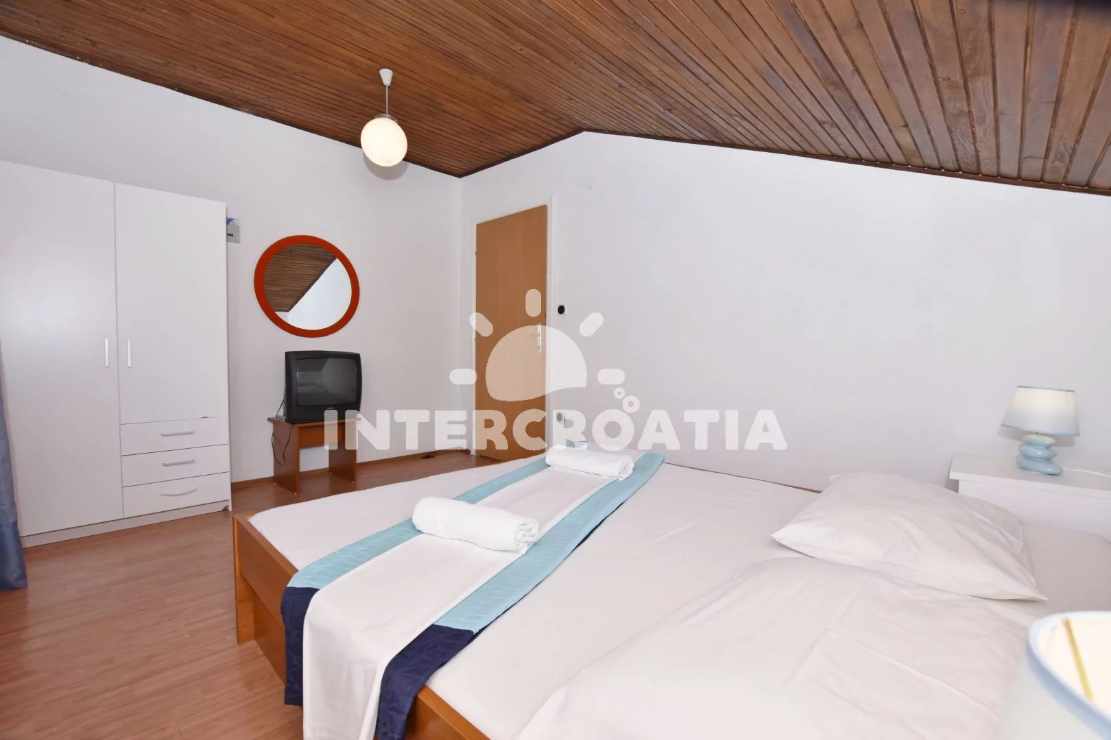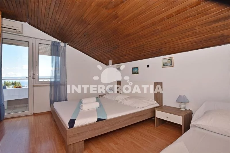 Rozlehlý apartmán v druhém patře domu s dvěma balkony, terasou a výhledem na moře. Nabízí ubytování pro 6 až 8 osob. Samostatná kuchyň a obývací pokoj. Kuchyňská linka s elektrickým dvouplotýnkovým sporákem, myčkou na nádobí, rychlovarnou konvicí, kávovarem, toustovačem, nádobím a chladničkou s mrazákem. Jídelní stůl pro 8 osob. Obývací pokoj s rozložitelnou pohovkou (extra lůžko pro 2 osoby), televizí a klimatizací. Apatmán disponuje třemi ložnicemi. Ložnice jsou klimatizované a vybaveny vždy s jedním dvoulůžkem. První a druhá ložnice má vstup na balkon s výhledem na moře. První koupelna se sprchovým koutem a umyvadlem. Samostatná toaleta s umyvadlem. Druhá koupelna s vanou, umyvadlem a wc. Hostům je k dispozici parkování u objektu zdarma (pouze po předchozí dohodě s agenturou).