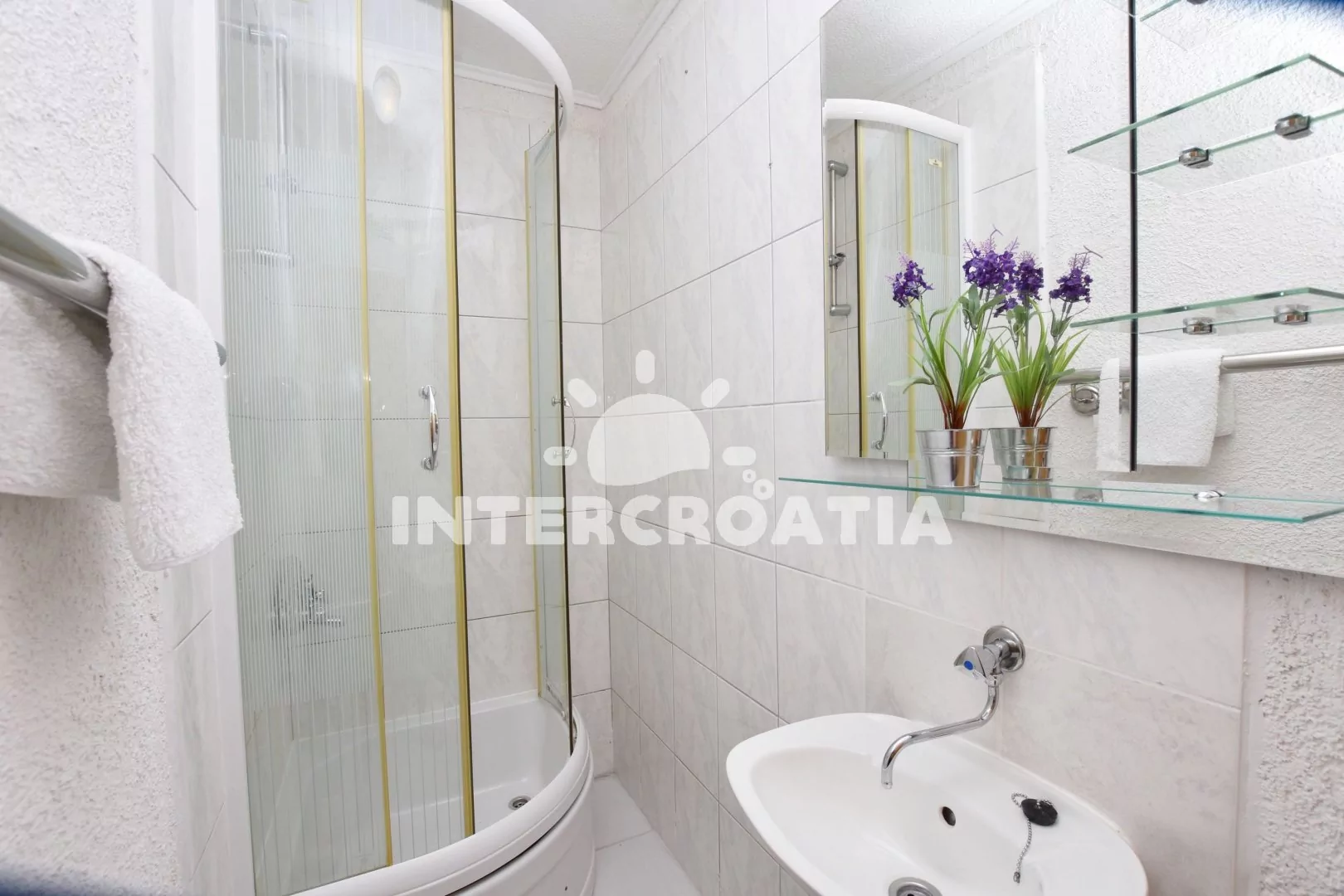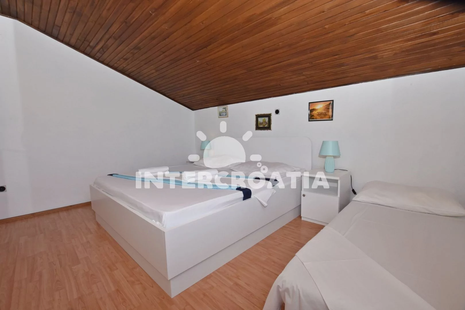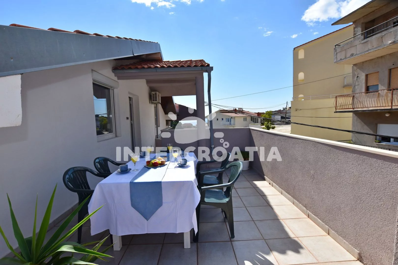 Rozlehlý apartmán v druhém patře domu s dvěma balkony, terasou a výhledem na moře. Nabízí ubytování pro 6 až 8 osob. Samostatná kuchyň a obývací pokoj. Kuchyňská linka s elektrickým dvouplotýnkovým sporákem, myčkou na nádobí, rychlovarnou konvicí, kávovarem, toustovačem, nádobím a chladničkou s mrazákem. Jídelní stůl pro 8 osob. Obývací pokoj s rozložitelnou pohovkou (extra lůžko pro 2 osoby), televizí a klimatizací. Apatmán disponuje třemi ložnicemi. Ložnice jsou klimatizované a vybaveny vždy s jedním dvoulůžkem. První a druhá ložnice má vstup na balkon s výhledem na moře. První koupelna se sprchovým koutem a umyvadlem. Samostatná toaleta s umyvadlem. Druhá koupelna s vanou, umyvadlem a wc. Hostům je k dispozici parkování u objektu zdarma (pouze po předchozí dohodě s agenturou).