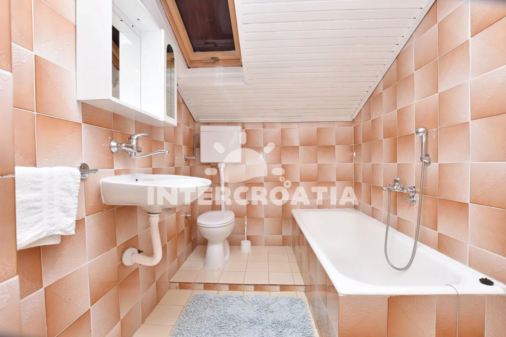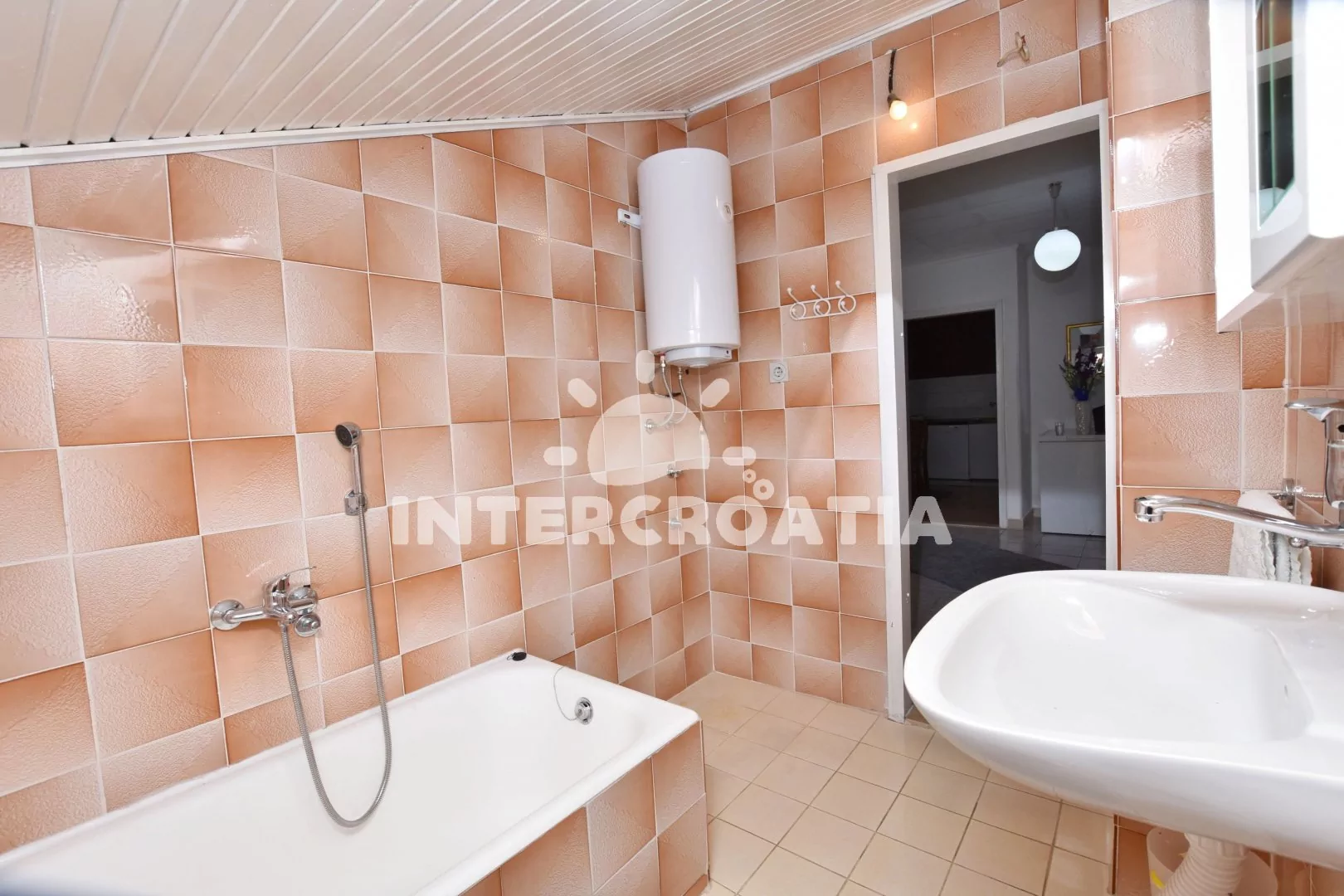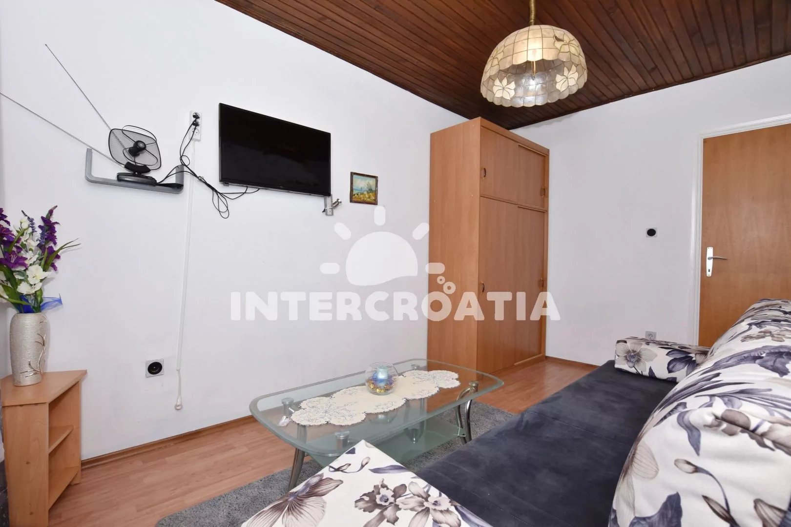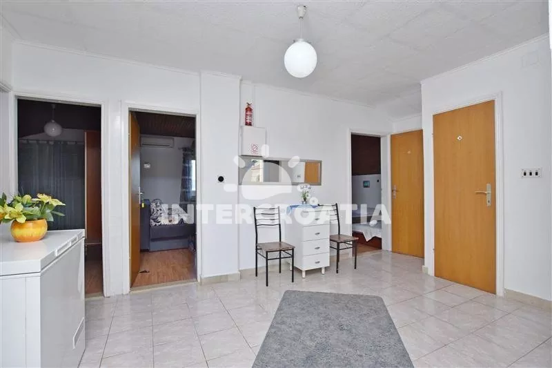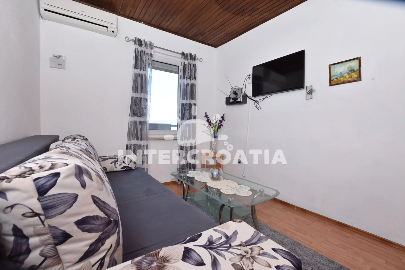 Rozlehlý apartmán v druhém patře domu s dvěma balkony, terasou a výhledem na moře. Nabízí ubytování pro 6 až 8 osob. Samostatná kuchyň a obývací pokoj. Kuchyňská linka s elektrickým dvouplotýnkovým sporákem, myčkou na nádobí, rychlovarnou konvicí, kávovarem, toustovačem, nádobím a chladničkou s mrazákem. Jídelní stůl pro 8 osob. Obývací pokoj s rozložitelnou pohovkou (extra lůžko pro 2 osoby), televizí a klimatizací. Apatmán disponuje třemi ložnicemi. Ložnice jsou klimatizované a vybaveny vždy s jedním dvoulůžkem. První a druhá ložnice má vstup na balkon s výhledem na moře. První koupelna se sprchovým koutem a umyvadlem. Samostatná toaleta s umyvadlem. Druhá koupelna s vanou, umyvadlem a wc. Hostům je k dispozici parkování u objektu zdarma (pouze po předchozí dohodě s agenturou).