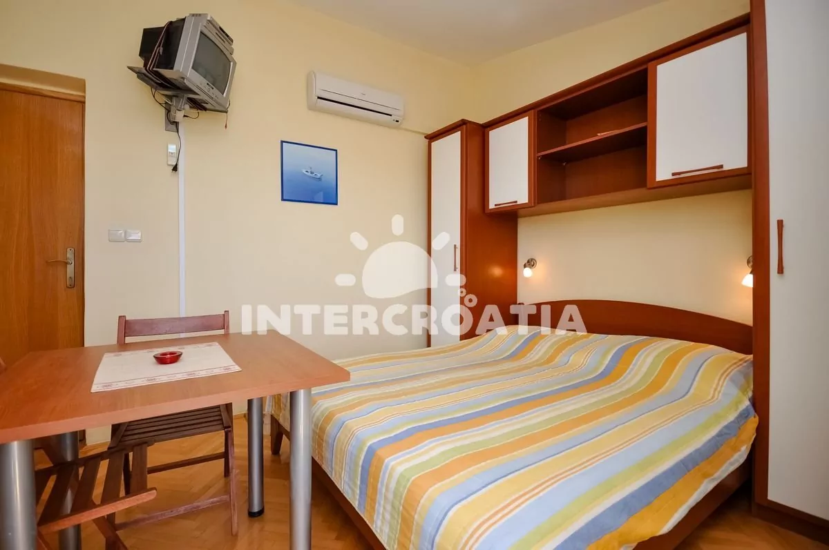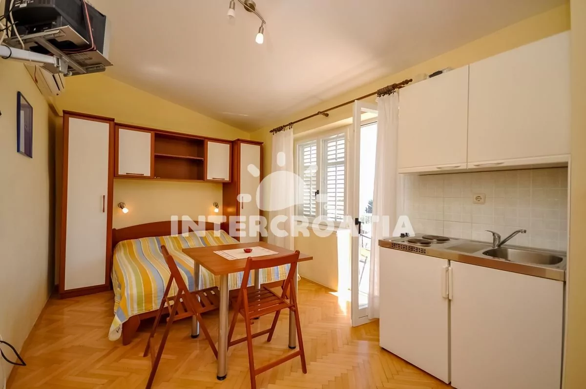 Apartmán typu studio s lodžií a výhledem na moře, se nachází v druhém patře a je vhodný pro 2 osoby. Obývací místnost je spojena s kuchyní. Kuchyňská linka je vybavena dvouplotýnkovým sporákem, rychlovarnou konvicí, nádobím a chladničkou. Obývací místnost s jídelním stolem pro 2 osoby, televizí se satelitním programem, jedním dvoulůžkem, klimatizací a vstupem na balkon. Koupelna se sprchovým koutem, umyvadlem a wc. Hostům je k dispozici parkování u objektu zdarma.