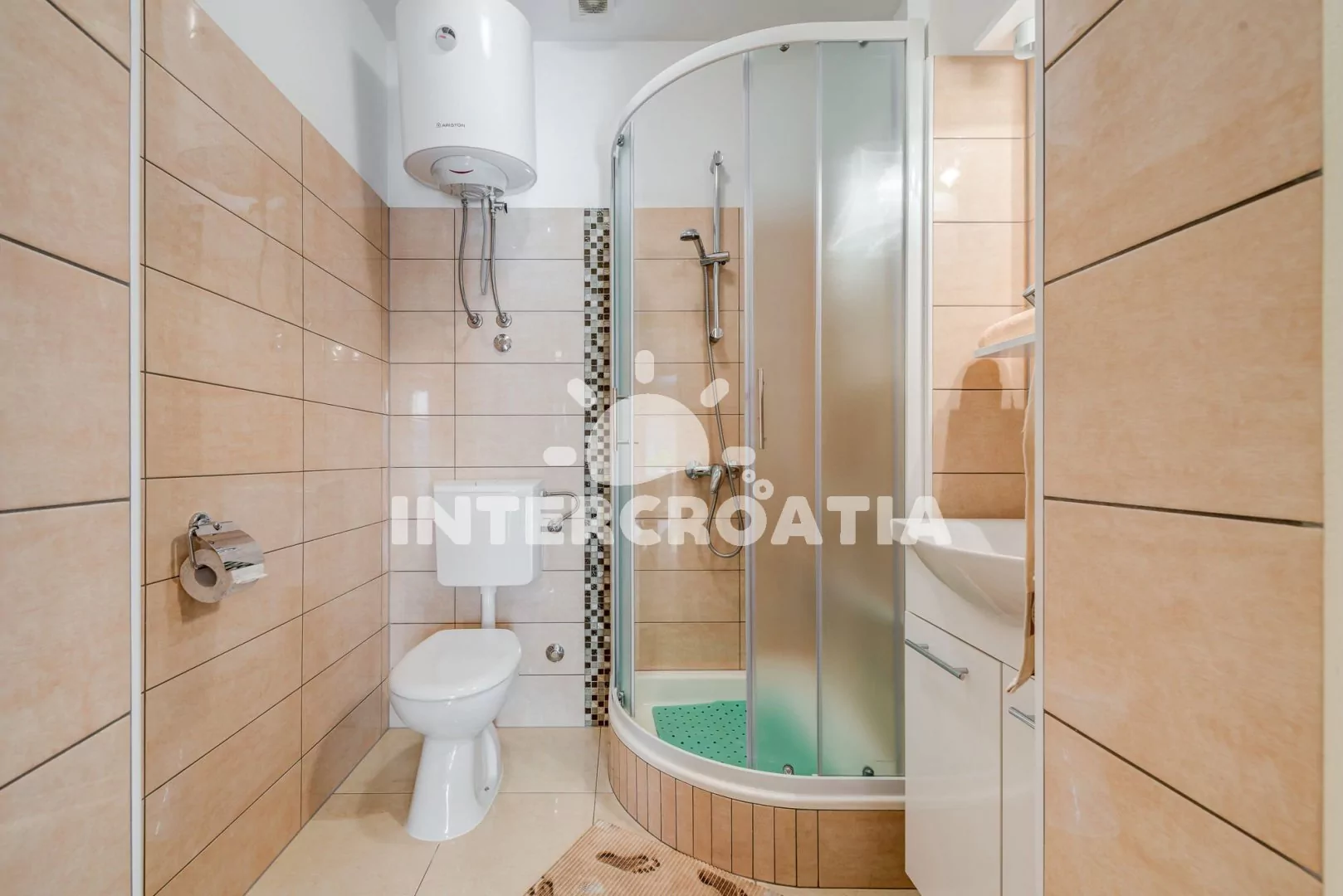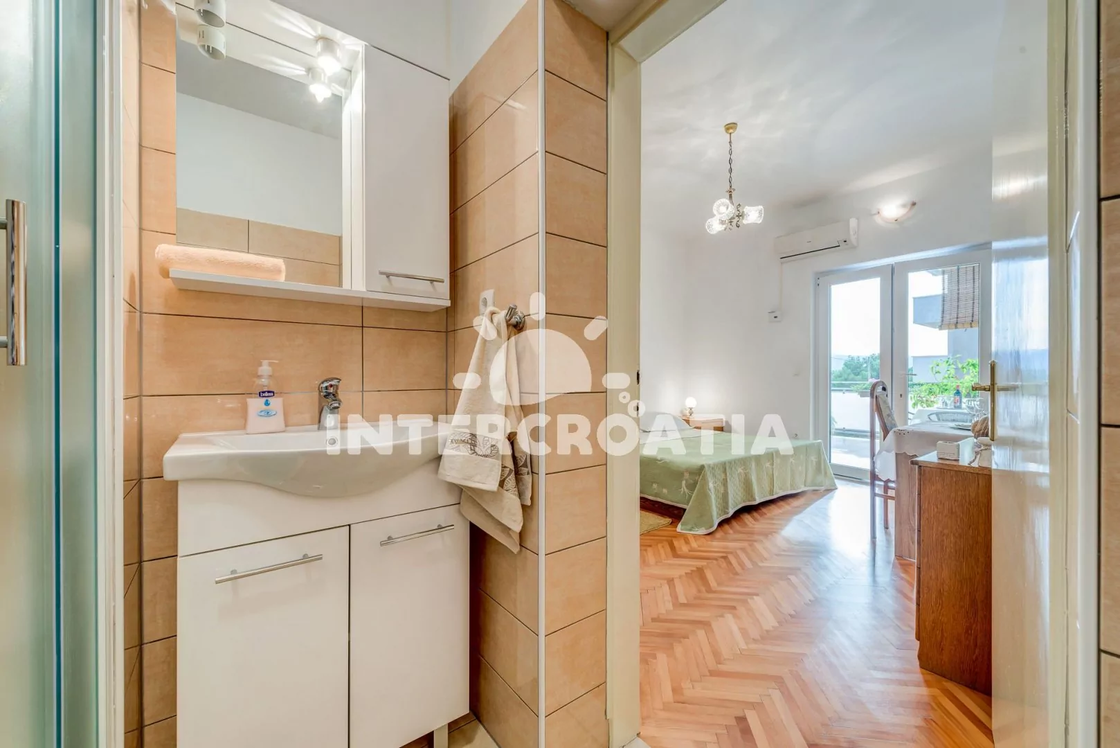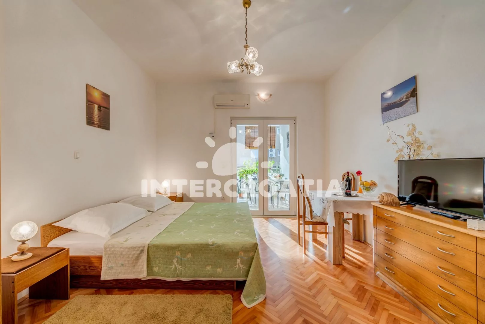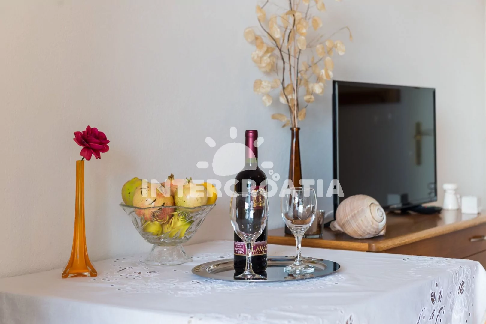 Hezky zařízený apartmán typu studio s terasou a výhledem na moře, se nachází v přízemí domu a je vhodný pro 2 osoby. Obývací místnost je spojena s kuchyní. Kuchyňská linka je vybavena dvouplotýnkovým sporákem, digestoří, mikrovlnnou troubou, rychlovarnou konvicí, nádobím a lednicí s mrazákem. Obývací místnost s jídelním stolem, televizí, jedním dvoulůžkem, klimatizací a vstupem na terasu. Koupelna se sprchovým koutem, umyvadlem a wc. Hostům je k dispozici parkování u objektu zdarma.