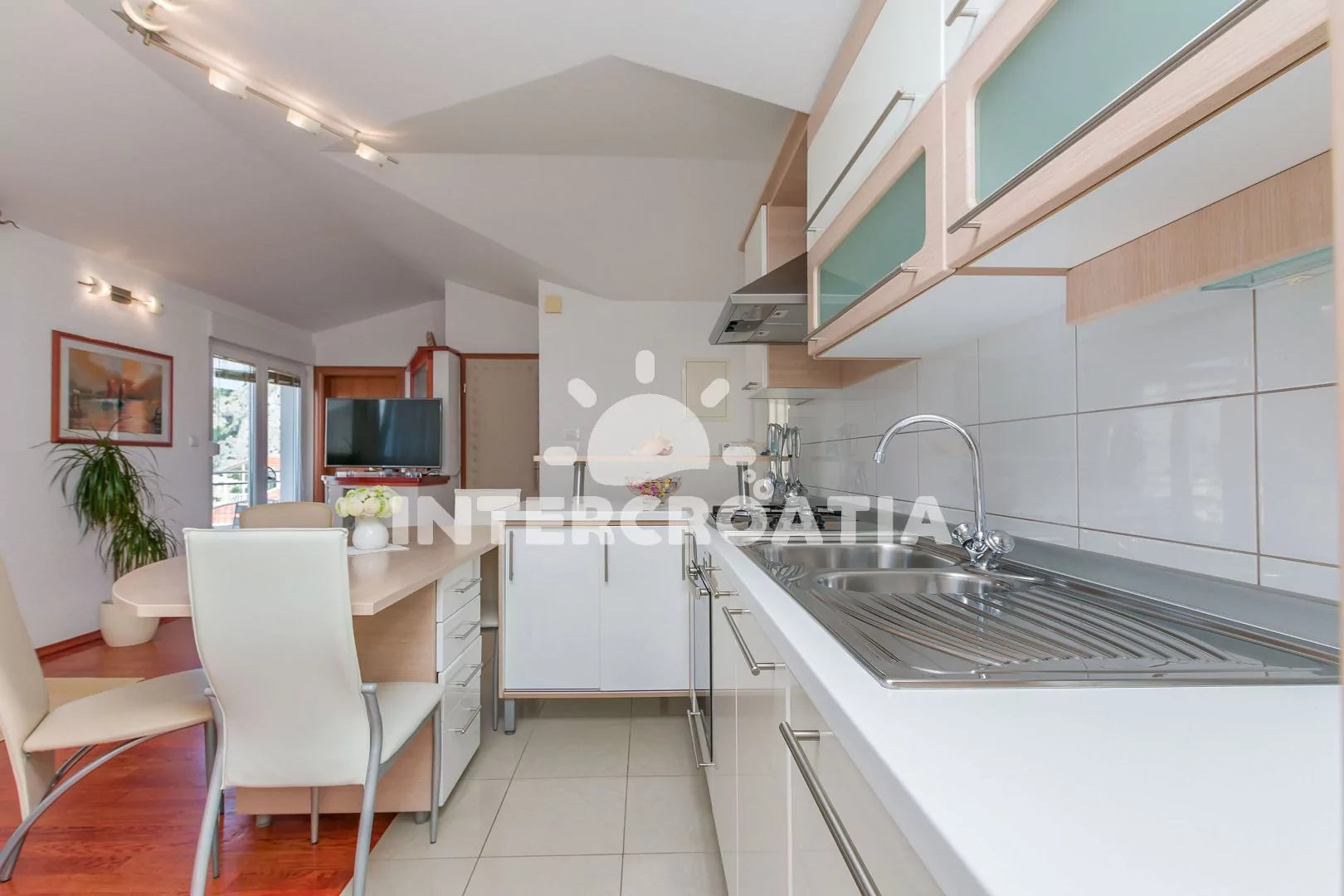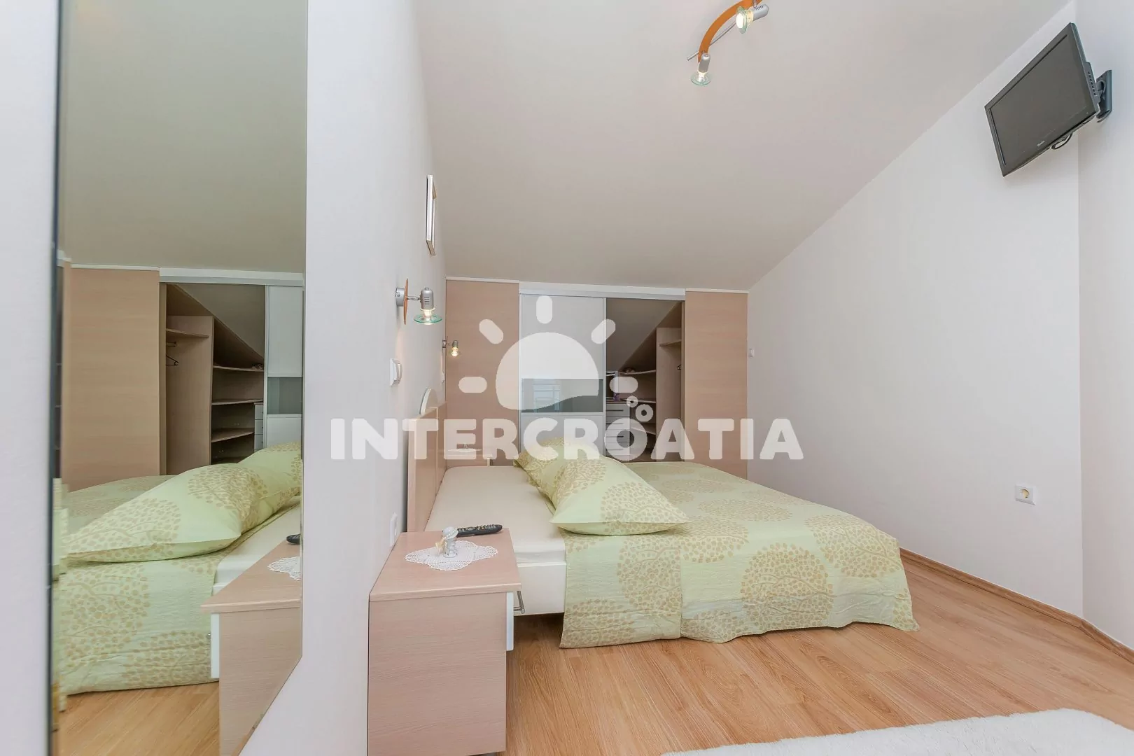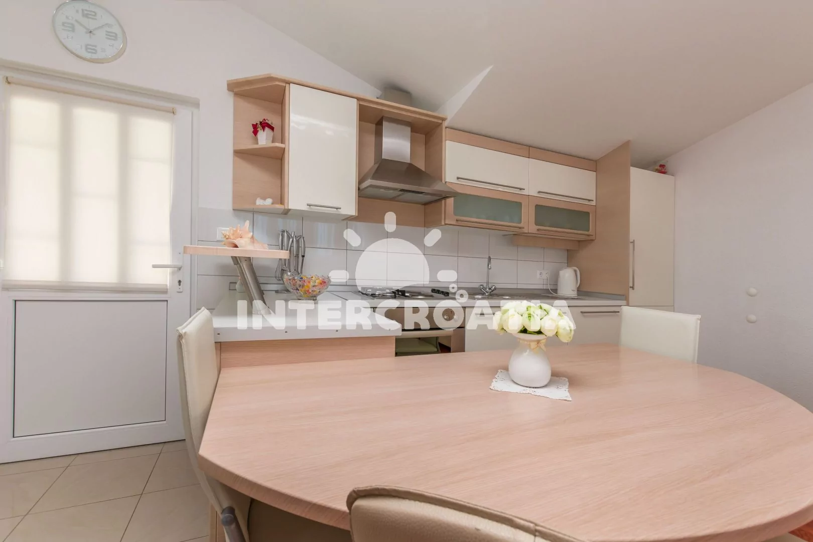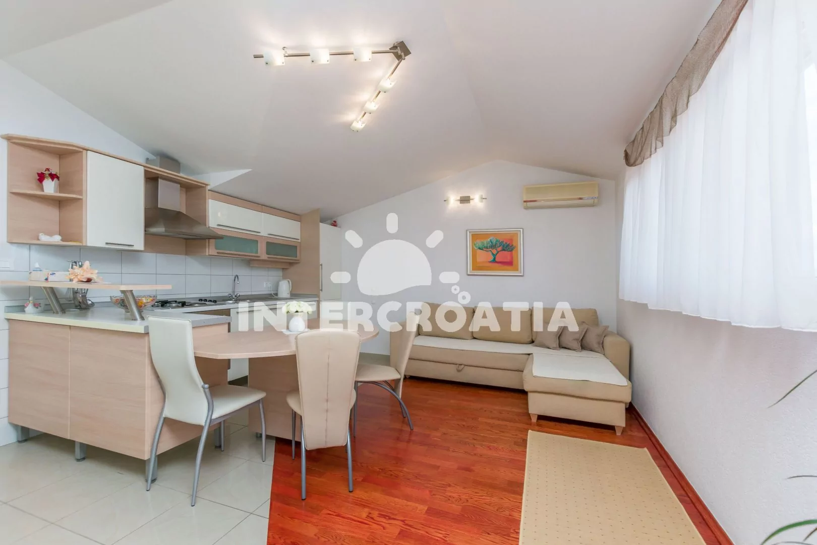 Podkrovní apartmán (45 m2) s balkonem, venkovním posezením a výhledem na moře je vhodný pro 2 až 4 osoby. Obývací pokoj je spojený s kuchyní. Kuchyňská linka je vybavena varnou deskou, digestoří, vestavěnou troubou, mikrovlnnou troubou, rychlovarnou konvicí, nádobím a lednicí s mrazákem. Obývací pokoj s jídelním stolem pro 3 osoby, pohovkou (rozložitelná na extra lůžko pro 2 osoby), televizí se satelitním programem, klimatizací a vstupem na balkon. Ložnice s dvoulůžkem a vstupem na balkon. Koupelna se sprchovým koutem, umyvadlem, pračkou a wc. Hostům je k dispozici parkování u objektu zdarma.