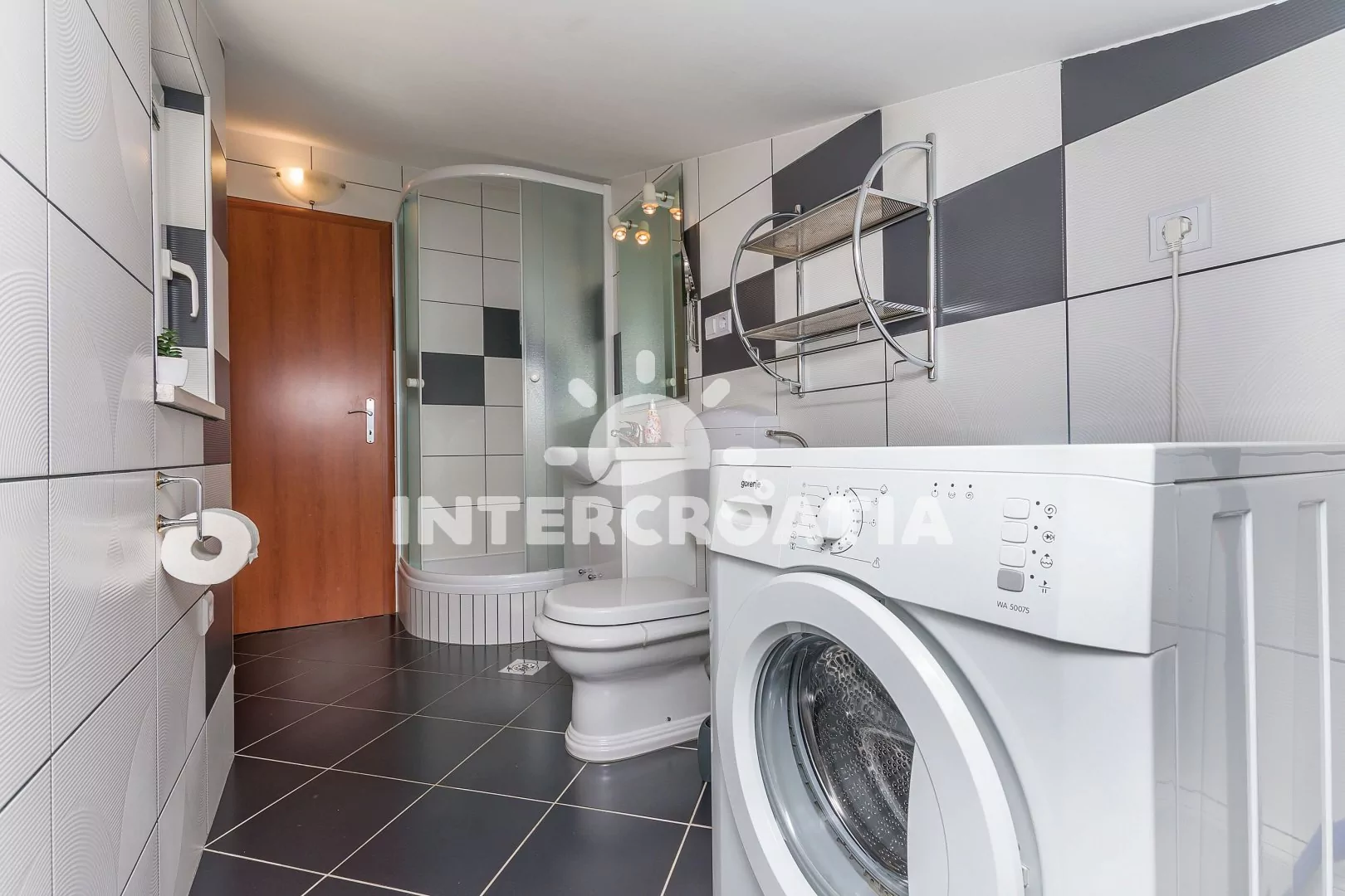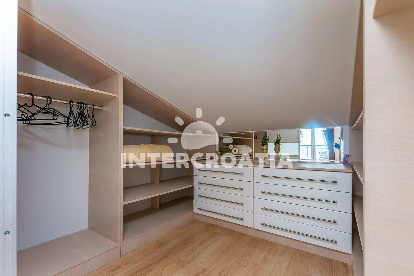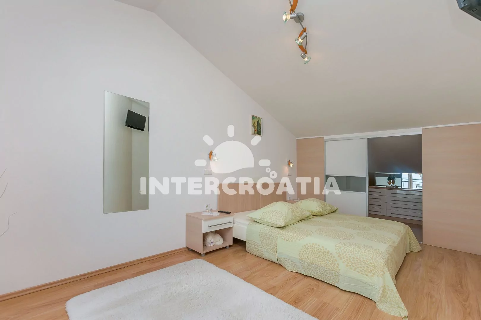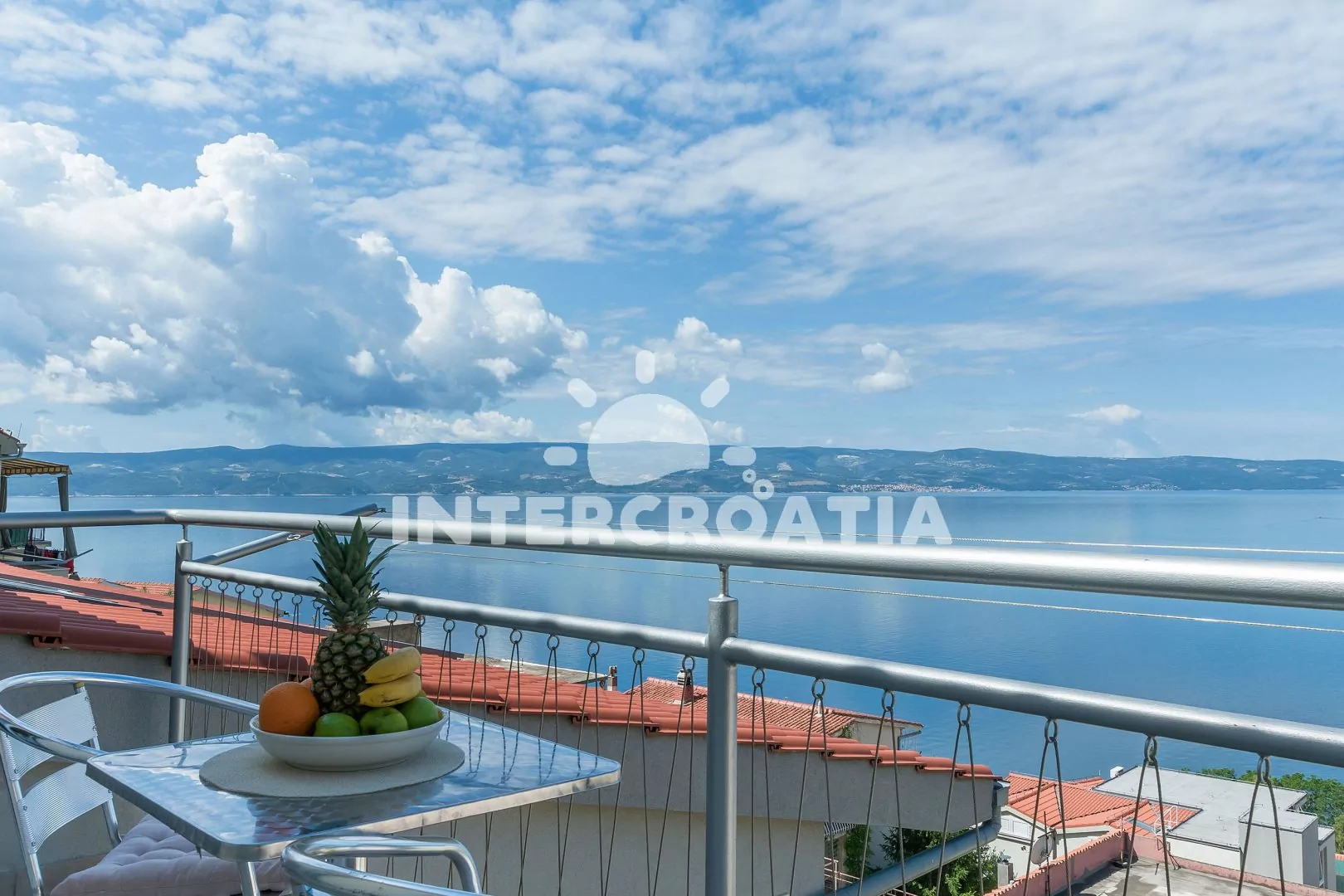 Podkrovní apartmán (45 m2) s balkonem, venkovním posezením a výhledem na moře je vhodný pro 2 až 4 osoby. Obývací pokoj je spojený s kuchyní. Kuchyňská linka je vybavena varnou deskou, digestoří, vestavěnou troubou, mikrovlnnou troubou, rychlovarnou konvicí, nádobím a lednicí s mrazákem. Obývací pokoj s jídelním stolem pro 3 osoby, pohovkou (rozložitelná na extra lůžko pro 2 osoby), televizí se satelitním programem, klimatizací a vstupem na balkon. Ložnice s dvoulůžkem a vstupem na balkon. Koupelna se sprchovým koutem, umyvadlem, pračkou a wc. Hostům je k dispozici parkování u objektu zdarma.