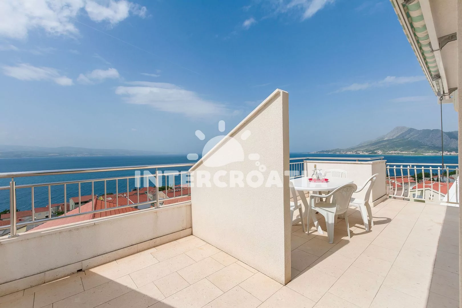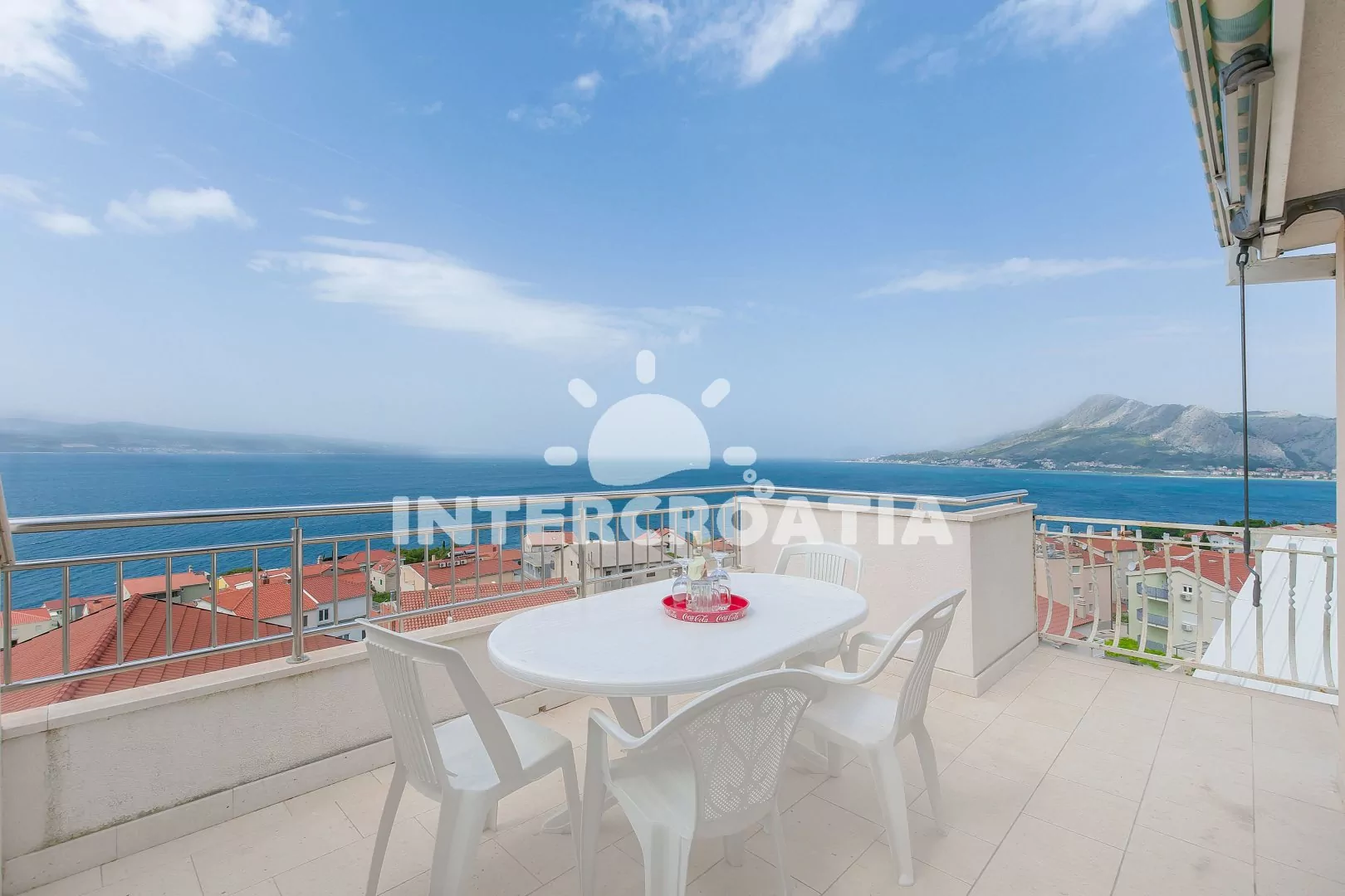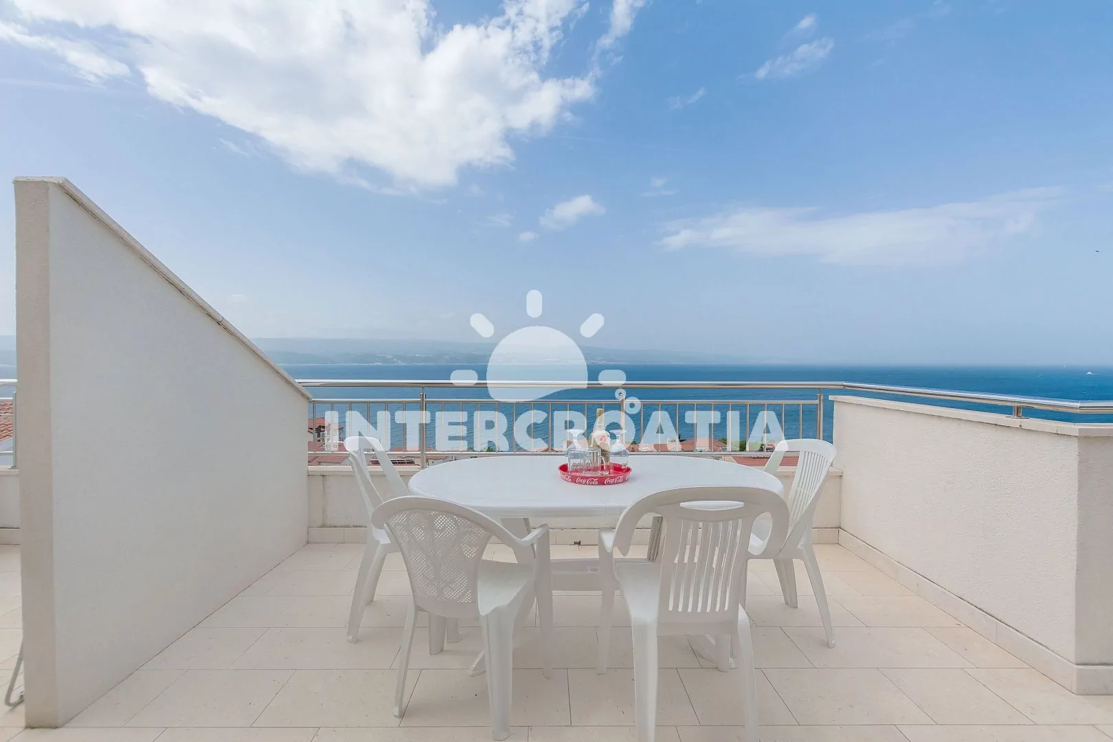 Apartmán (40 m2) se společnou terasou, posezením a jedinečným výhledem na moře se nachází ve 3. patře domu. Apartmán má 1 ložnici a je vhodný pro až 4 osoby. Obývací pokoj je spojený s kuchyní. Kuchyňská linka je vybavena dvouplotýnkovým vařičem, digestoří, mikrovlnnou troubou, rychlovarnou konvicí, kávovarem, nádobím a lednicí s mrazákem. Obývací pokoj s jídelním stolem, pohovkou (rozložitelná na extra lůžko pro 2 osoby), televizí se satelitním programem, klimatizací a vstupem na terasu. Ložnice s jedním dvoulůžkem. Koupelna se sprchovým koutem, umyvadlem, fénem a wc. Hostům je k dispozici parkování u objektu zdarma.