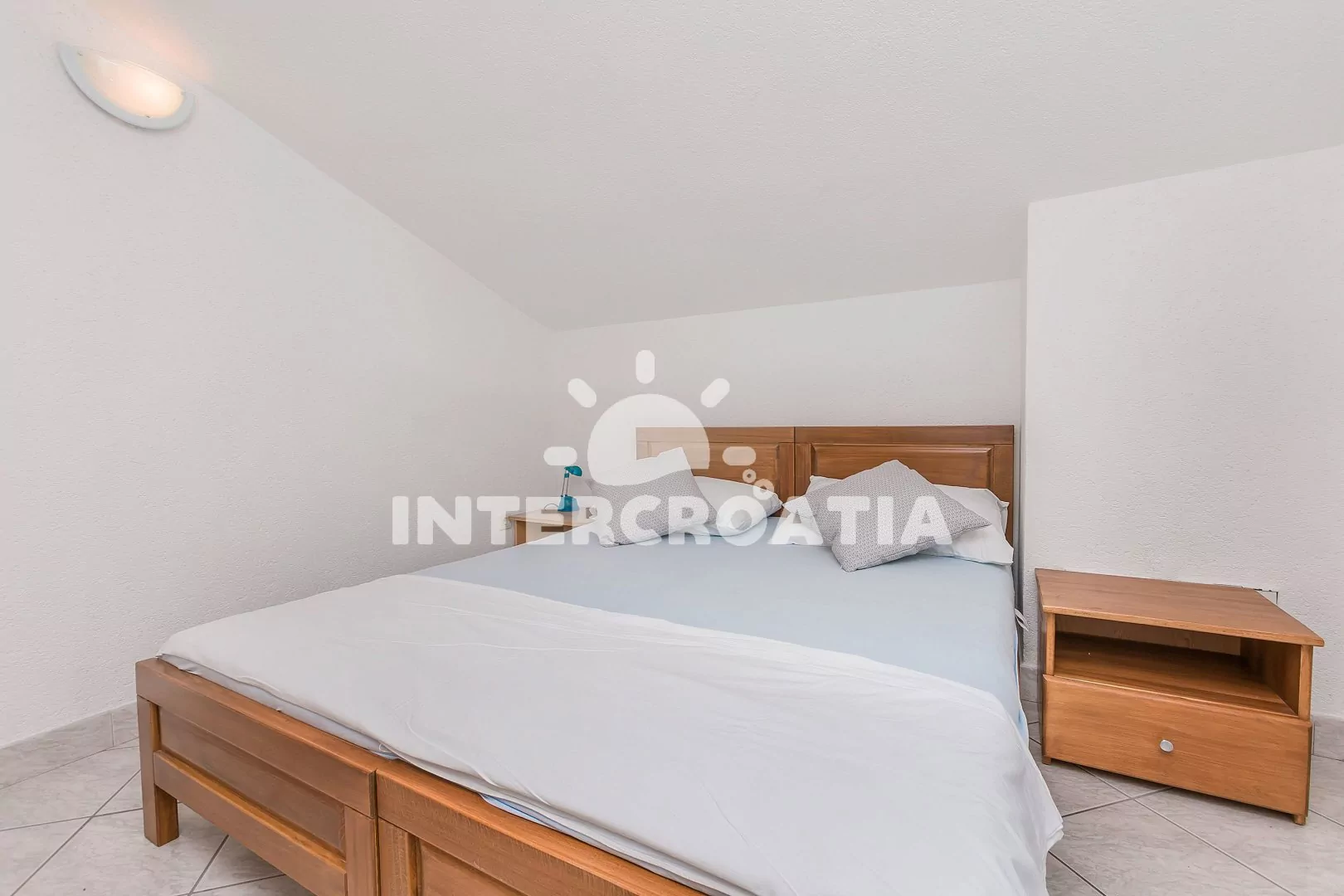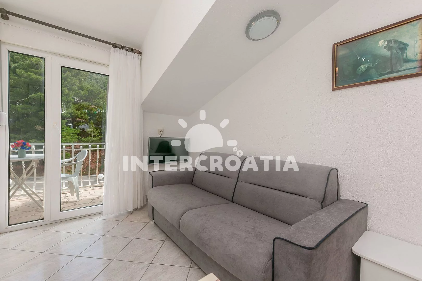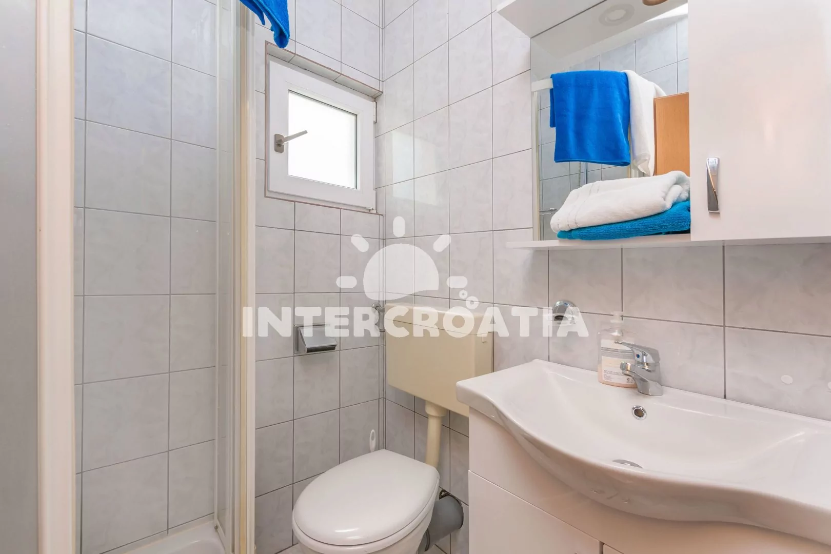 Apartmán (30 m2) s vlastním balkonem a společnou terasou s posezením a jedinečným výhledem na moře. Apartmán se nachází ve 3. patře domu, má 1 ložnici a je vhodný pro 2 až 4 osoby. Obývací pokoj je spojený s kuchyní. Kuchyňská linka je vybavena dvouplotýnkovým vařičem, digestoří, mikrovlnnou troubou, rychlovarnou konvicí, kávovarem, nádobím a lednicí s mrazákem. Obývací pokoj s jídelním stolem, pohovkou (rozložitelná na extra lůžko pro 2 osoby), televizí se satelitním programem, klimatizací a vstupem na balkon. Ložnice s jedním dvoulůžkem. Koupelna se sprchovým koutem, umyvadlem, fénem a wc. Hostům je k dispozici parkování u objektu zdarma.