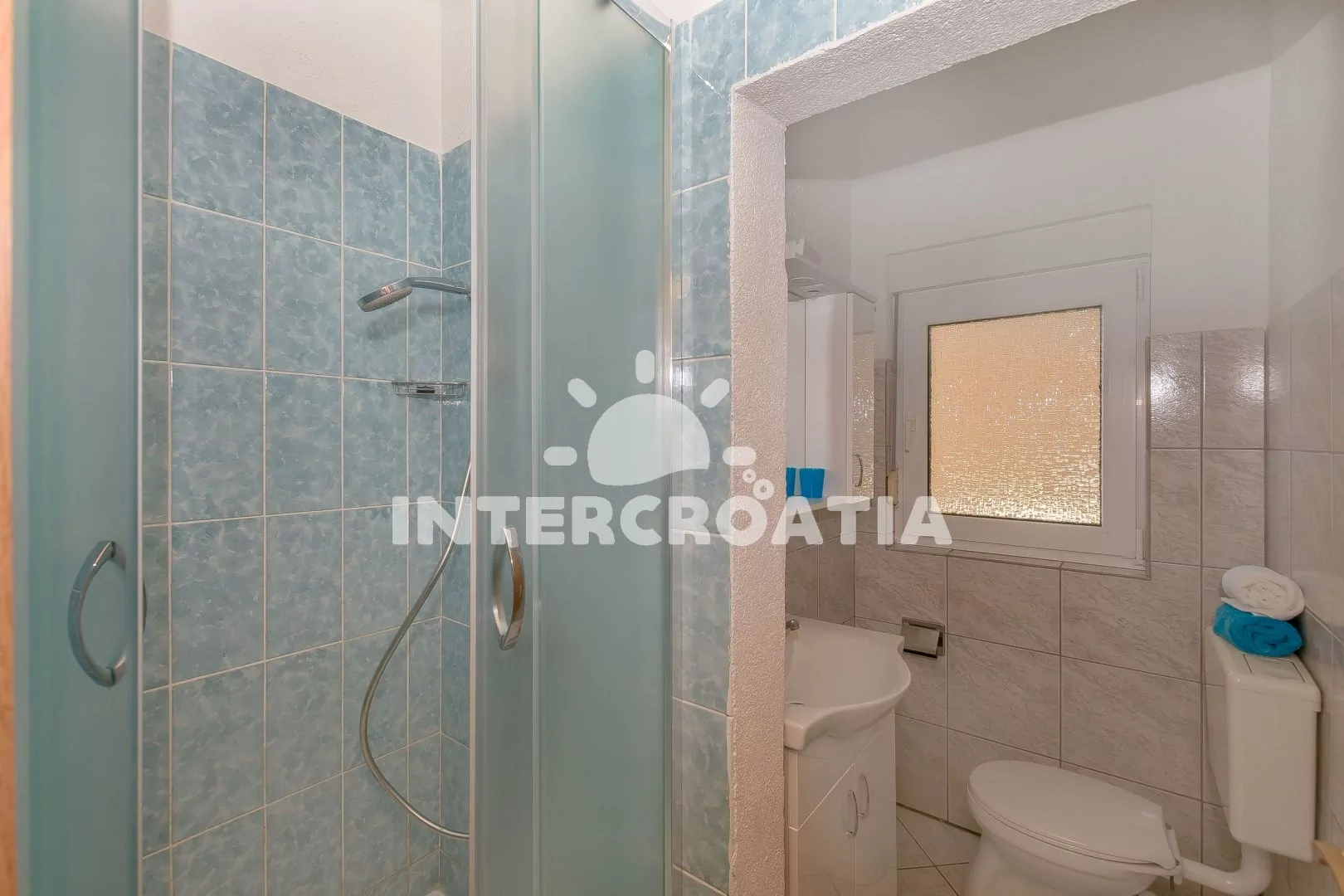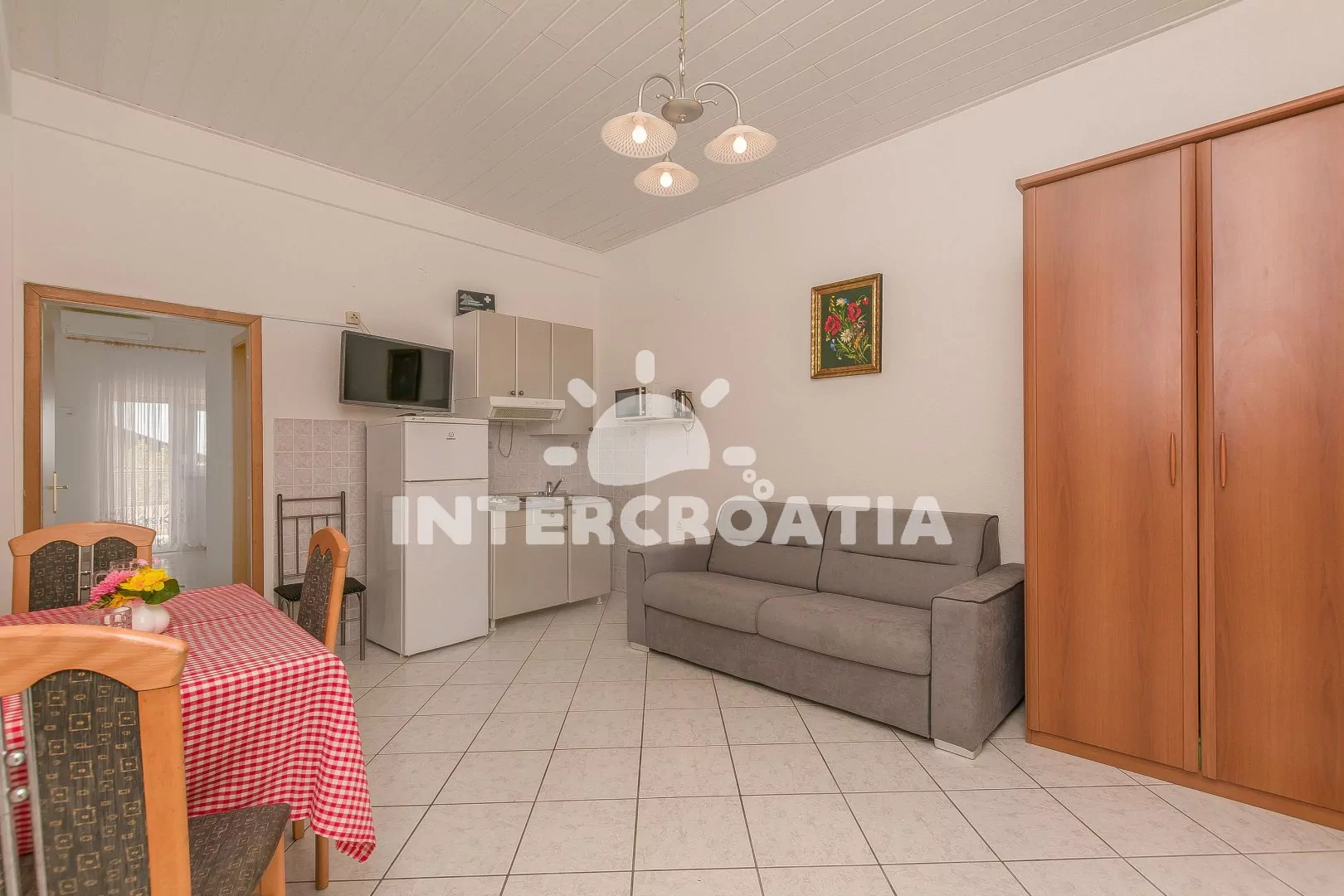 Apartmán (40 m2) s terasou, posezením a výhledem na moře se nachází v přízemí domu. Apartmán má 1 ložnici a je vhodný pro 2 až 4 osoby. Obývací pokoj je spojený s kuchyní. Kuchyňská linka je vybavena dvouplotýnkovým vařičem, digestoří, mikrovlnnou troubou, rychlovarnou konvicí, kávovarem, nádobím a lednicí s mrazákem. Obývací pokoj s jídelním stolem, pohovkou (rozložitelná na extra lůžko pro 2 osoby) a televizí se satelitním programem. Ložnice s dvoulůžkem, klimatizací a vstupem na terasu. Koupelna se sprchovým koutem, umyvadlem, fénem a wc. Hostům je k dispozici parkování u objektu zdarma.