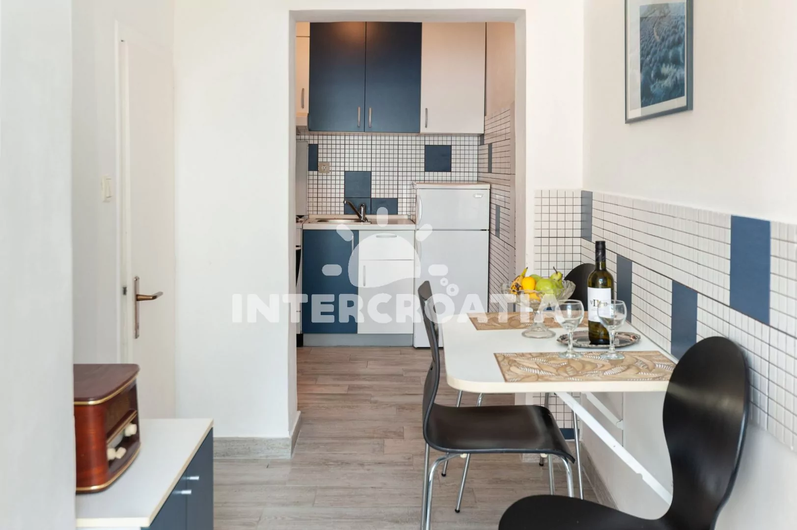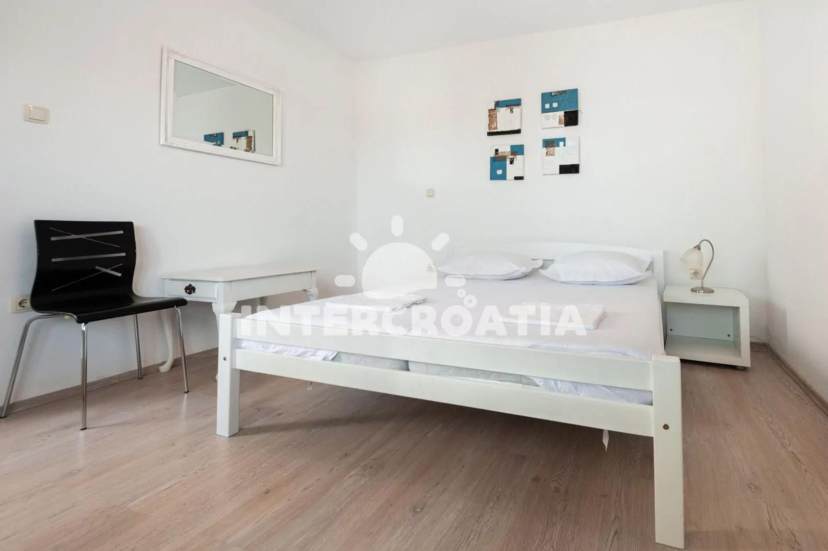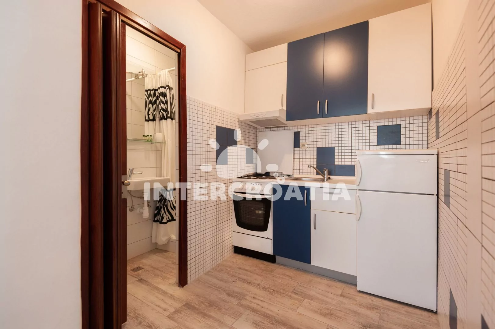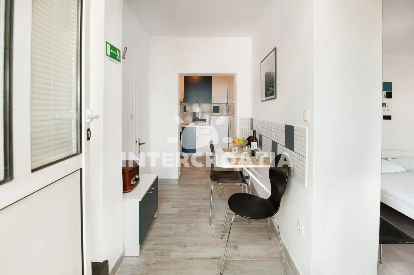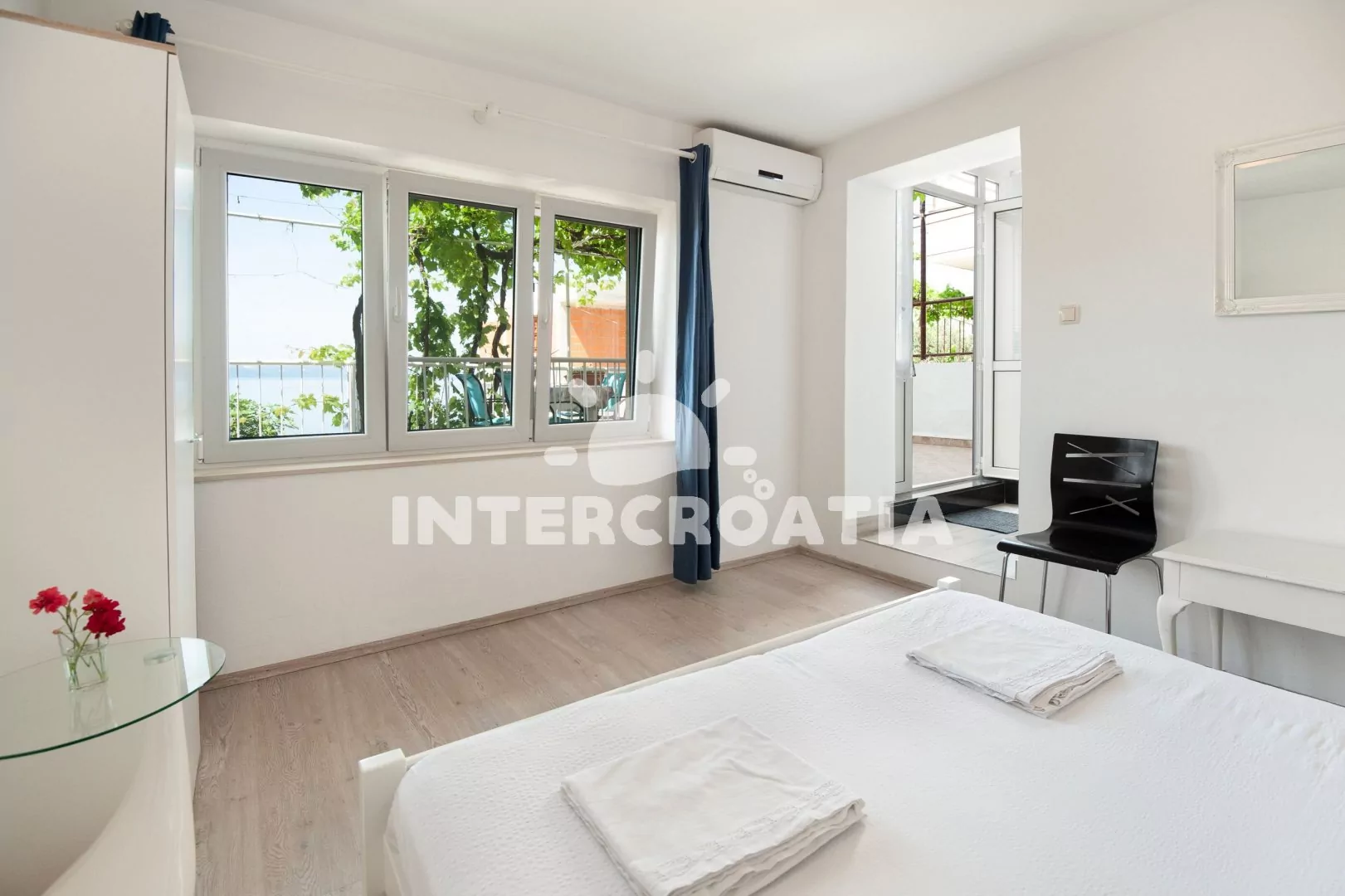 Apartmán (30 m2) s terasou, venkovním posezením a výhledem na moře se nachází ve zvýšeném přízemí domu. Apartmán má 1 ložnici a je vhodný pro 2 osoby. Kuchyňská linka je vybavena sporákem s troubou, digestoří, rychlovarnou konvicí, nádobím a lednicí s mrazákem. Dále jídelní stůl a vstup na terasu. Ložnice je částečně oddělená od kuchyně a je vybavena dvoulůžkem, šatní skříní a klimatizací. Koupelna se sprchovým koutem, umyvadlem, fénem a wc. Hostům je k dispozici parkování u objektu zdarma.