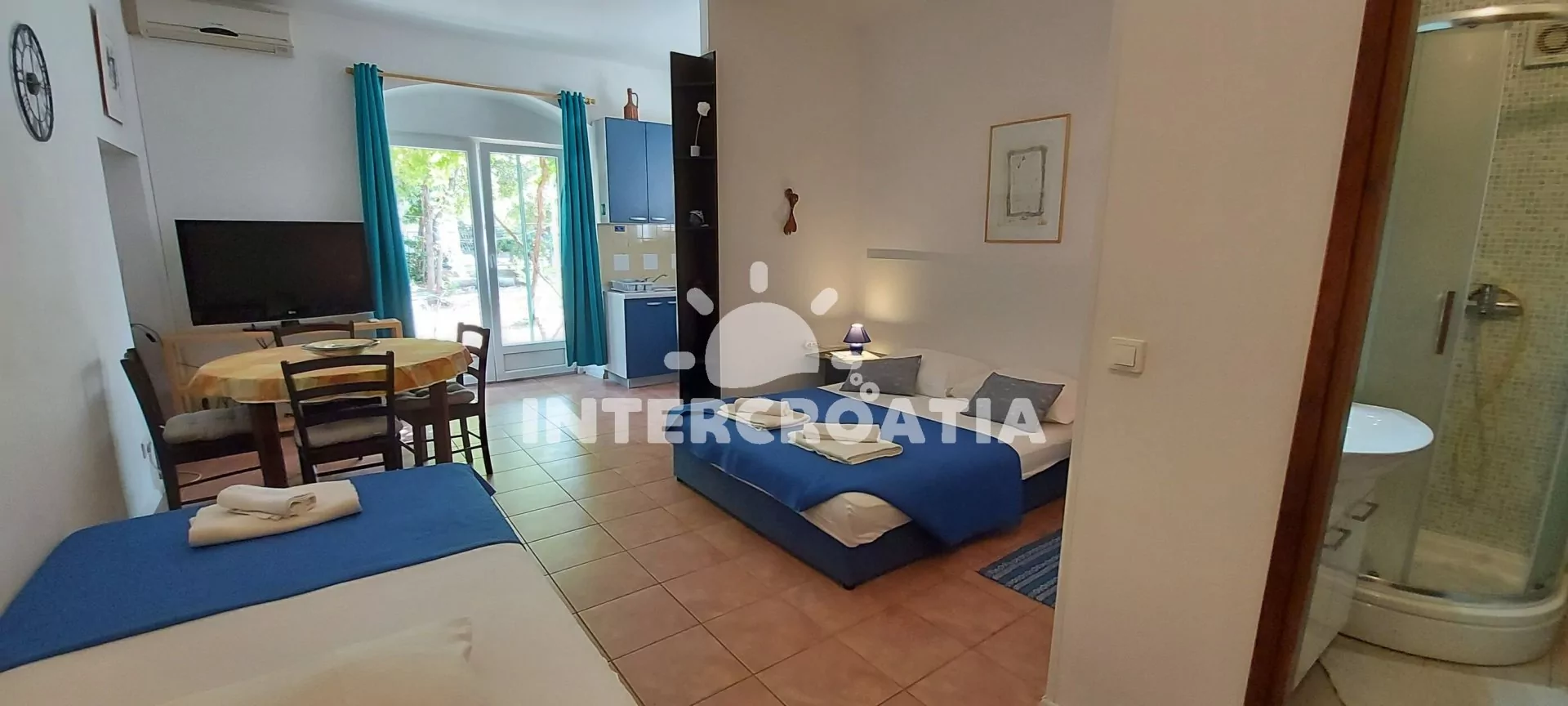 Apartmán (28 m2) typu studio se nachází v přízemí domu. Apartmán je vhodný pro 2 až 3 osoby. Obývací místnost je spojena s kuchyní. Kuchyňská linka je vybavena dvouplotýnkovým vařičem, mikrovlnnou troubou, rychlovarnou konvicí, kávovarem, nádobím a lednicí s mrazákem. Obývací místnost s jídelním stolem, přistýlkou, dvoulůžkem, televizí se satelitním programem, klimatizací a vstupem na terasu. Koupelna se sprchovým koutem, umyvadlem, fénem a wc. Hostům je k dispozici parkování u objektu zdarma.