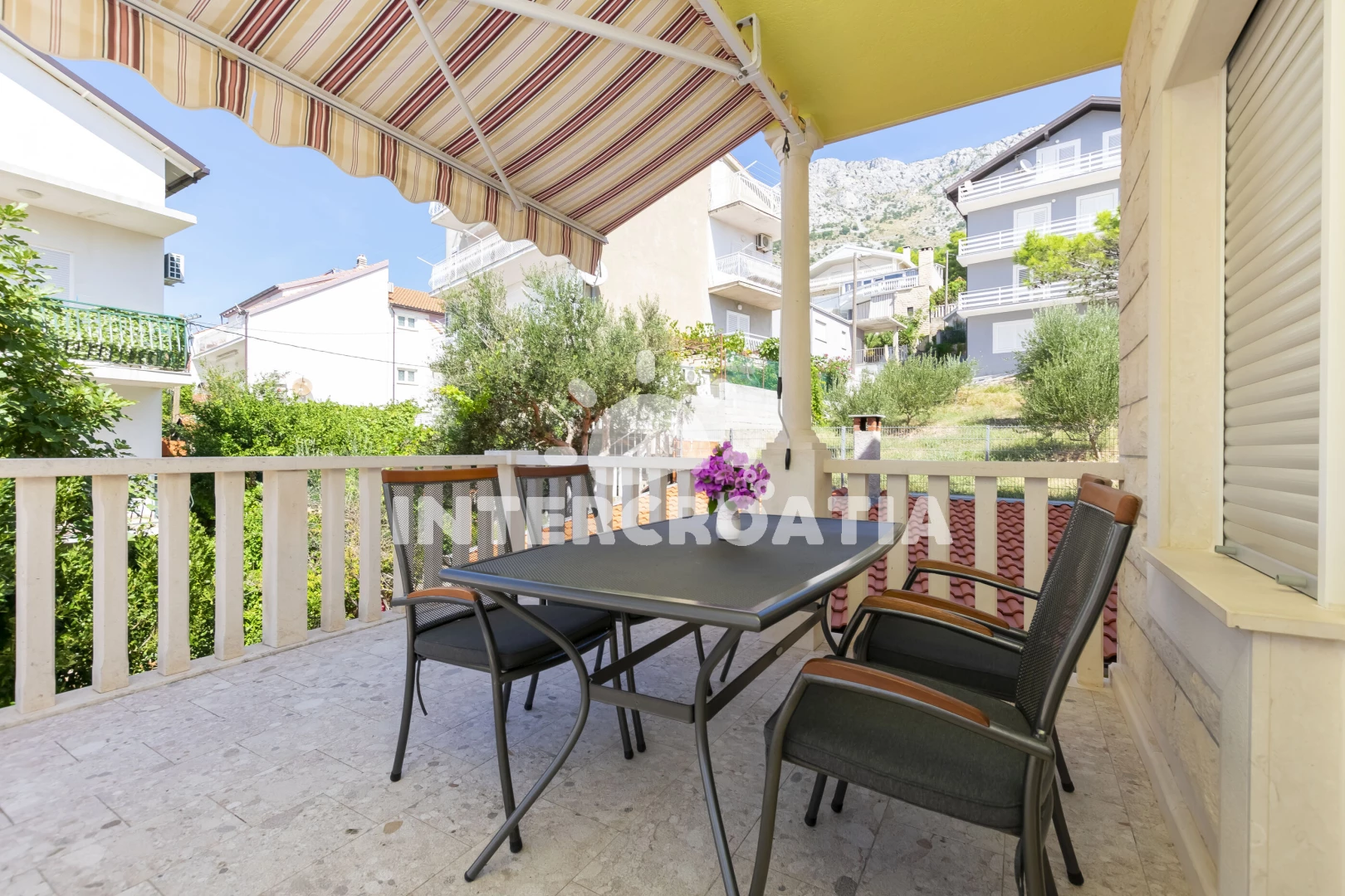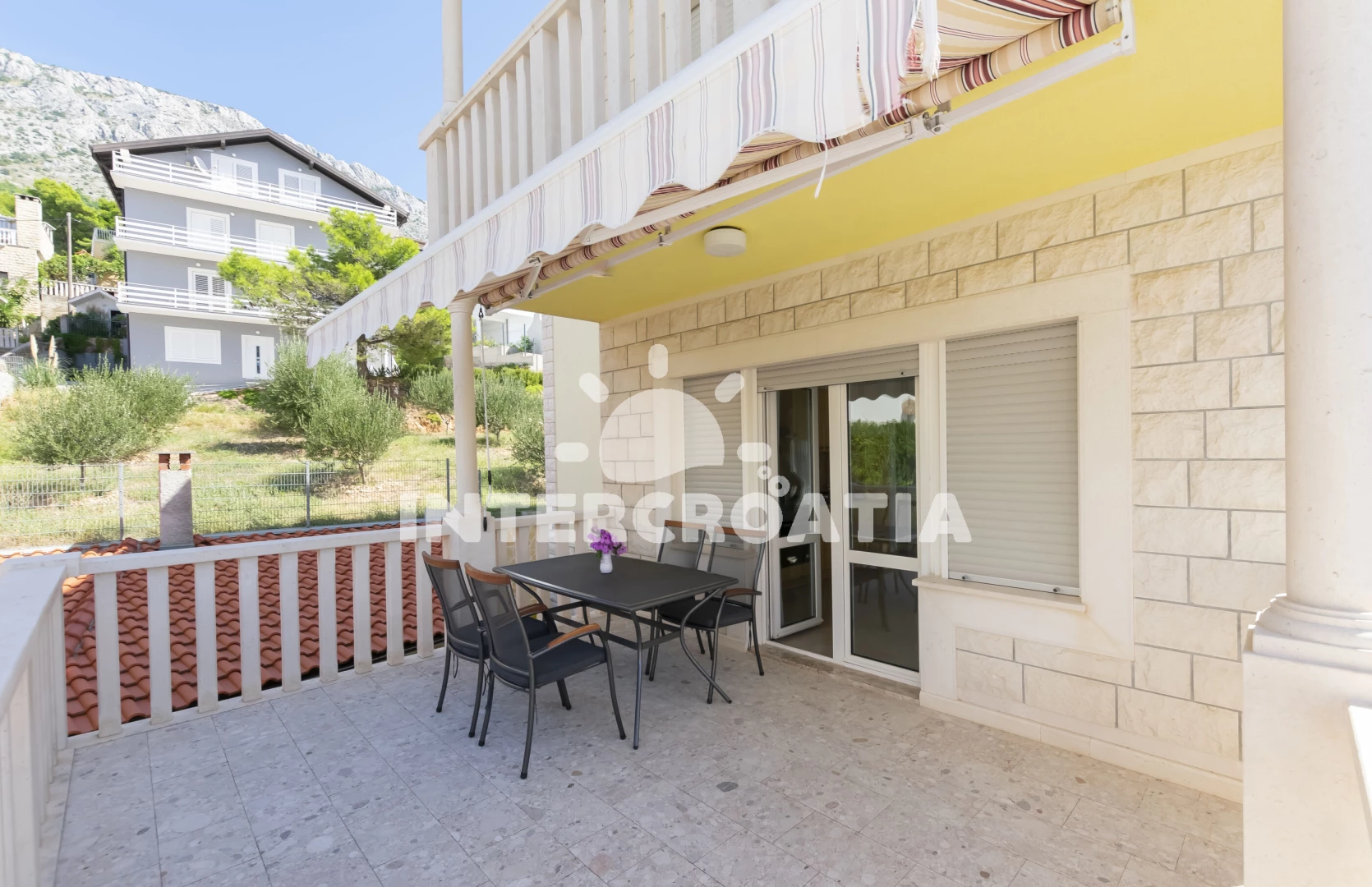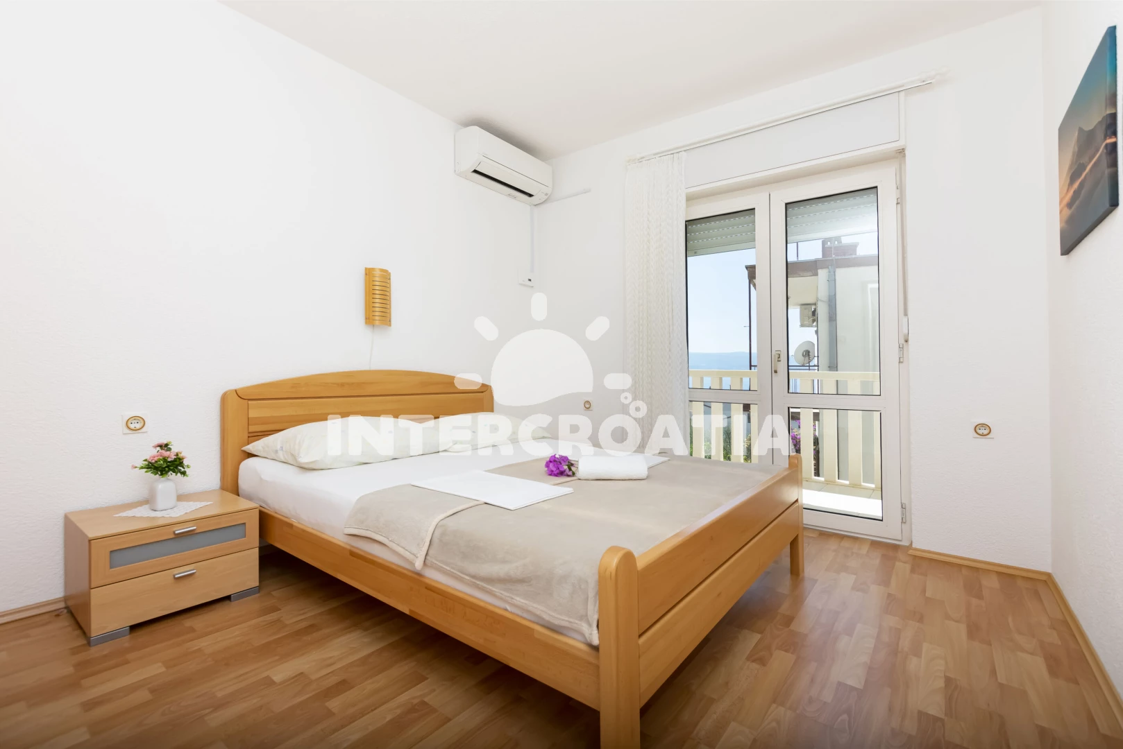 Apartmán (120 m2) s balkonem, terasou, venkovním posezením a výhledem na moře se nachází v 1. patře domu. Dům má 3 ložnice, 3 koupelny a je vhodný pro až 7 osob. Obývací pokoj je spojený s kuchyní. Kuchyňská linka je vybavena varnou deskou, digestoří, vestavěnou troubou, rychlovarnou konvicí, kávovarem, nádobím a lednicí s mrazákem. Obývací pokoj s jídelním stolem, pohovkou (rozložitelná na extra lůžko pro 1 osobu), televizí a vstupem na terasu. Všechny tři ložnice jsou vybaveny vždy s dvoulůžkem, klimatizací a vstupem na balkon. Celkem tři koupelny, které jsou vybaveny sprchovým koutem, umyvadlem a wc (jeden fén). Hostům je k dispozici parkování u objektu zdarma.