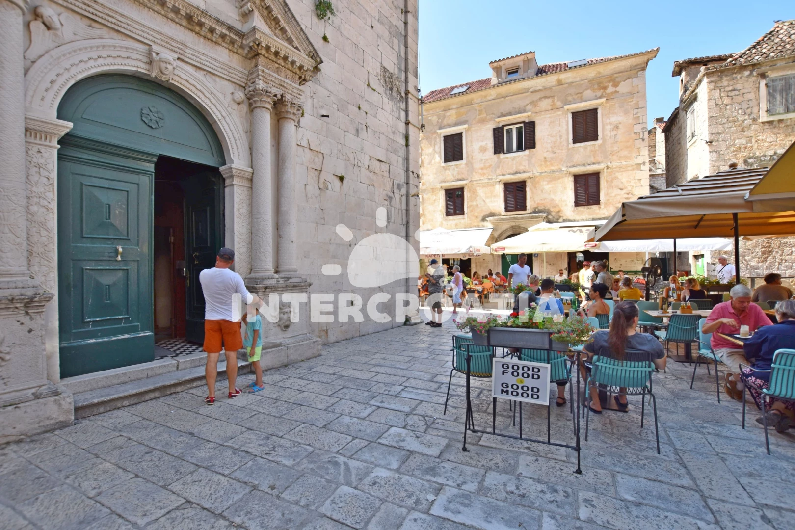 Vzdálenosti: Moře 700 m, pláž 700 m (písek), lékárna 130 m, supermarket 200 m, směnárna 200 m, bar 200 m, půjčovna motorových člunů 300 m, veřejná doprava 400 m, centrum 400 m, banka 400 m, muzeum 450 m, restaurace 450 m, pošta 500 m, půjčovna kol 500 m, kotviště pro čluny 700 m, marina 700 m, čerpací stanice 700 m, tenisové kurty 800 m, potápění 800 m, ambulance 1 km, diskotéka 25 km, trajekt (Split) 25 km, letiště (Split) 45 km,