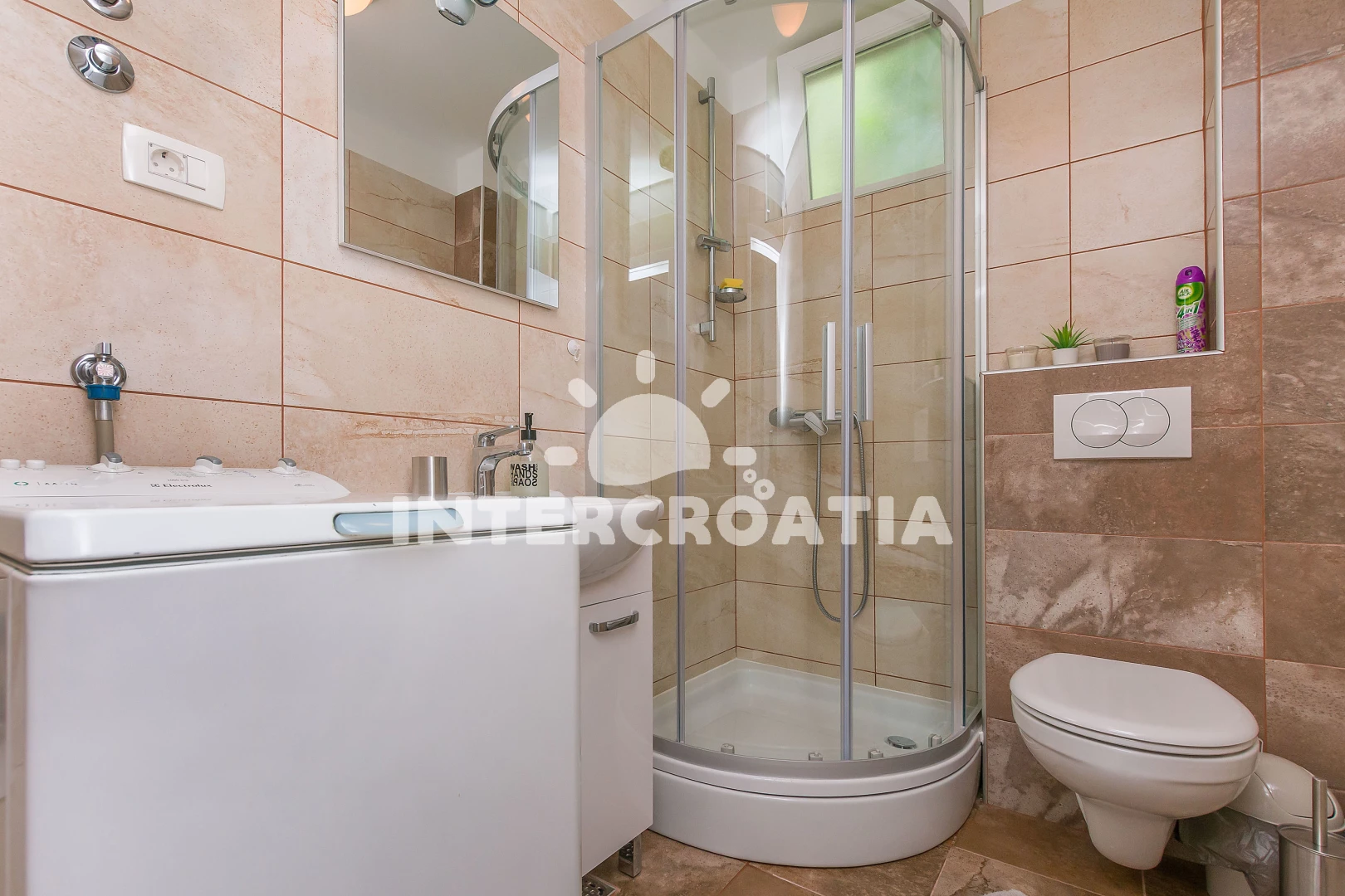 Vzdálenosti: Moře 90 m, pláž 250 m (oblázky), bar 30 m, ambulance 50 m, supermarket 80 m, veřejná doprava 290 m, restaurace 350 m, směnárna 420 m, muzeum 420 m, pošta 420 m, centrum 420 m, půjčovna motorových člunů 420 m, banka 420 m, lékárna 420 m, potápění 1 km, půjčovna kol 1,4 km, čerpací stanice 1,4 km, mini golf 7 km, diskotéka 35 km, trajekt (Split) 35 km, letiště (Split) 50 km,