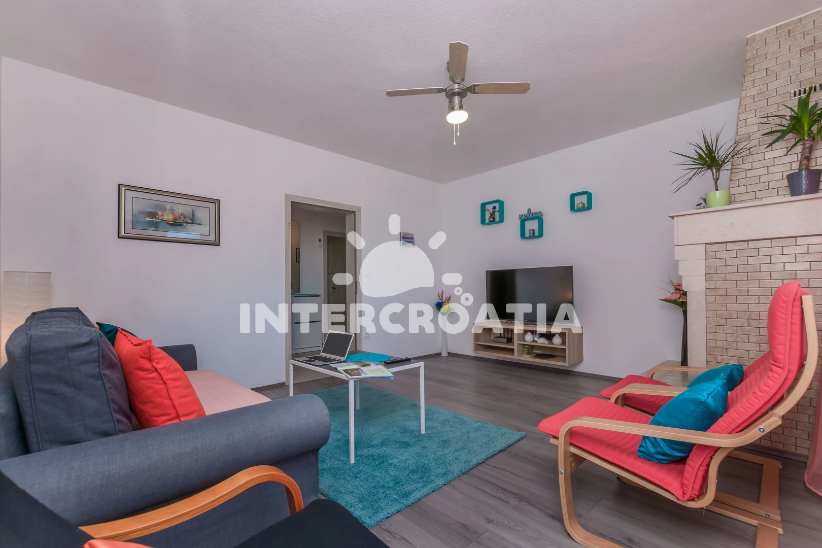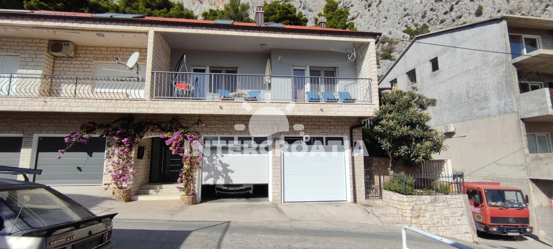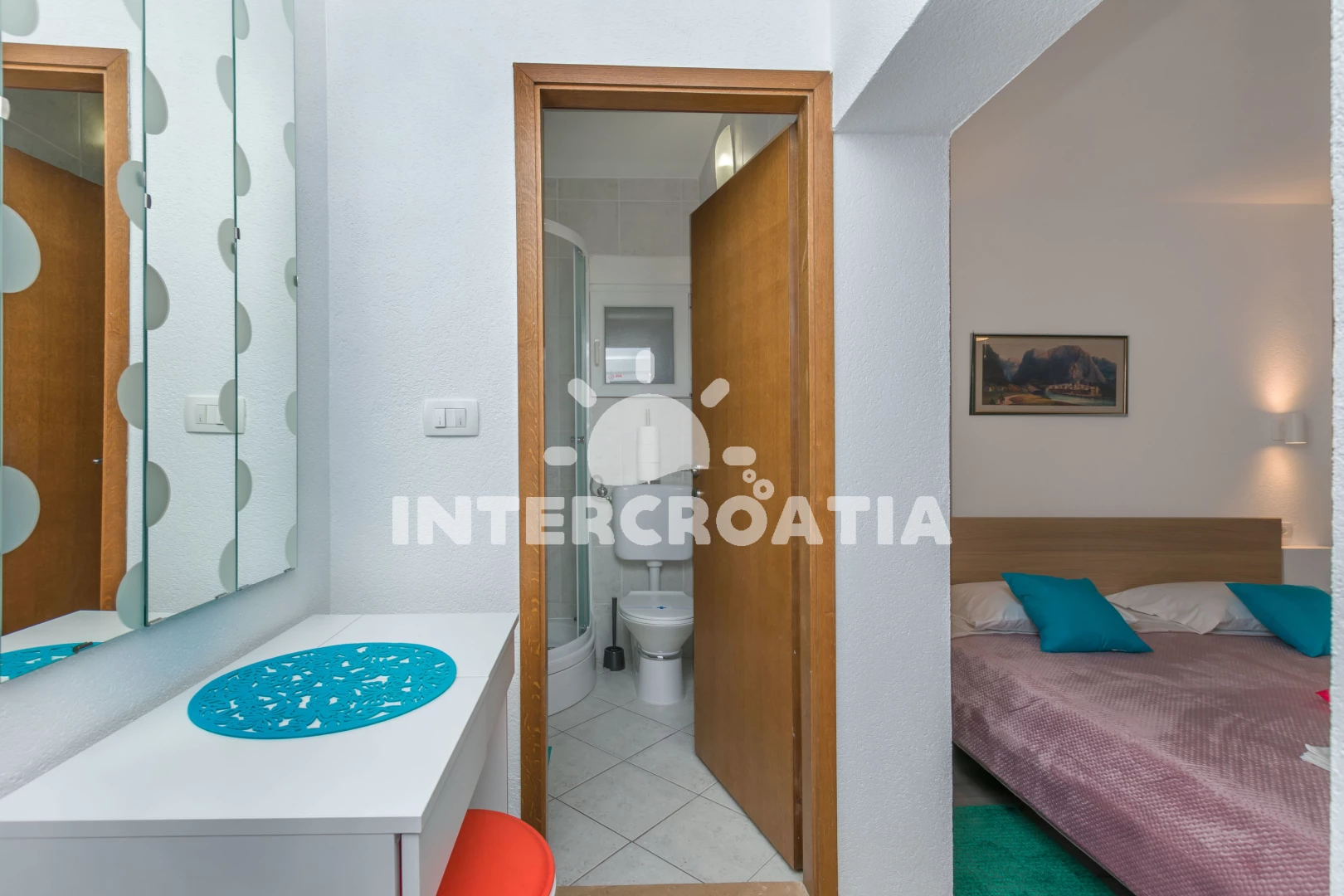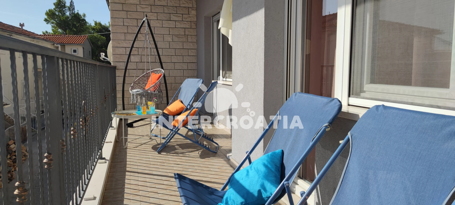 Vzdálenosti: Moře 500 m, pláž 850 m (písek), supermarket 250 m, směnárna 250 m, veřejná doprava 250 m, bar 250 m, banka 250 m, čerpací stanice 350 m, restaurace 400 m, tenisové kurty 400 m, lékárna 550 m, centrum 600 m, kotviště pro čluny 800 m, muzeum 800 m, půjčovna motorových člunů 800 m, potápění 800 m, pošta 800 m, ambulance 1,3 km, mini golf 7 km, trajekt (Split) 25 km, letiště (Split) 45 km,