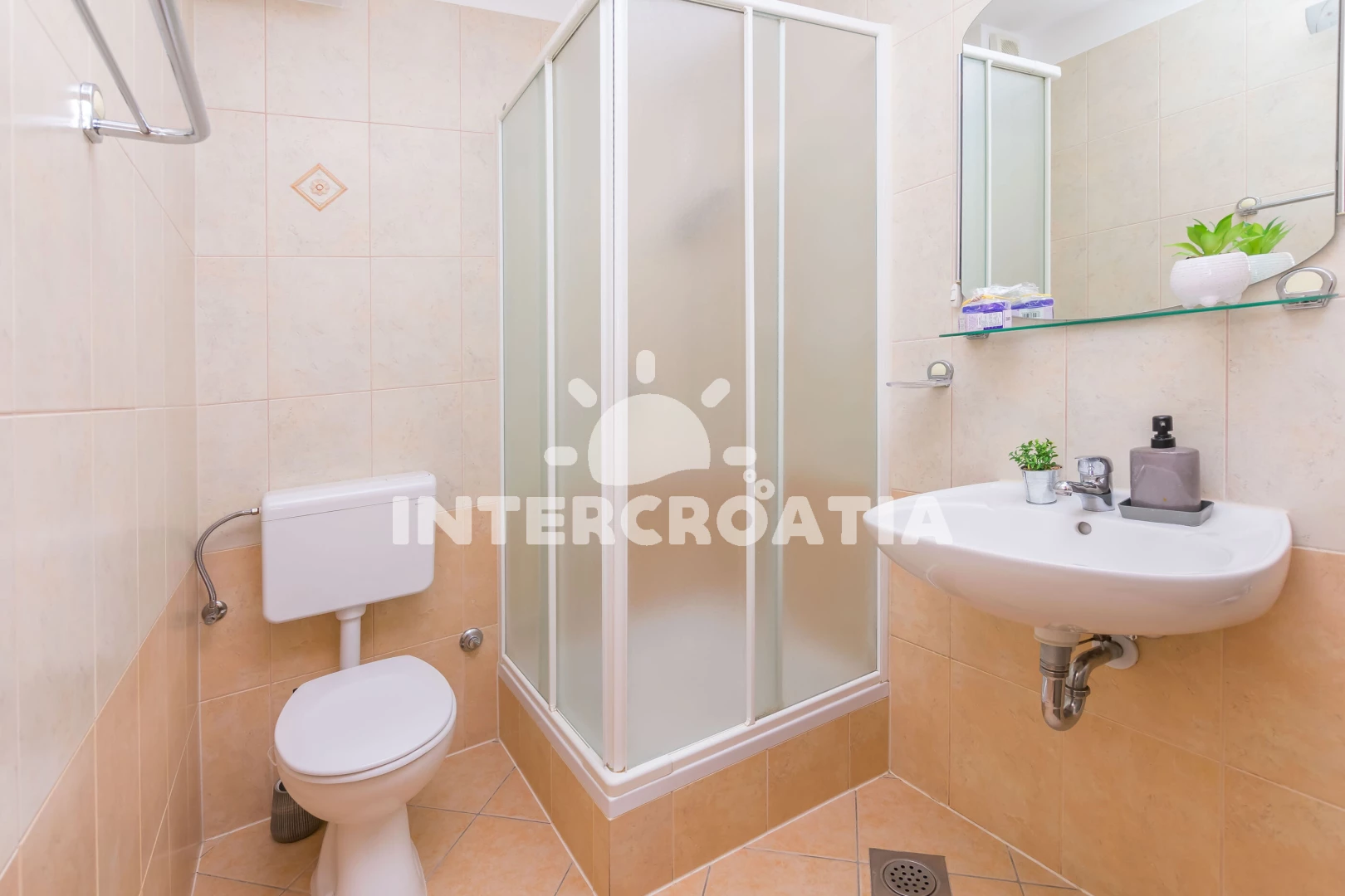 Vzdálenosti: Moře 50 m, pláž 500 m (písek), bar 10 m, restaurace 10 m, supermarket 100 m, veřejná doprava 100 m, banka 100 m, půjčovna motorových člunů 200 m, směnárna 200 m, čerpací stanice 200 m, půjčovna kol 200 m, lékárna 300 m, tenisové kurty 400 m, potápění 500 m, muzeum 500 m, centrum 500 m, pošta 1 km, ambulance 1,5 km, marina 13 km, diskotéka 25 km, trajekt (Split) 25 km, letiště (Split) 40 km,
