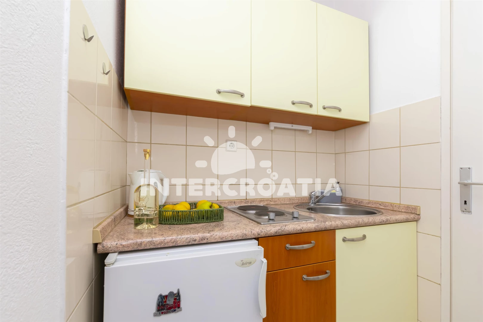Apartmán typu studio (25 m2) s balkonem, a výhledem na moře. Nachází se v 1. patře objektu. Kuchyňská linka je vybavena varnou deskou, rychlovarnou konvicí, nádobím, lednicí. K dispozici dvoulůžko,…
