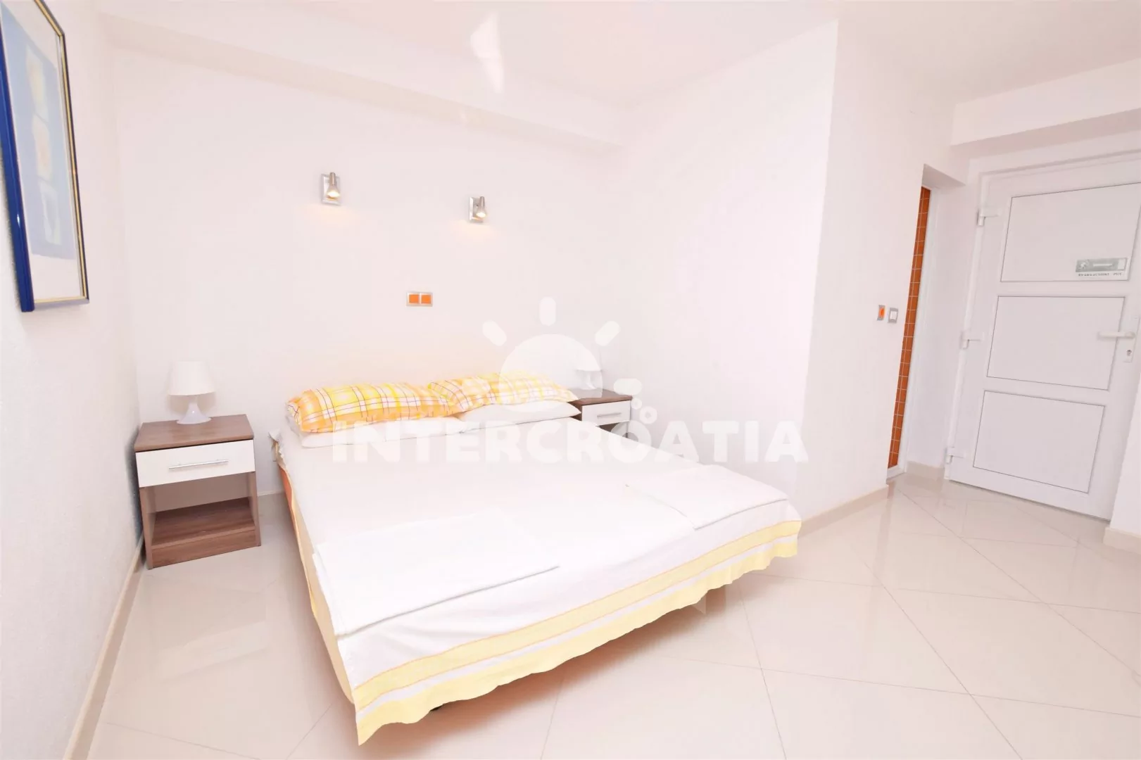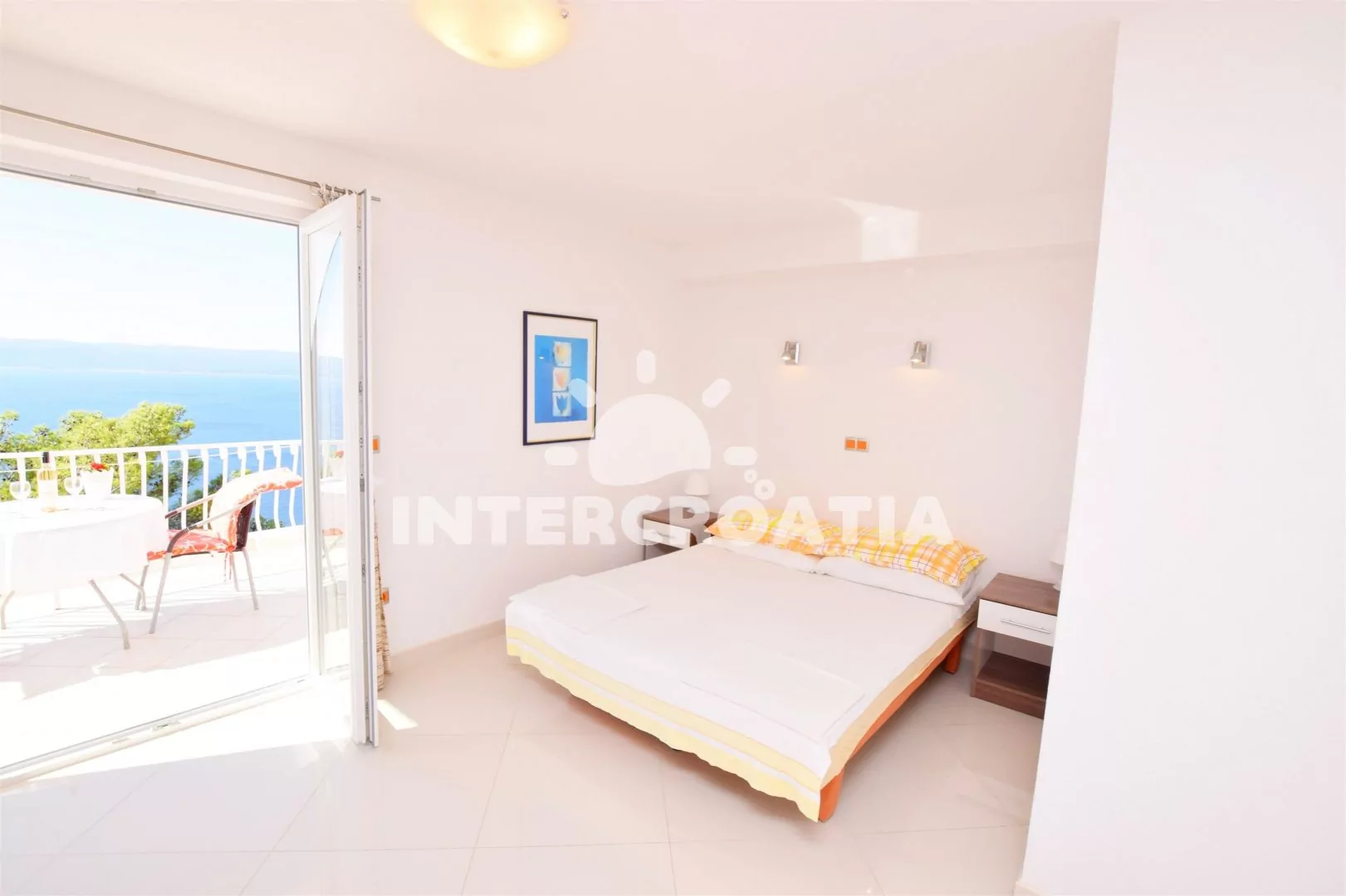 Apartmán typu studio v prvním patře s výhledem na moře a terasou s venkovním posezením je vhodný pro 2 osoby. Obývací pokoj je spojený s kuchyní. Kuchyňská linka je vybavena dvouplotýnkovým elektrickým sporákem, nádobím a lednicí s mrazákem. Obývací pokoj s jídelním stolem pro 2 osoby, pohovkou, televizí se satelitním programem, jedním dvoulůžkem, klimatizaci a vstupem na terasu. Koupelna se sprchovým koutem, umyvadlem a wc. Hostům je k dispozici parkování u objektu zdarma.