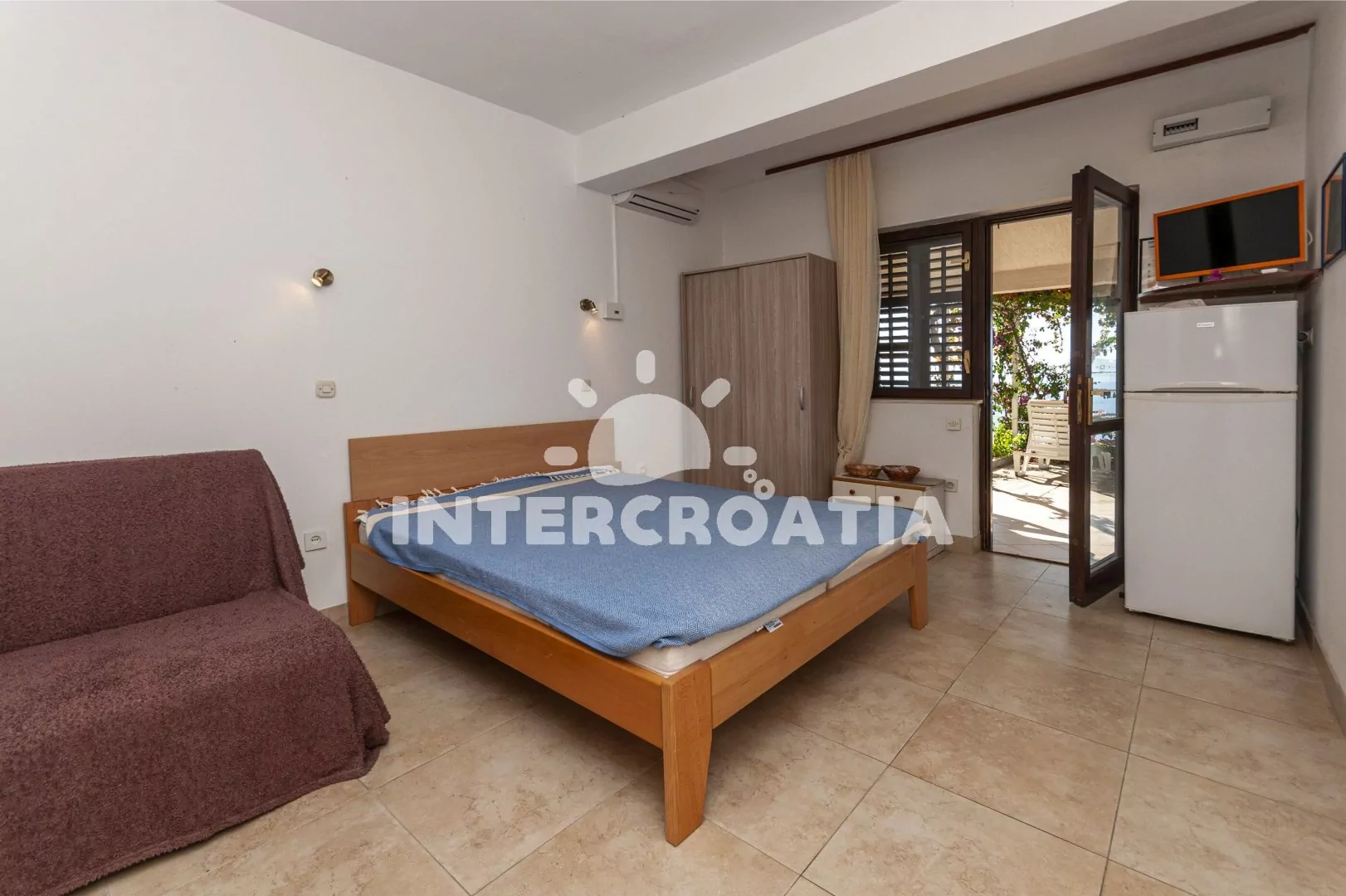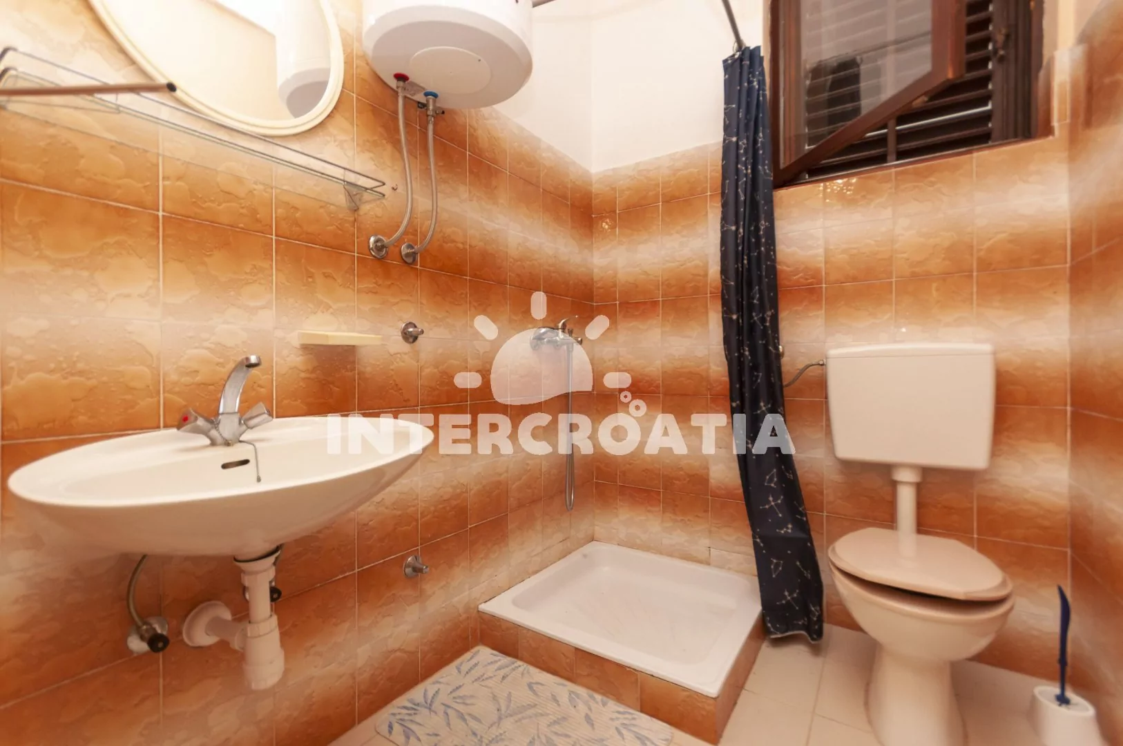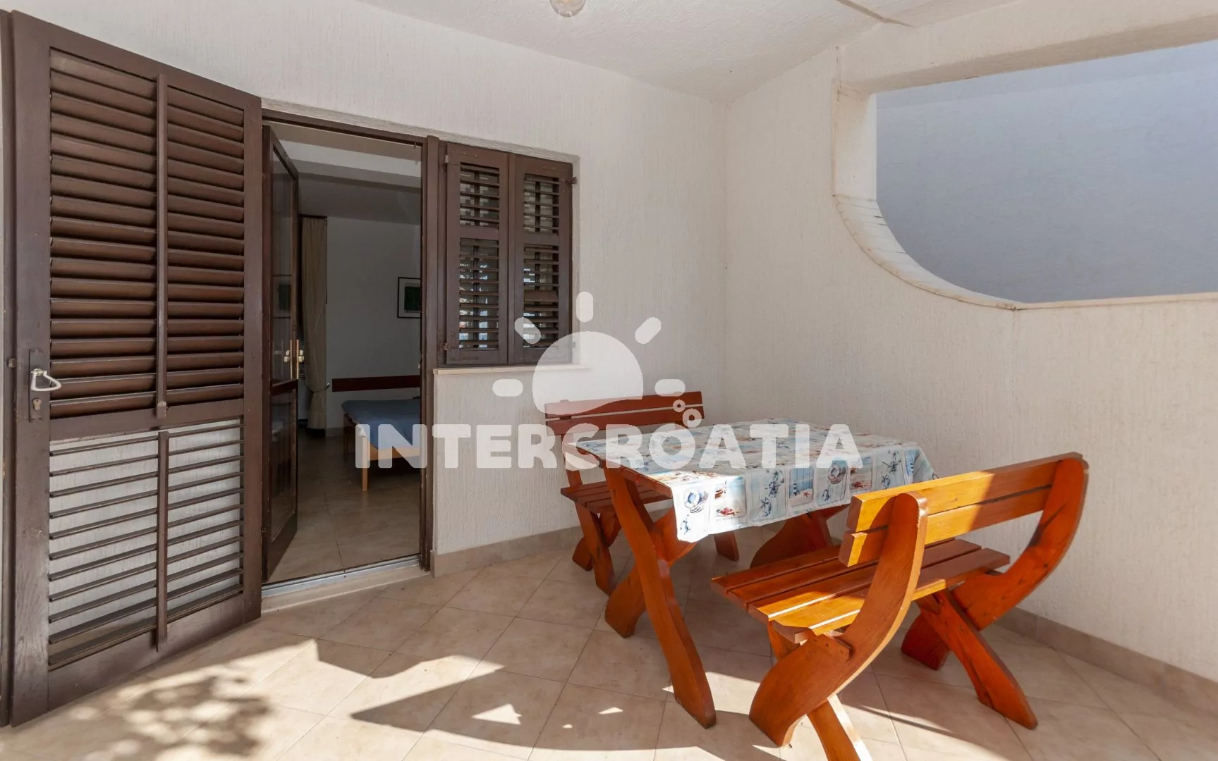 Apartmán (20 m2) s terasou, posezením a výhledem na moře se nachází v přízemí domu. Apartmán je vhodný pro 2 až 3 osoby. Obývací místnost je spojena s kuchyní. Kuchyňská linka je vybavena dvouplotýnkovým vařičem, rychlovarnou konvicí, nádobím a lednicí s mrazákem. Obývací místnost s pohovkou (rozložitelná na extra lůžko pro 1 osobu), televizí, klimatizací, dvoulůžkem a vstupem na terasu. Koupelna se sprchovým koutem, umyvadlem, fénem a wc. Hostům je k dispozici parkování objektu zdarma.