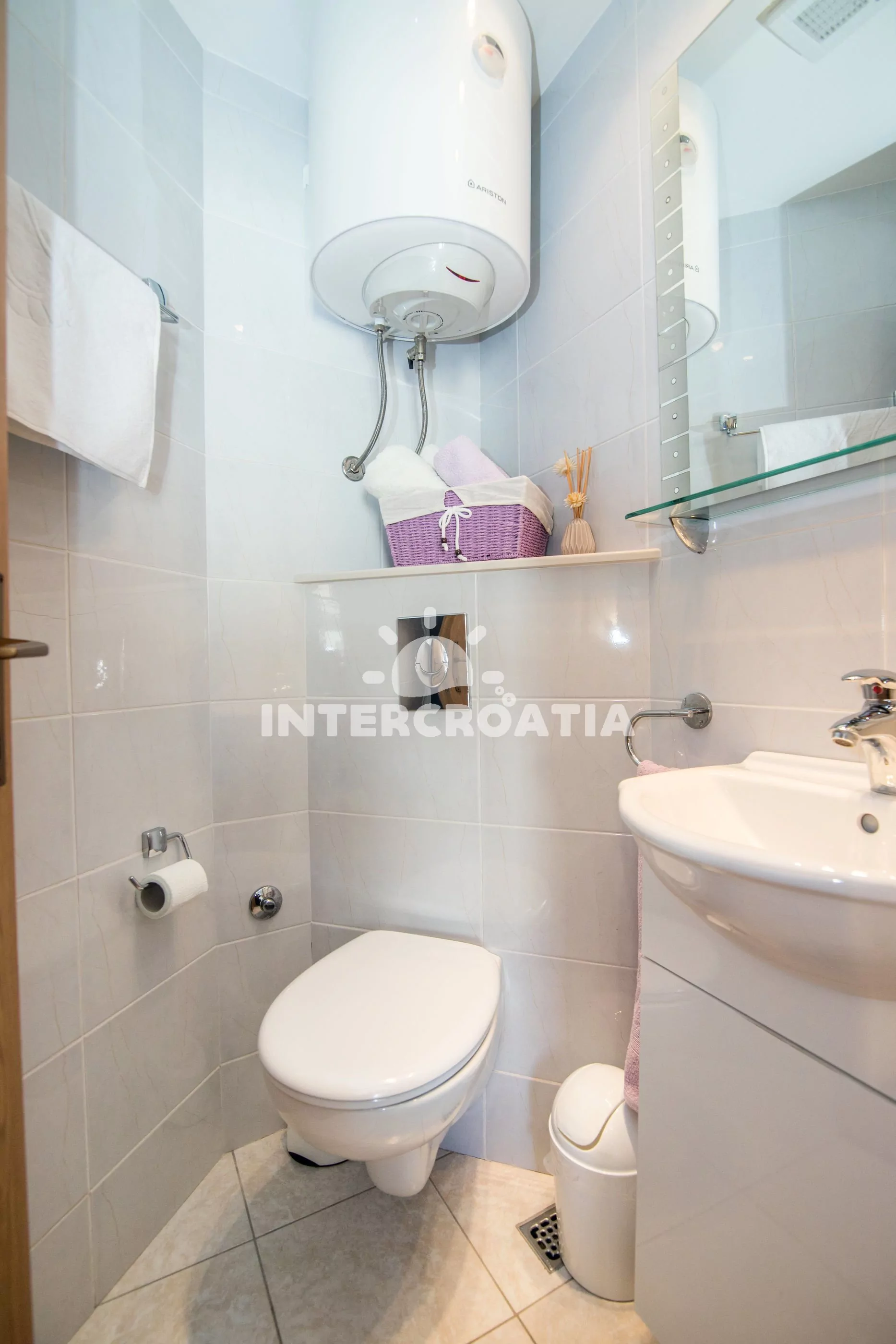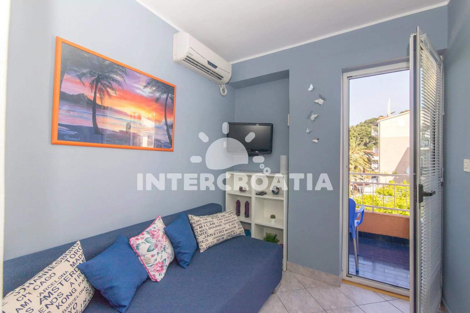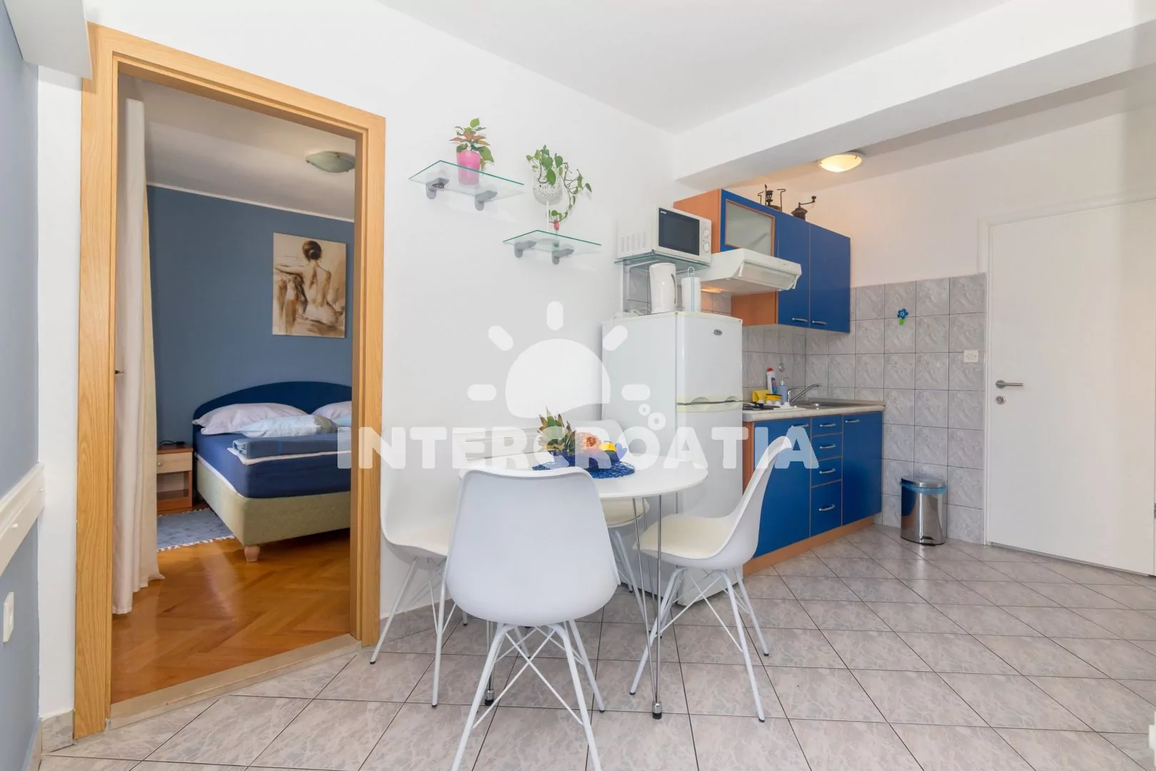 Apartmán (35 m2) s balkonem a výhledem na moře se nachází v 2. patře domu a je vhodný pro 2 až 3 osoby. Obývací pokoj je spojený s kuchyní. Kuchyňská linka je vybavena varnou deskou, digestoří, mikrovlnnou troubou, rychlovarnou konvicí, nádobím a lednicí s mrazákem. Obývací pokoj s jídelním stolem pro 4 osoby, pohovkou (rozložitelná na extra lůžko pro 1 osobu), televizí se satelitním programem, klimatizací a vstupem na balkon. Ložnice s dvoulůžkem a vstupem na balkon. Koupelna se sprchovým koutem, umyvadlem, fénem a wc. Hostům je k dispozici parkování u objektu zdarma.