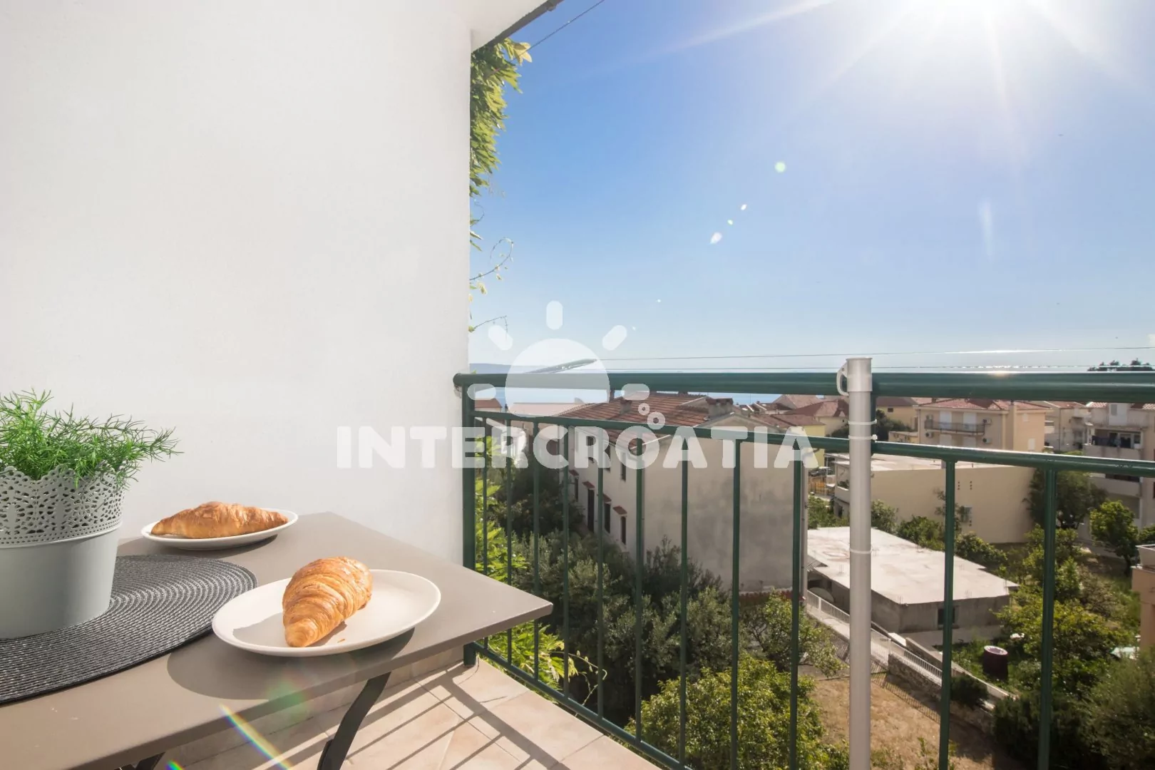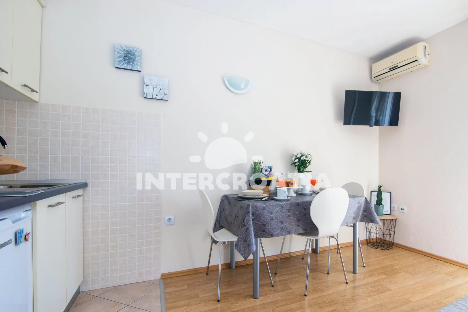 Apartmán typu studio (22 m2), s balkonem a výhledem na moře se nachází ve 2. patře domu. Apartmán je vhodný pro 2 osoby. Obývací místnost je spojena s kuchyní. Kuchyňská linka je vybavena dvouplotýnkovým vařičem, digestoří, rychlovarnou konvicí, nádobím a lednicí s mrazákem. Obývací místnost s jídelním stolem, televizí, jedním dvoulůžkem, klimatizací a vstupem na balkon. Koupelna se sprchovým koutem, umyvadlem a wc. Na požádání k dispozici fén, žehlička a dětská postýlka.