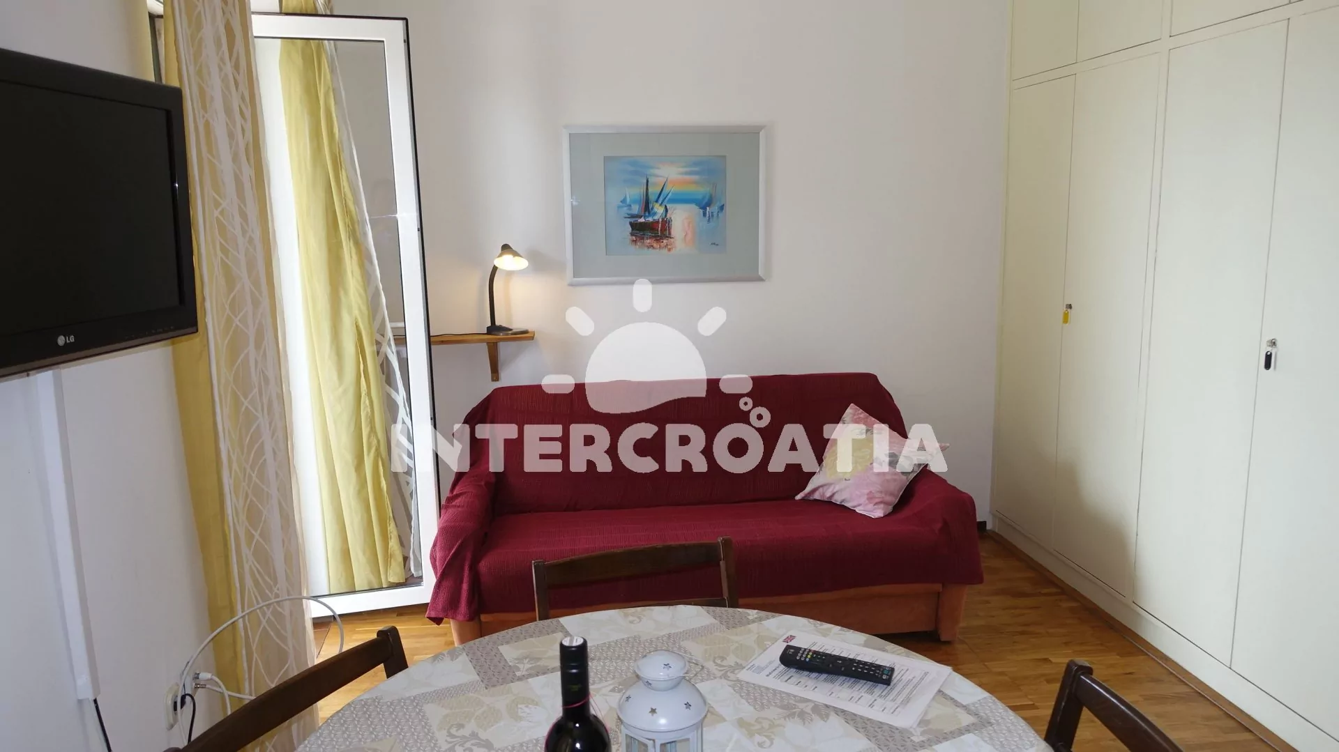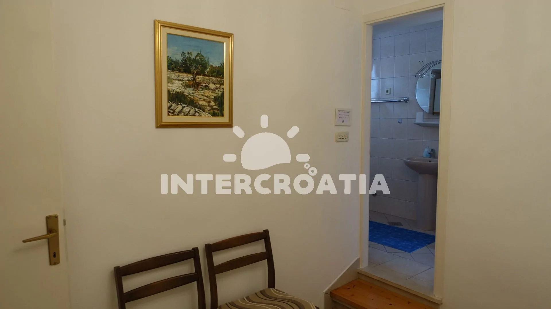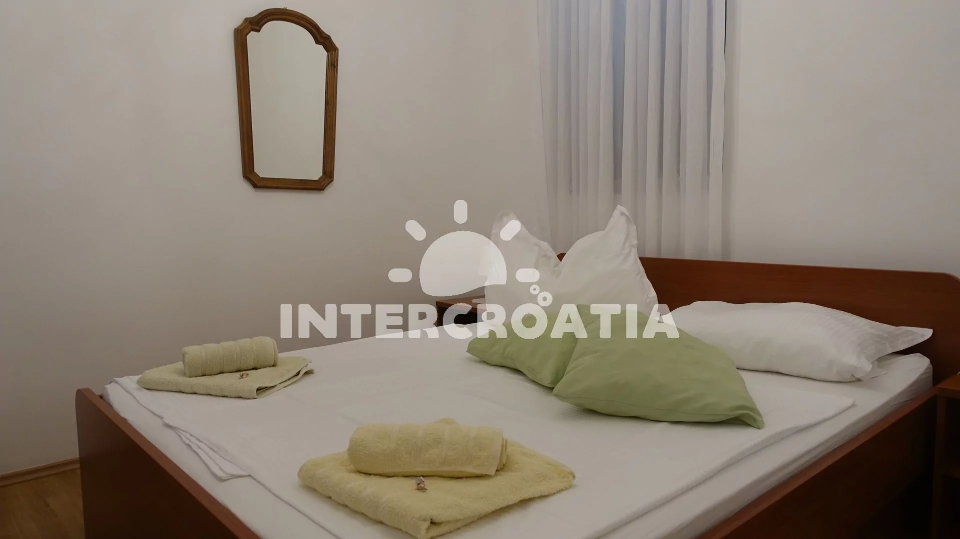 Apartmán (40 m2) s terasou a výhledem na moře se nachází v 1. patře vily. Apartmán má 1 ložnici a je vhodný pro 2 až 4 osoby. Obývací pokoj je spojený s kuchyní. Kuchyňská linka je vybavena varnou deskou, digestoří, vestavěnou troubou, myčkou na nádobí, rychlovarnou konvicí, mikrovlnnou troubou, kávovarem, nádobím a lednicí s mrazákem. Obývací pokoj s jídelním stolem pro 4 osoby, pohovkou (rozložitelná na extra lůžko pro 2 osoby), televizí se satelitním programem, radiem a klimatizací. Ložnice s dvoulůžkem a sejfem. Koupelna se sprchovým koutem, umyvadlem a wc. Hostům je k dispozici parkování u objektu zdarma.