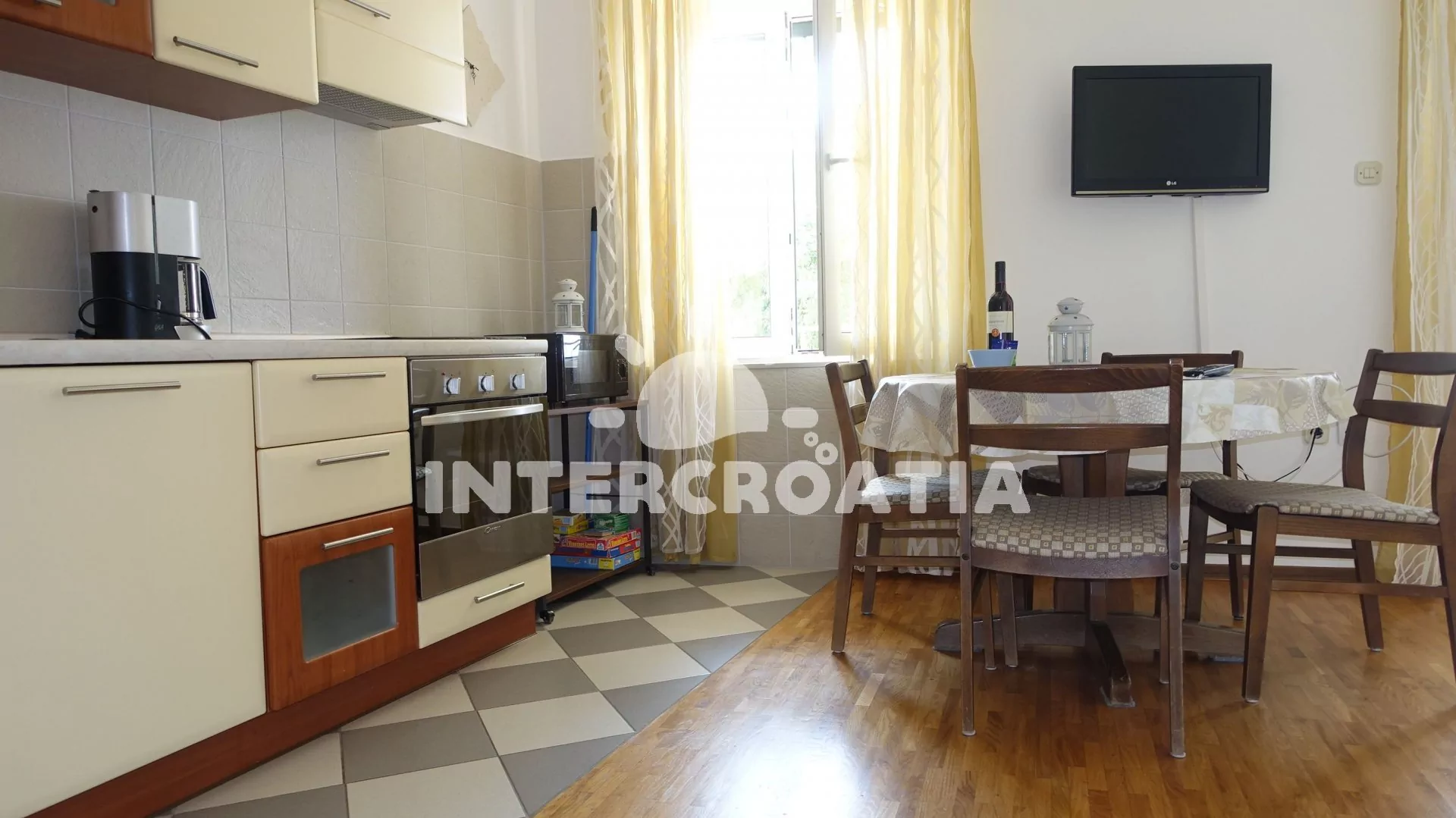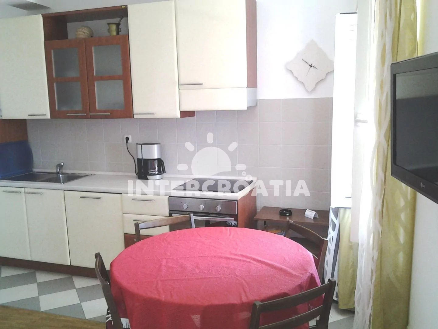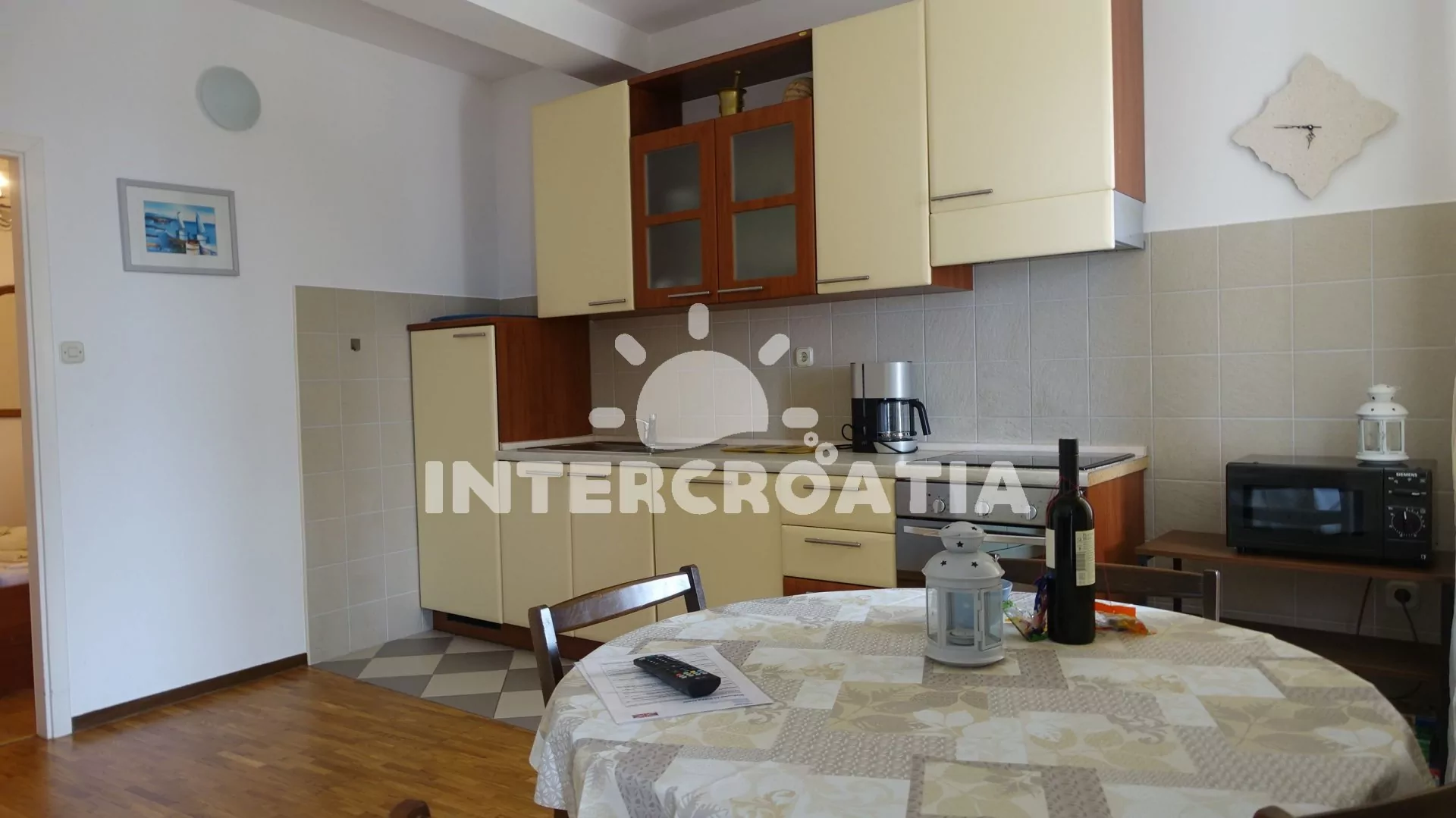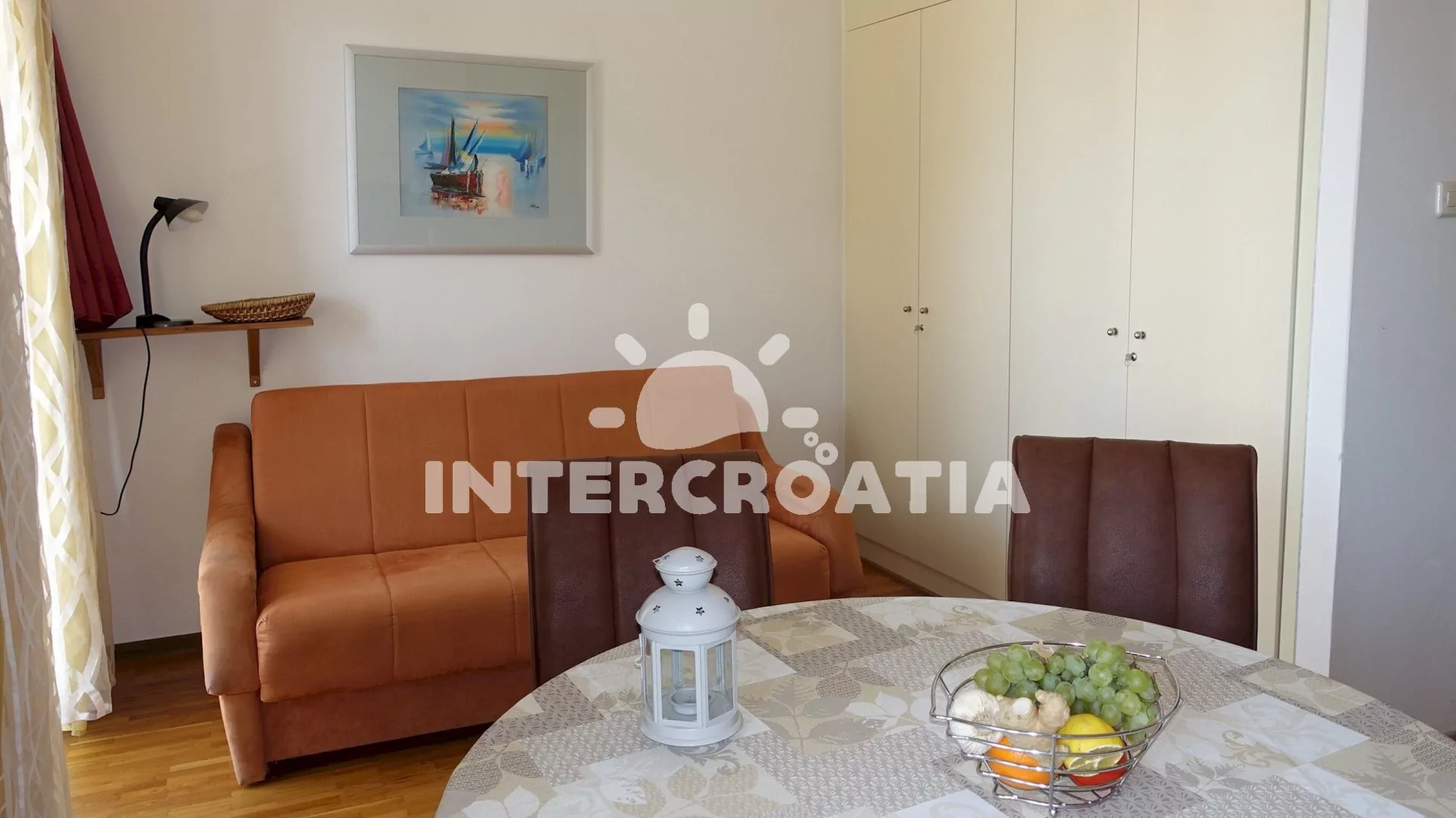 Apartmán (40 m2) s terasou a výhledem na moře se nachází v 1. patře vily. Apartmán má 1 ložnici a je vhodný pro 2 až 4 osoby. Obývací pokoj je spojený s kuchyní. Kuchyňská linka je vybavena varnou deskou, digestoří, vestavěnou troubou, myčkou na nádobí, rychlovarnou konvicí, mikrovlnnou troubou, kávovarem, nádobím a lednicí s mrazákem. Obývací pokoj s jídelním stolem pro 4 osoby, pohovkou (rozložitelná na extra lůžko pro 2 osoby), televizí se satelitním programem, radiem a klimatizací. Ložnice s dvoulůžkem a sejfem. Koupelna se sprchovým koutem, umyvadlem a wc. Hostům je k dispozici parkování u objektu zdarma.