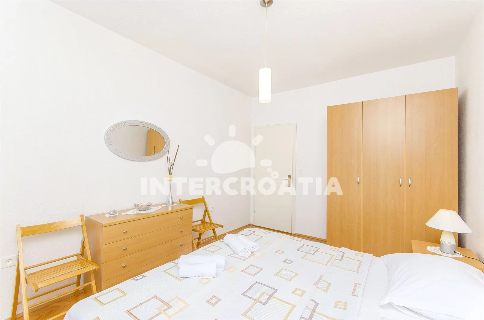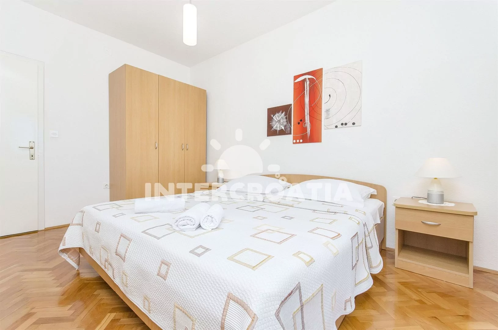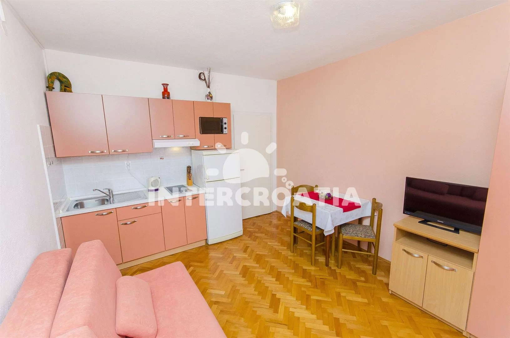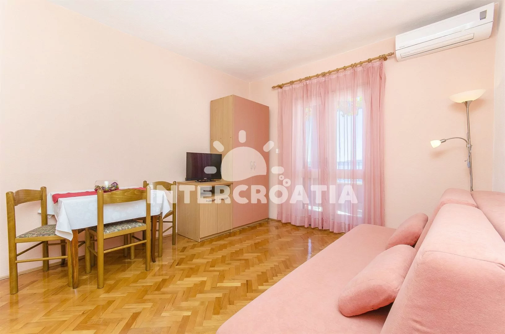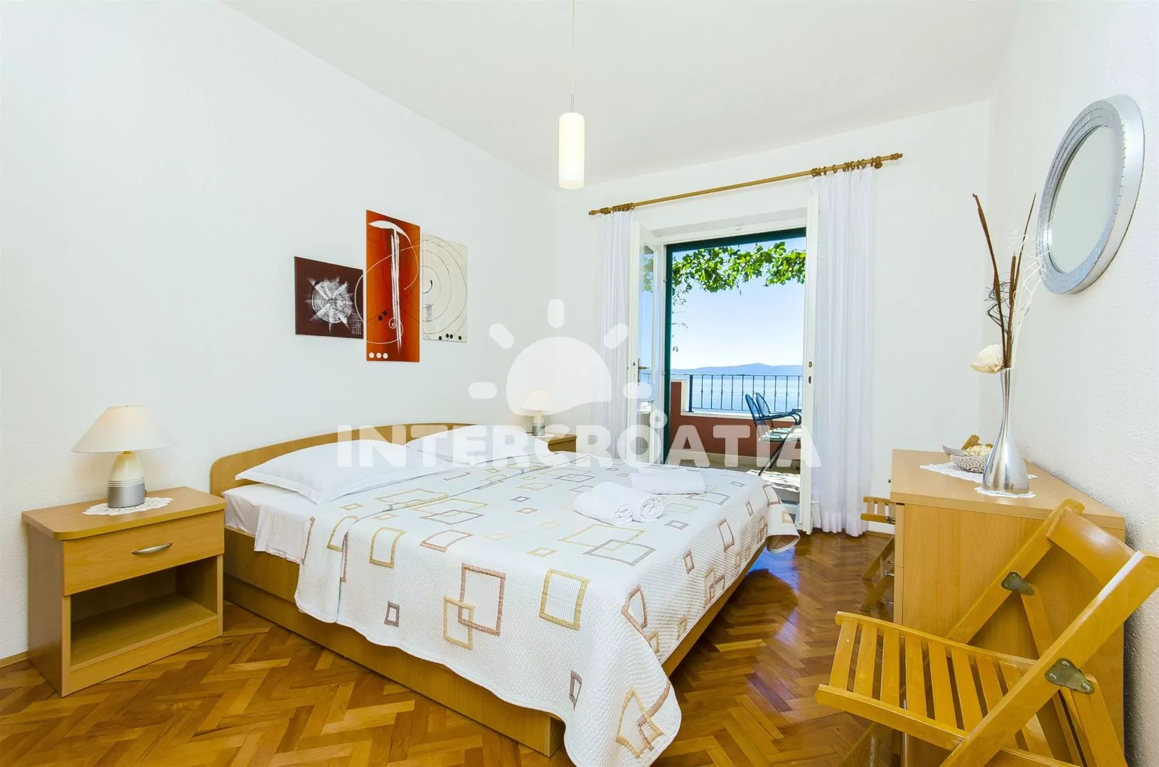 Apartmán (43 m2) s terasou, posezením a výhledem na moře se nachází v 1. patře domu. Apartmán má 1 ložnici a je vhodný pro 2 až 4 osoby. Obývací pokoj je spojený s kuchyní. Kuchyňská linka je vybavena dvouplotýnkovým vařičem, digestoří, mikrovlnnou troubu, rychlovarnou konvicí, nádobím a lednicí s mrazákem. Obývací pokoj s jídelním stolem, pohovkou (rozložitelná na extra lůžko pro 2 osoby), televizí se satelitním programem, klimatizací a vstupem na terasu. Ložnice s dvoulůžkem a vstupem na terasu. Koupelna s vanou, sprchovou zástěnou, umyvadlem a wc. Hostům je k dispozici parkování 50 - 150 m od domu zdarma.