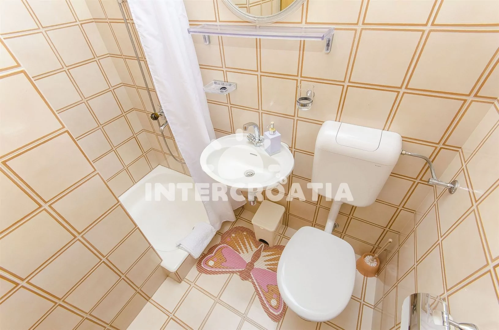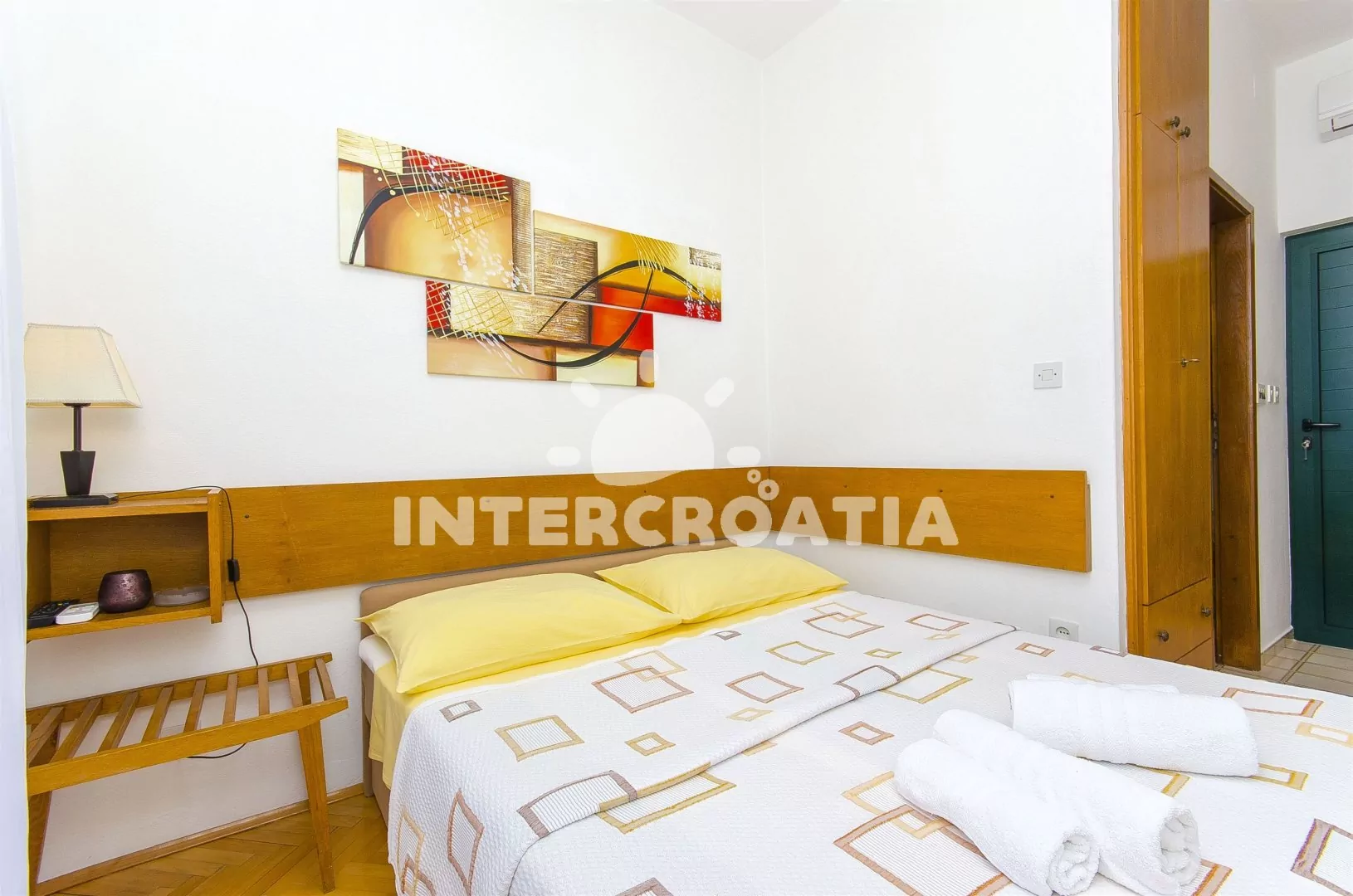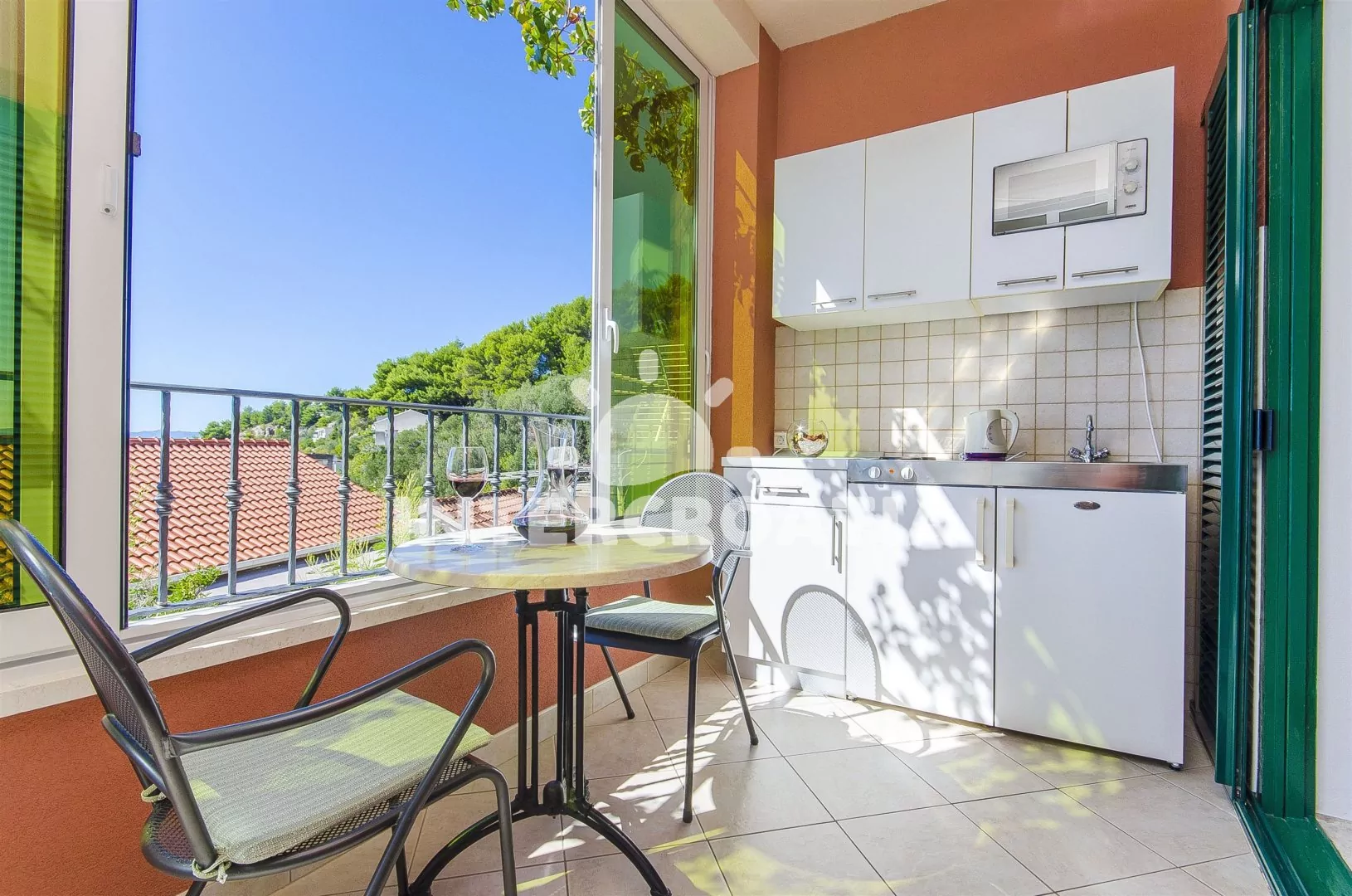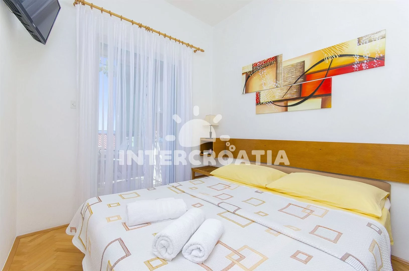 Apartmán (14 m2) s uzavřeným balkonem, posezením, výhledem na moře a kuchyní se nachází v 1. patře domu. Apartmán má 1 ložnici a je vhodný pro 2 osoby. Kuchyňská linka je umístěna na uzavíratelném balkoně. Kuchyňská linka je vybavena dvouplotýnkovým vařičem, mikrovlnnou troubu, rychlovarnou konvicí, nádobím a lednicí s mrazákem. Ložnice s dvoulůžkem, televizí se satelitním programem, klimatizací a vstupem na balkon. Koupelna se sprchovým koutem, umyvadlem a wc. Hostům je k dispozici parkování 50 - 150 m od domu zdarma.