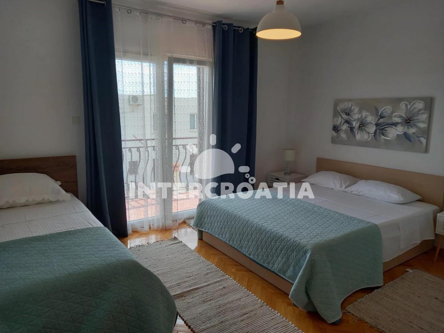 Apartmán (105 m2) s terasou, a výhledem na moře. Nachází se v 1. patře objektu. Apartmán má 3 ložnice a je vhodný pro až 8 osob. Kuchyňská linka je vybavena varnou deskou, troubou, mikrovlnnou troubou, rychlovarnou konvicí, nádobím, lednicí, mrazákem. K dispozici televize, žehlička. První ložnice s jednolůžkem, dvoulůžkem. Druhá ložnice s jednolůžkem, dvoulůžkem. Třetí ložnice s dvoulůžkem. Koupelna se sprchovým koutem, umyvadlem, fénem a WC. Druhá koupelna s vanou, umyvadlem, fénem a WC.
