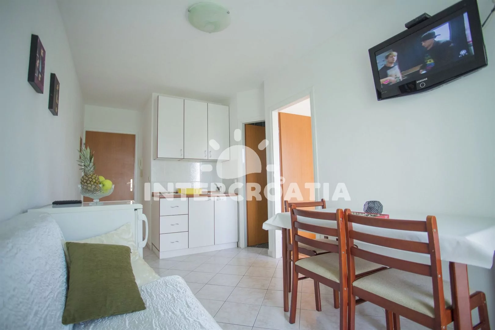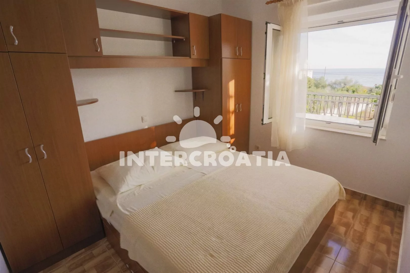 Apartmán v přízemí vilky s výhledem na moře je vhodný pro 2 až 3 osoby, venkovní posezením na terase k dispozici. Obývací pokoj je spojený s kuchyní. Kuchyňská linka s elektrickým dvouplotýnkovým sporákem, nádobím a lednicí s mrazákem. Obývací pokoj s jídelním stolem pro 4 osoby, televizí se satelitním programem, rozložitelnou pohovkou (extra lůžko pro 1 osobu), klimatizací a vstupem na balkon. Ložnice s jedním dvoulůžkem. Koupelna se sprchovým koutem, umyvadlem a wc. Hostům je k dispozici terasa s grilem a parkováním u objektu zdarma.