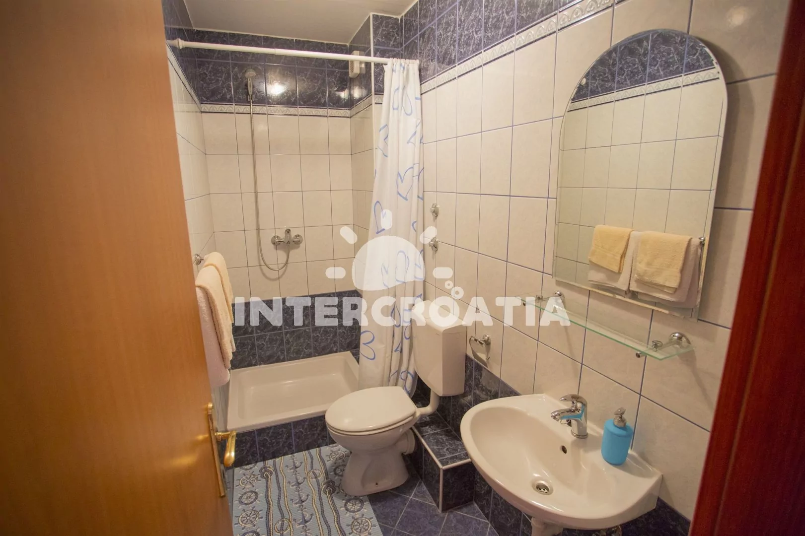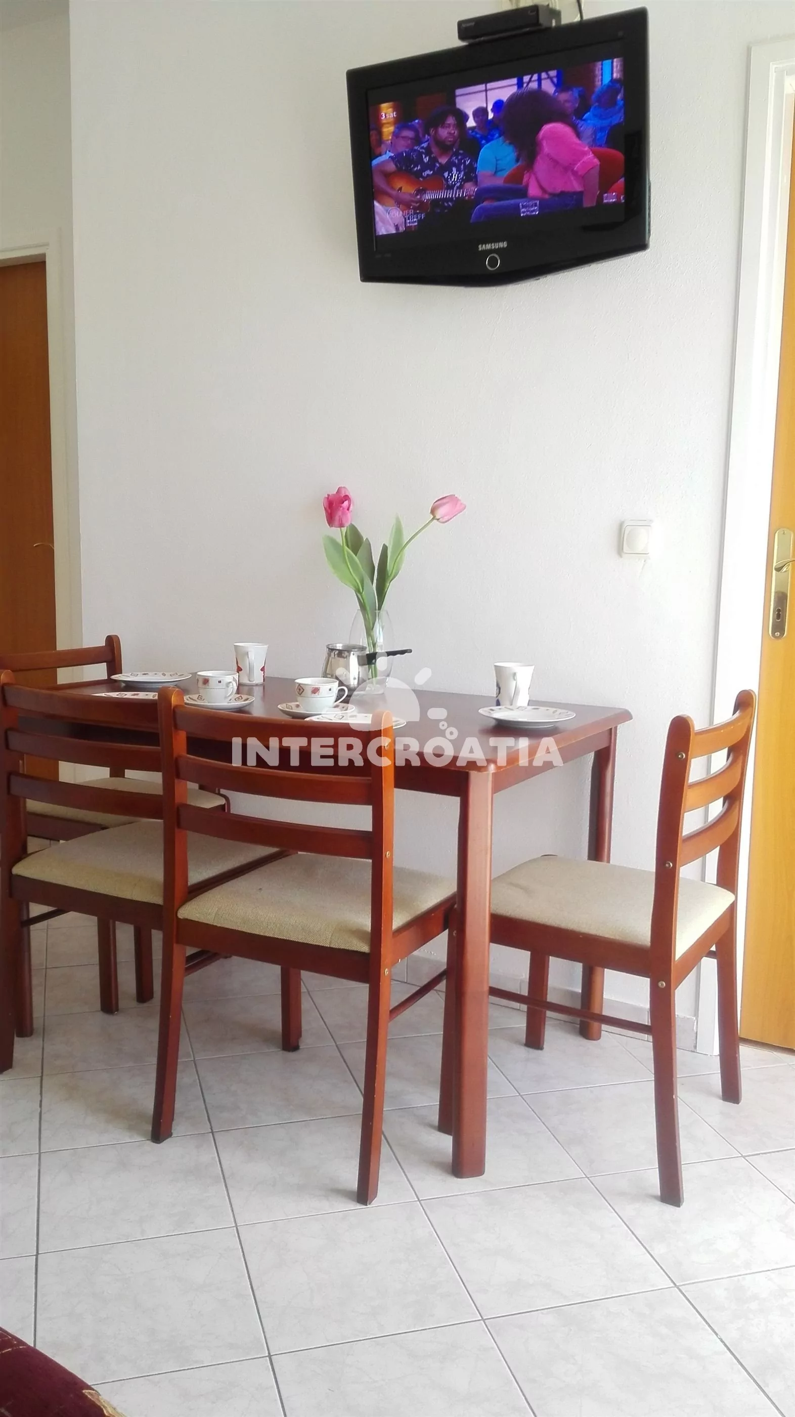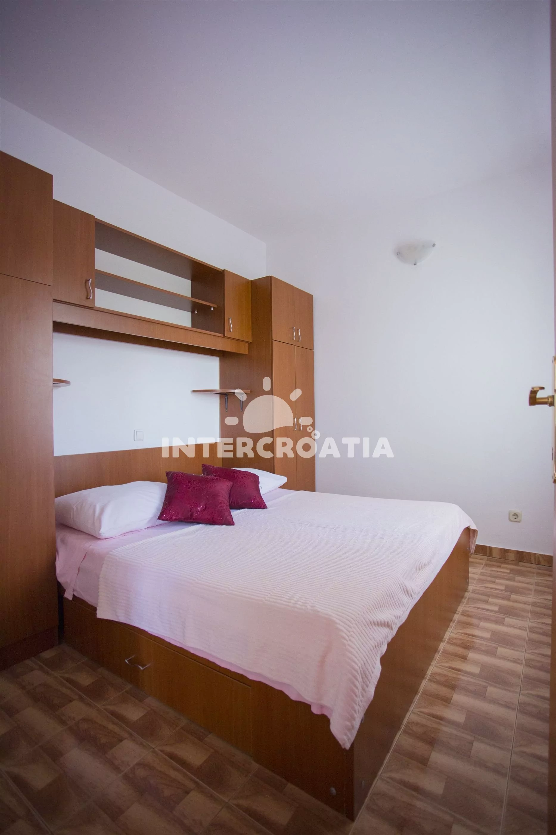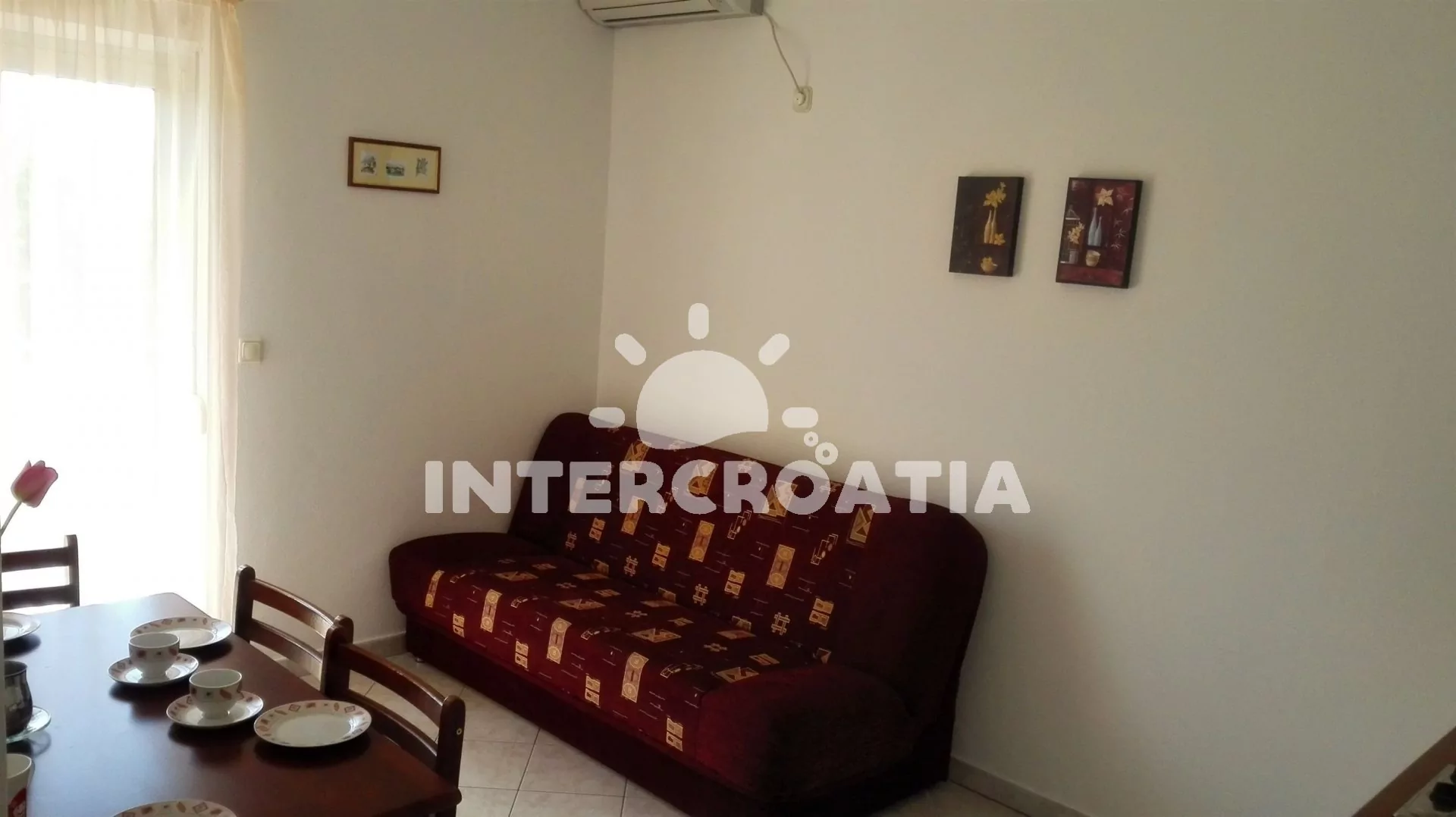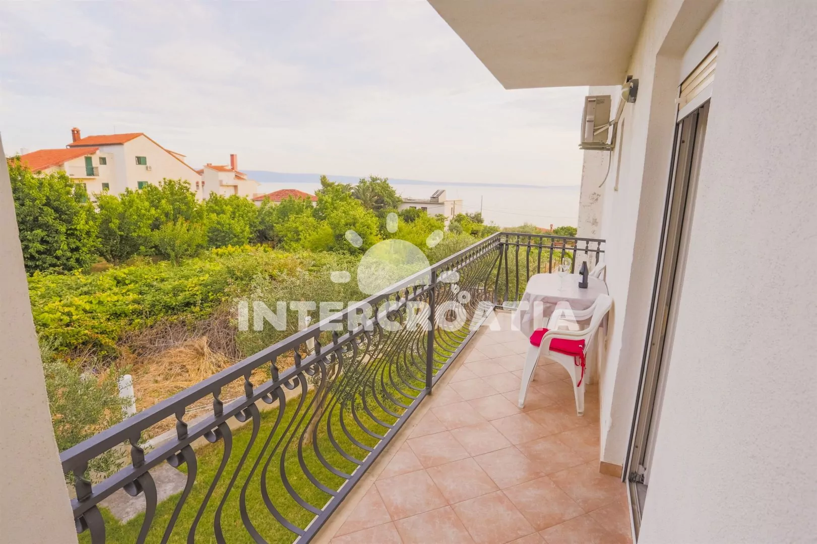 Apartmán v prvním patře vilky s výhledem na moře je vhodný pro 2 až 3 osoby. Obývací pokoj je spojený s kuchyní. Kuchyňská linka s elektrickým dvouplotýnkovým sporákem, nádobím a lednicí s mrazákem. Obývací pokoj s jídelním stolem pro 4 osoby, televizí se satelitním programem, rozložitelnou pohovkou (extra lůžko pro 1 osobu), klimatizací a vstupem na balkon. Ložnice s jedním dvoulůžkem. Koupelna se sprchovým koutem, umyvadlem a wc. Hostům je k dispozici terasa s grilem a parkováním u objektu zdarma.