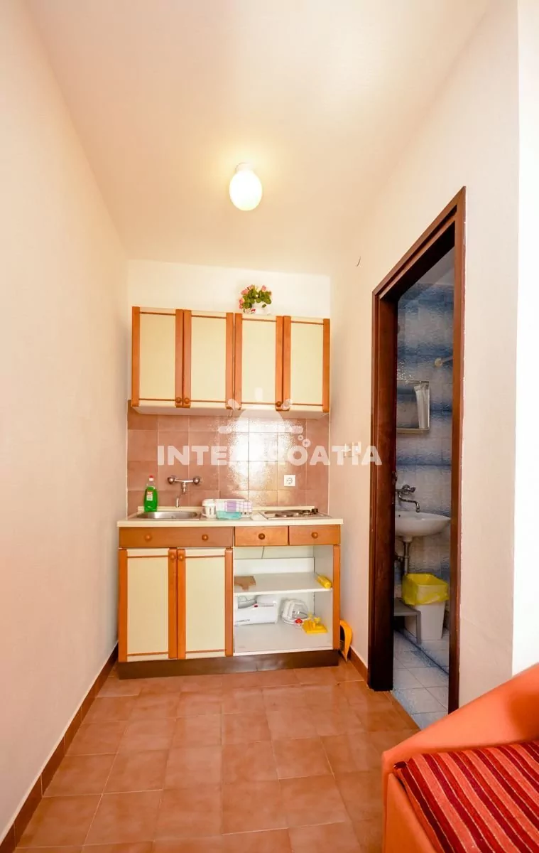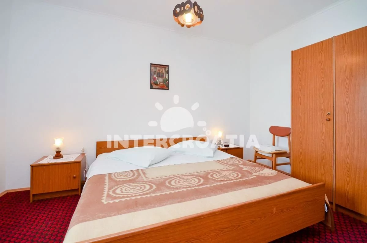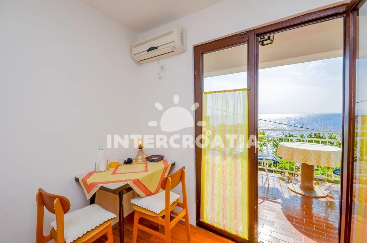 Apartmán v přízemí s výhledem na moře a balkonem je vhodný pro 2 osoby. Obývací pokoj je spojený s kuchyní. Kuchyňská linka je vybavena sporákem, kávovarem, nádobím a lednicí s mrazákem. Obývací pokoj s jídelním stolem pro 2 osoby, pohovkou, radiem, klimatizací a vstupem na balkon. Ložnice s jedním dvoulůžkem. Koupelna se sprchovým koutem, umyvadlem a wc. Hostům je k dispozici parkování u objektu zdarma.