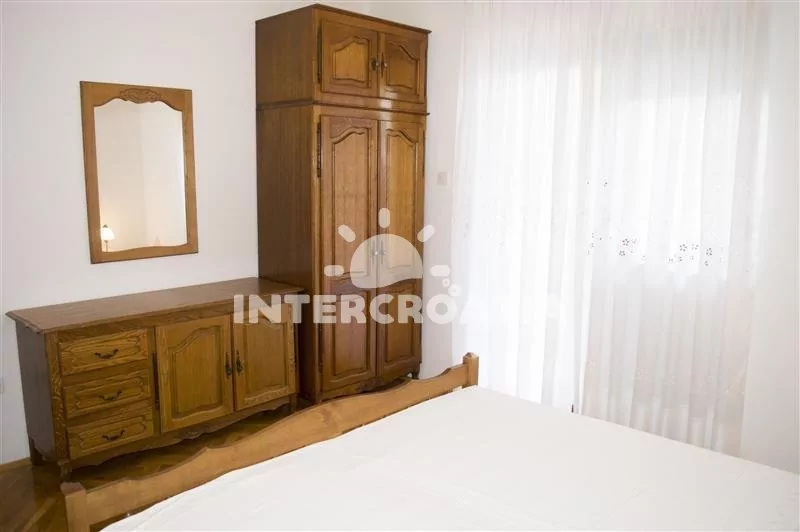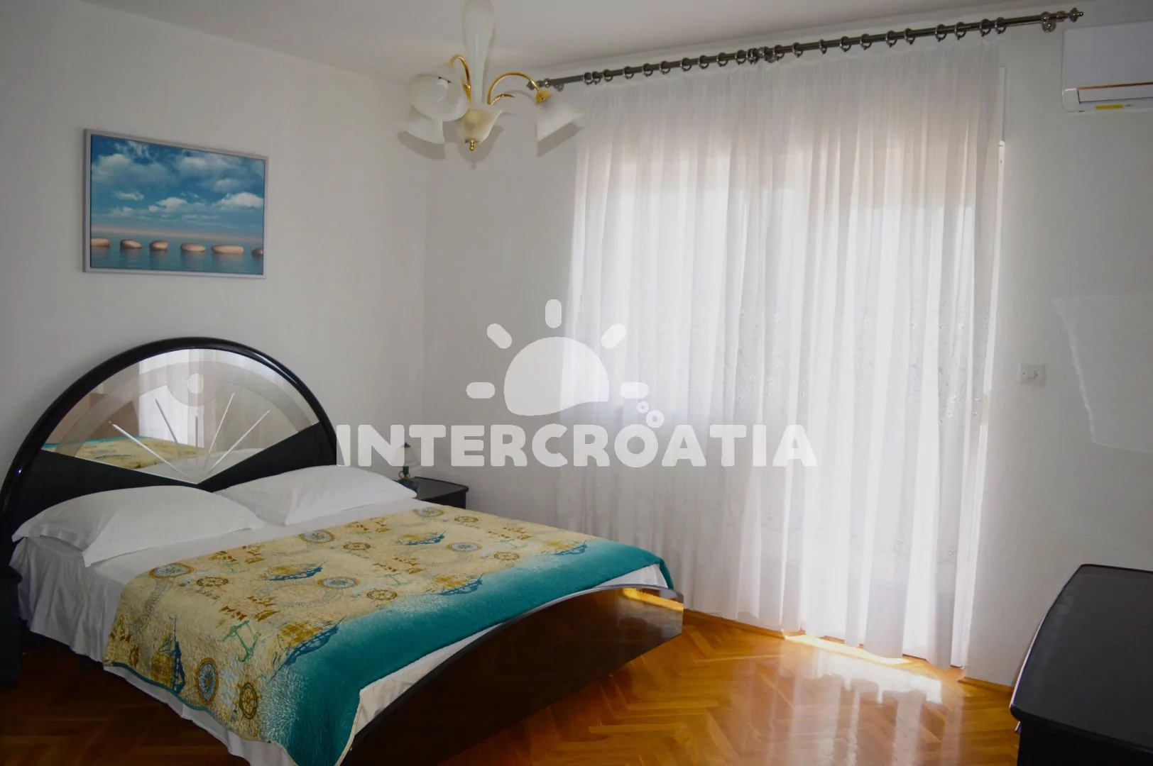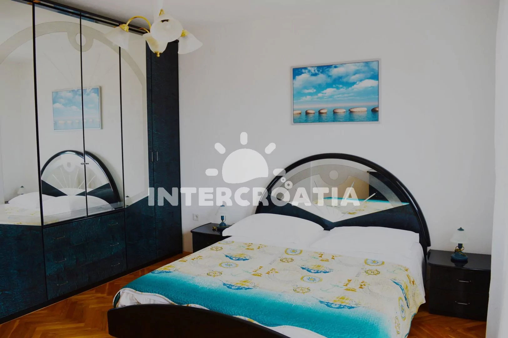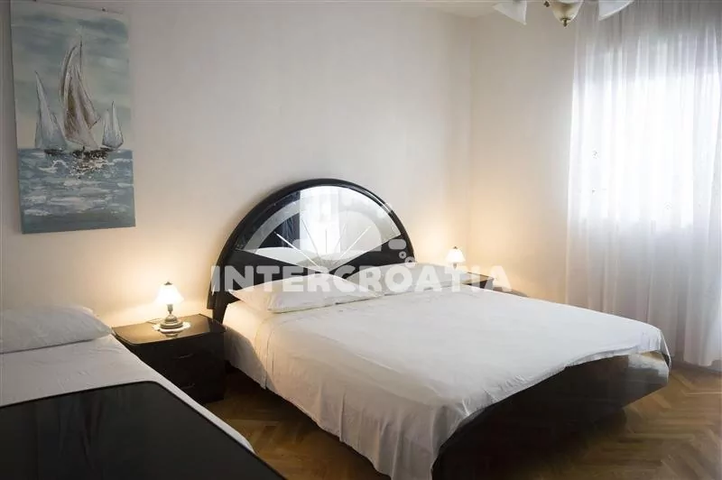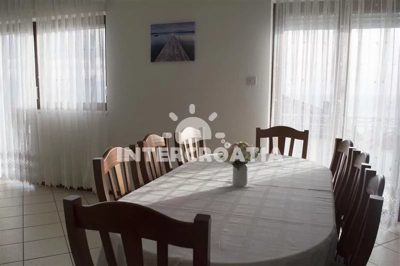Apartmán (92 m2) s výhledem na moře se nachází v prvním patře vily a je vhodný pro 6 až 8 osob. Obývací pokoj je spojený s kuchyní. Kuchyňská linka je vybavena sporákem, digestoří, troubou, myčkou na nádobí, mikrovlnnou troubou, rychlovarnou konvicí, nádobím a lednicí s mrazákem. Obývací pokoj s jídelním stolem pro 8 osob, rohovou pohovkou (rozložitelná na extra lůžko pro 2 osoby), televizí se satelitním programem, klimatizací a vstupem na balkon. První i druhá ložnice je vybavena vždy s jedním dvoulůžkem a vstupem na balkon. Třetí ložnice s dvěma jednolůžky a vstupem na balkon. Dvě samostatné koupelny se sprchovým koutem, umyvadlem a wc. Dále k dispozici v apartmánu fén na vlasy, WiFi a pračka. Parkování u objektu zdarma.