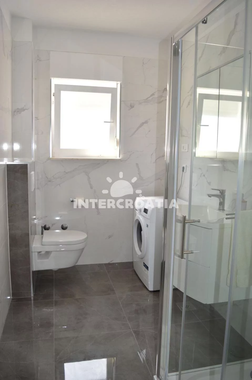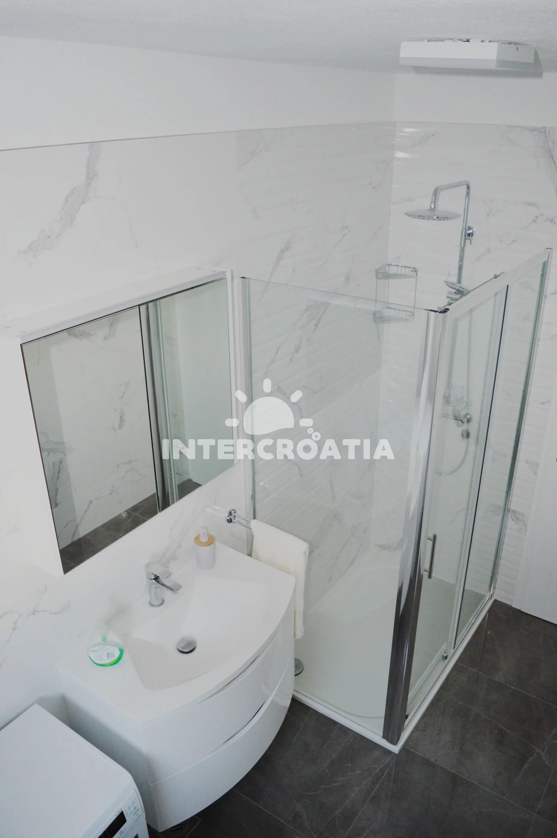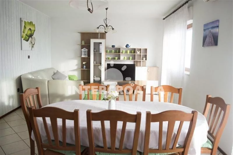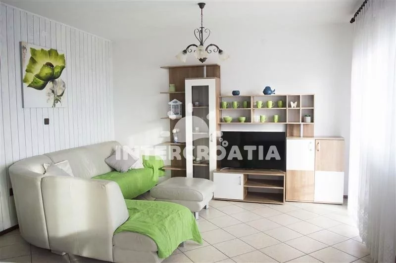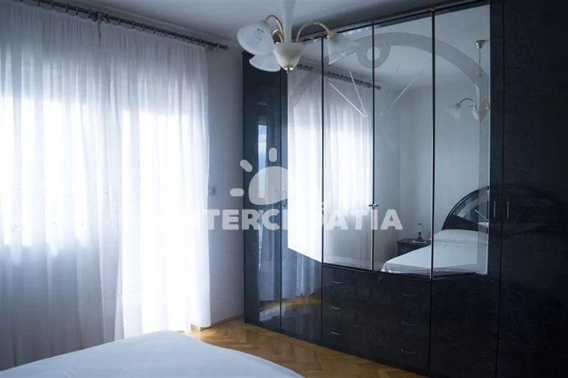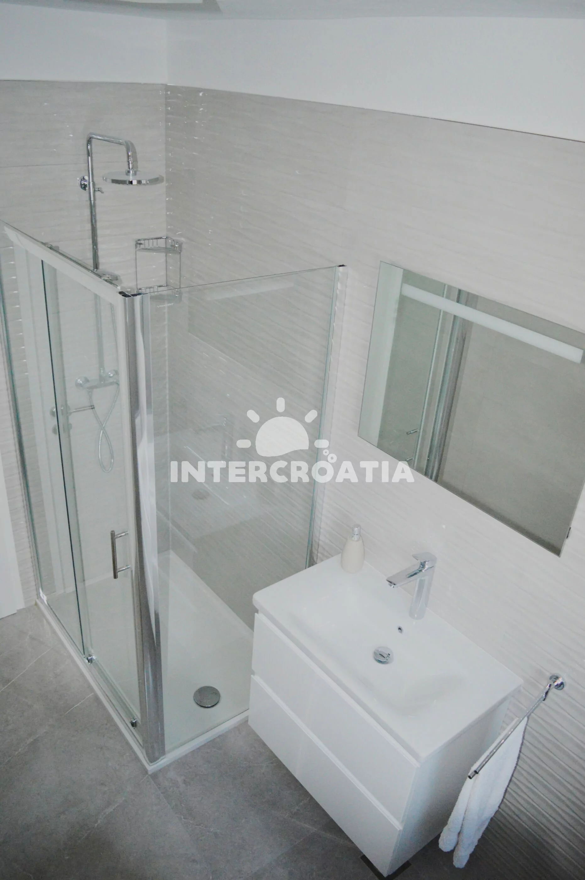 Apartmán (92 m2) s výhledem na moře se nachází v prvním patře vily a je vhodný pro 6 až 8 osob. Obývací pokoj je spojený s kuchyní. Kuchyňská linka je vybavena sporákem, digestoří, troubou, myčkou na nádobí, mikrovlnnou troubou, rychlovarnou konvicí, nádobím a lednicí s mrazákem. Obývací pokoj s jídelním stolem pro 8 osob, rohovou pohovkou (rozložitelná na extra lůžko pro 2 osoby), televizí se satelitním programem, klimatizací a vstupem na balkon. První i druhá ložnice je vybavena vždy s jedním dvoulůžkem a vstupem na balkon. Třetí ložnice s dvěma jednolůžky a vstupem na balkon. Dvě samostatné koupelny se sprchovým koutem, umyvadlem a wc. Dále k dispozici v apartmánu fén na vlasy, WiFi a pračka. Parkování u objektu zdarma.