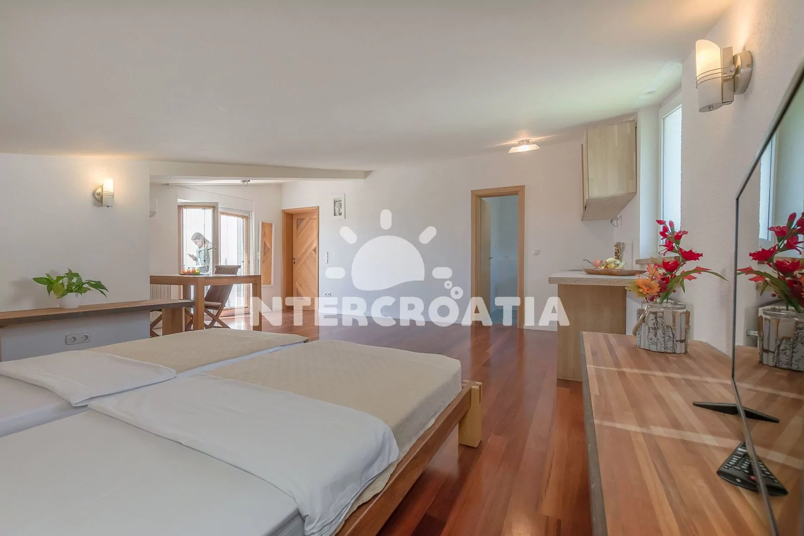 Apartmán typu studio s terasou, výhledem na moře, zahrady a klidné ulice je vhodný pro 2 osoby a nachází se ve třetím patře vily. Obývací pokoj je spojený s kuchyní. Kuchyňská linka je vybavena varnou deskou, troubou, myčkou na nádobí, mikrovlnnou troubou, rychlovarnou konvicí, kávovarem, toustovačem, nádobím a lednicí s mrazákem. Obývací pokoj s jídelním stolem pro 2 osoby, LCD televizí se satelitním programem, klimatizací, dvěma jednolůžky a vstupem na terasu. Koupelna se sprchovým koutem, umyvadlem, fénem a wc. Hostům je k dispozici v apartmánu sejf, žehlička a parkovací místa u objektu zdarma.