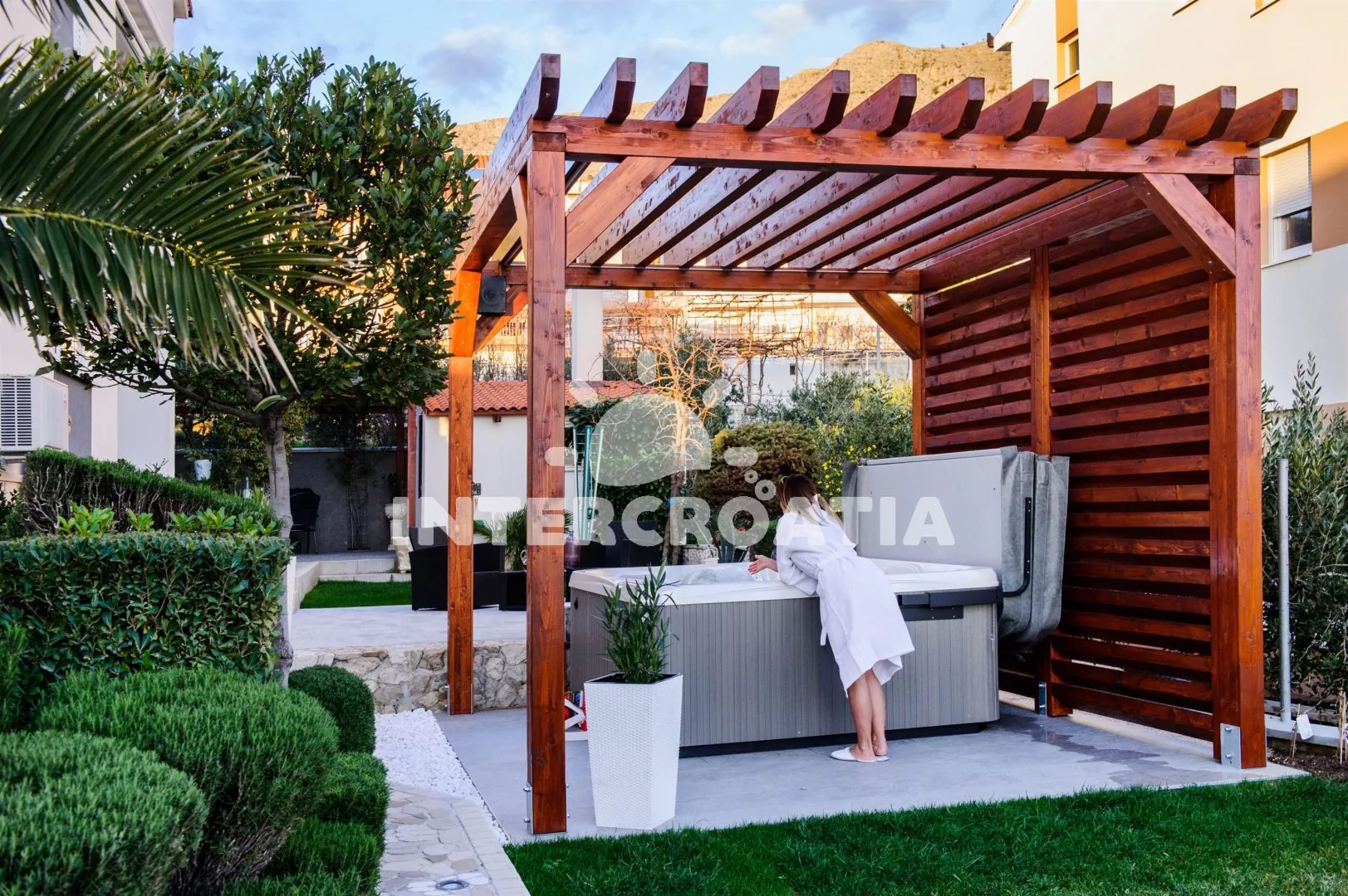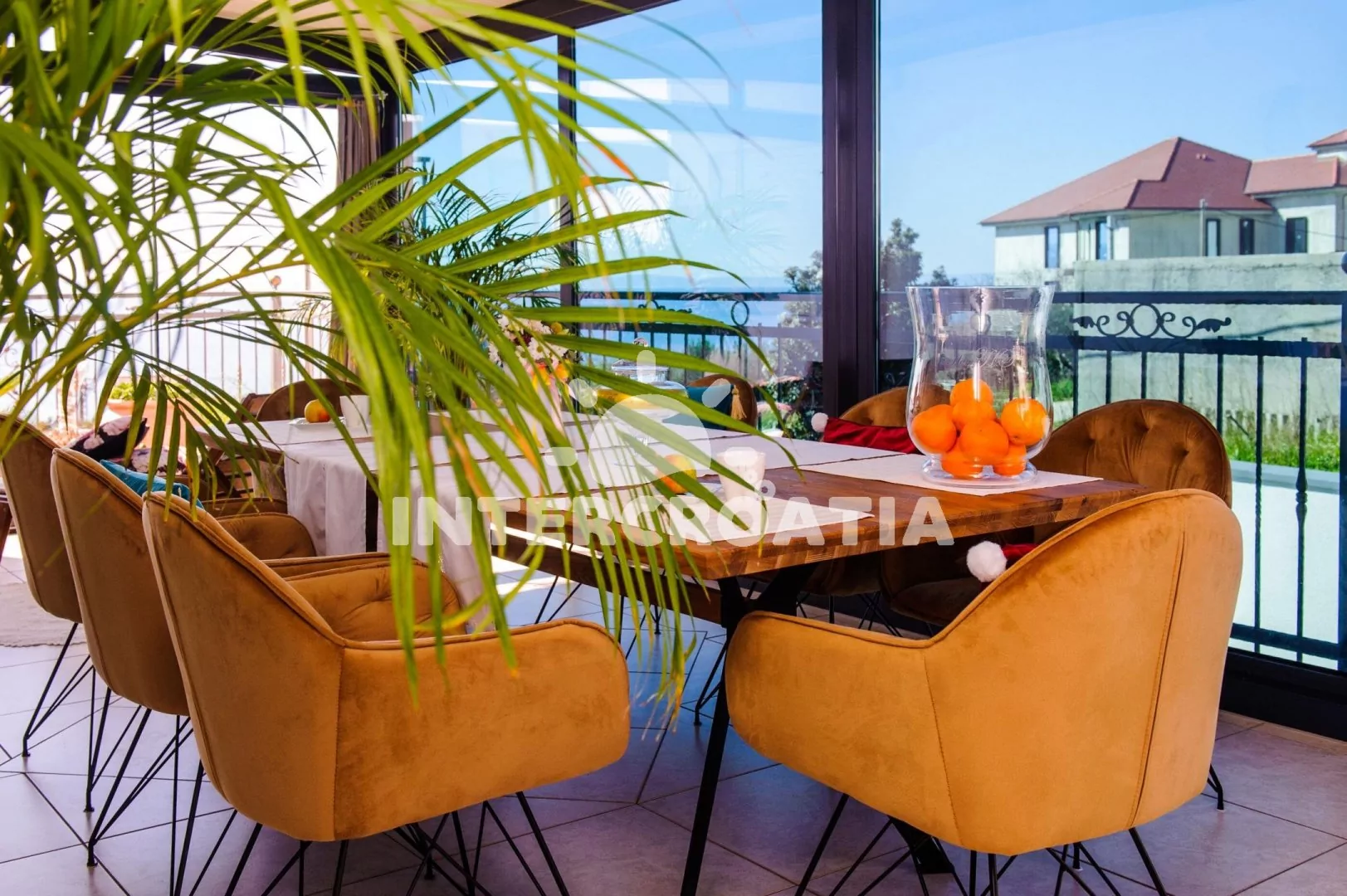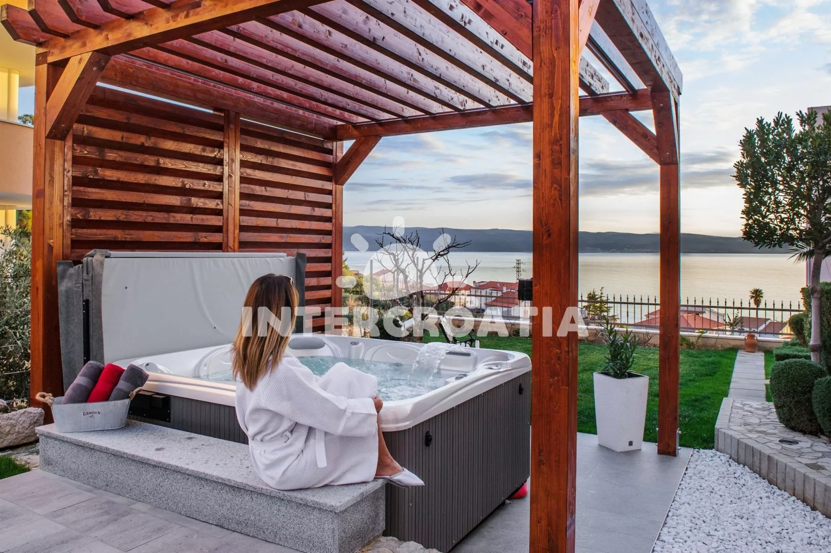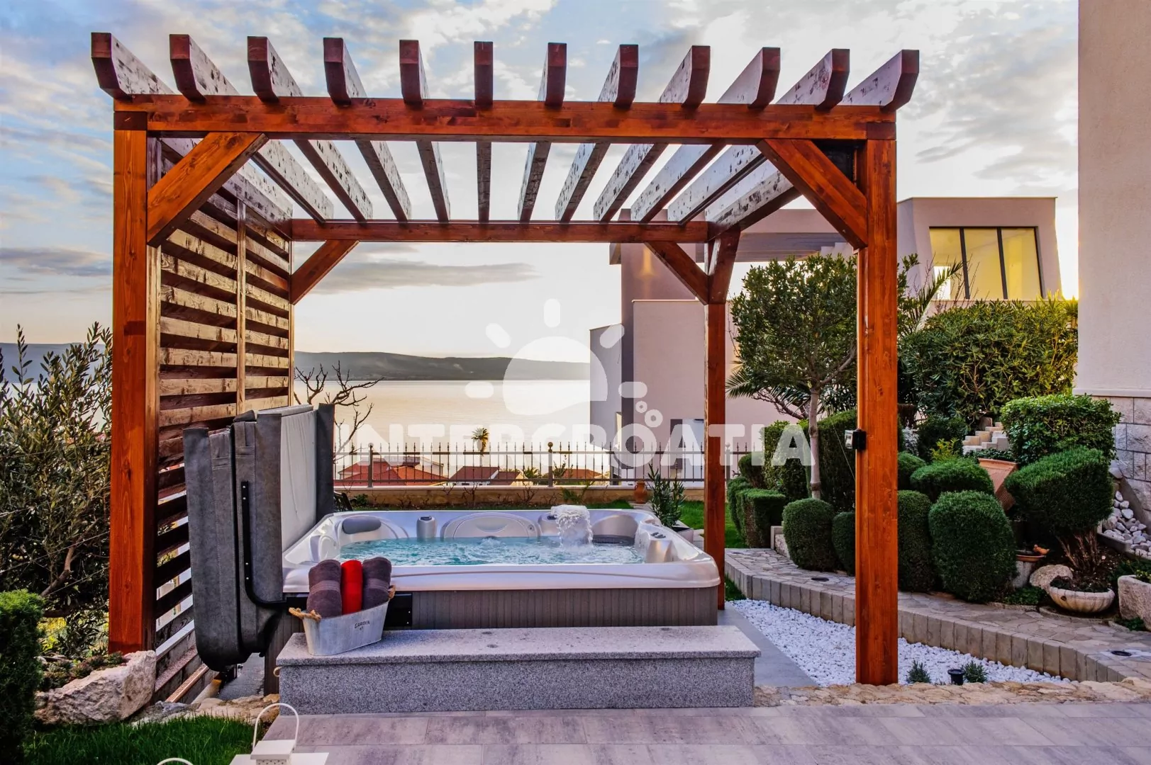 Apartmánová vila umístěná v klidné lokalitě s výhledem na moře a 350 m pěší chůzí od pláže. Kolem vily okrasná zahrada se společnou terasou, pergolou a vířivkou. K dispozici zimní zahrada s posezením a parkovací místa u objektu.