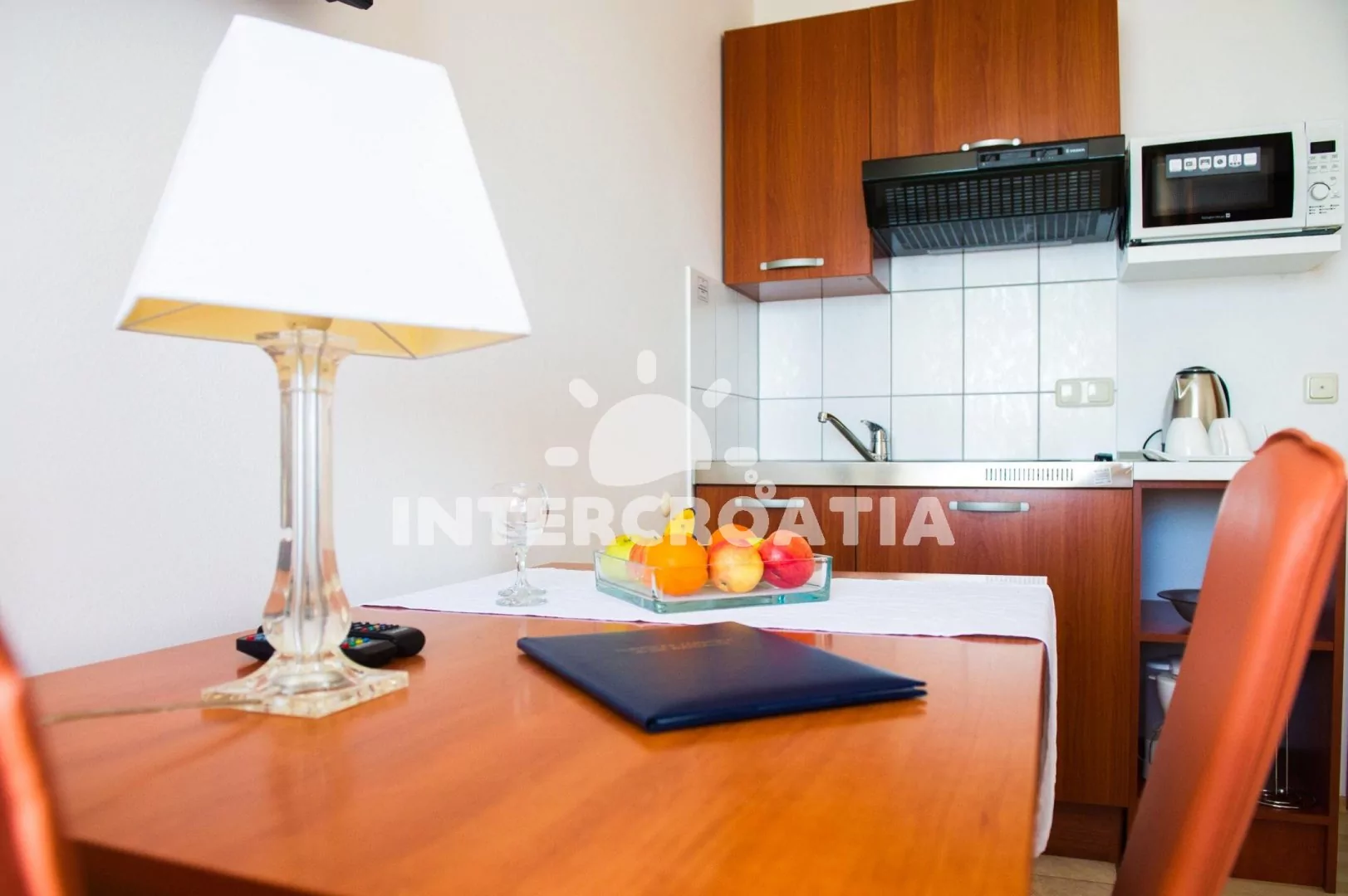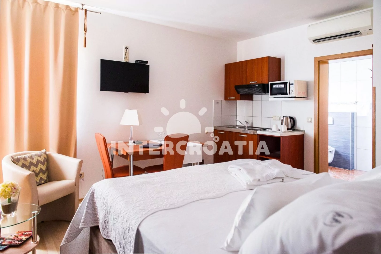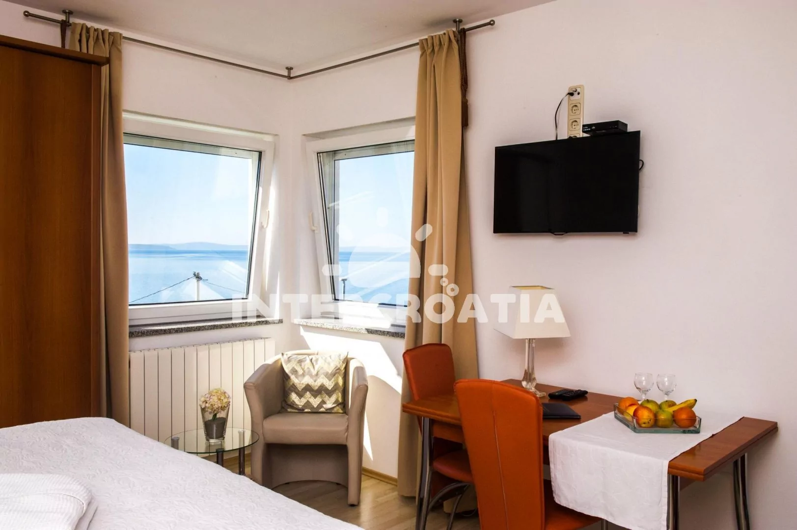 Apartmán typu studio (23 m2) s výhledem na moře se nachází v 1. patře vily a je vhodný pro 2 osoby. Obývací místnost je spojena s kuchyní. Kuchyňská linka je vybavena dvouplotýnkovým vařičem, digestoří, mikrovlnnou troubou, rychlovarnou konvicí, kávovarem, nádobím a lednicí s mrazákem. Obývací místnost s jídelním stolem pro 2 osoby, televizí se satelitním programem, radiem, jedním dvoulůžkem, sejfem a klimatizací. Koupelna se sprchovým koutem, umyvadlem, fénem a wc. Hostům je k dispozici parkování u objektu zdarma.