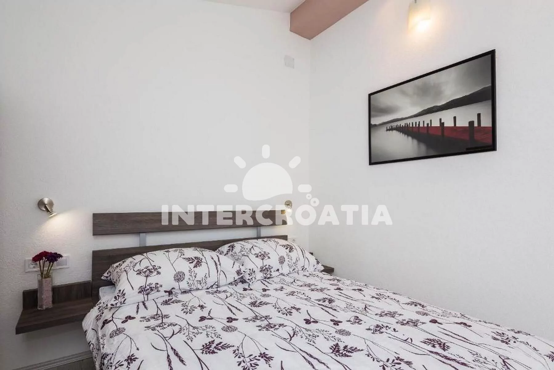 Apartmán (35 m2) s terasou, výhledem na moře a venkovním posezením se nachází ve 2. patře domu. Apartmán má 1 ložnici a je vhodný pro 2 až 4 osoby. Obývací pokoj je spojený s kuchyní. Kuchyňská linka je vybavena dvouplotýnkovým vařičem, mikrovlnnou troubou, rychlovarnou konvicí, kávovarem, toustovačem, nádobím a lednicí s mrazákem. Obývací pokoj s jídelním stolem, pohovkou (rozložitelná na extra lůžko pro 2 osoby), televizí, klimatizací a vstupem na terasu. Ložnice s jedním dvoulůžkem. Koupelna se sprchovým koutem, umyvadlem, fénem a wc. Hostům je k dispozici parkování u objektu zdarma.