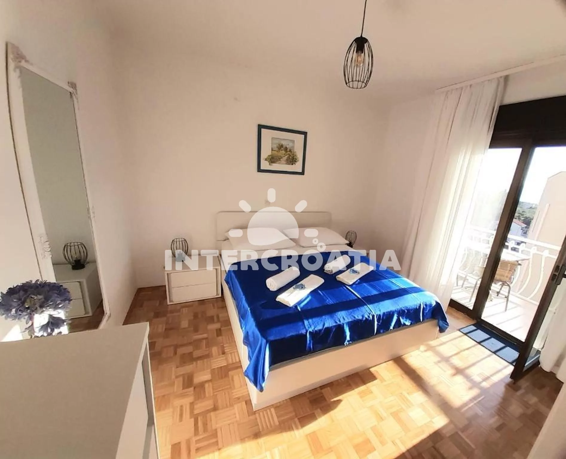 Apartmán (30 m2) s balkonem, posezením a výhledem na moře se nachází v 1. patře domu. Apartmán má 1 ložnici a je vhodný pro 2 až 3 osoby. Obývací pokoj je spojený s kuchyní. Kuchyňská linka je vybavena dvouplotýnkovým vařičem, rychlovarnou konvicí, toustovačem, kávovarem, nádobím a lednicí s mrazákem. Obývací pokoj s jídelním stolem, pohovkou (rozložitelná na extra lůžko pro 1 osobu), televizí a klimatizací. Ložnice s dvoulůžkem a vstupem na balkon. Koupelna se sprchovým koutem, umyvadlem, fénem a wc. Hostům je k dispozici parkování u objektu zdarma.