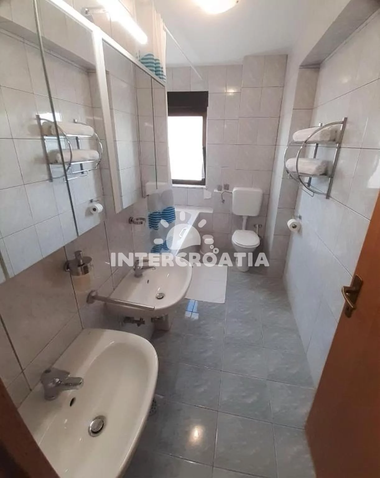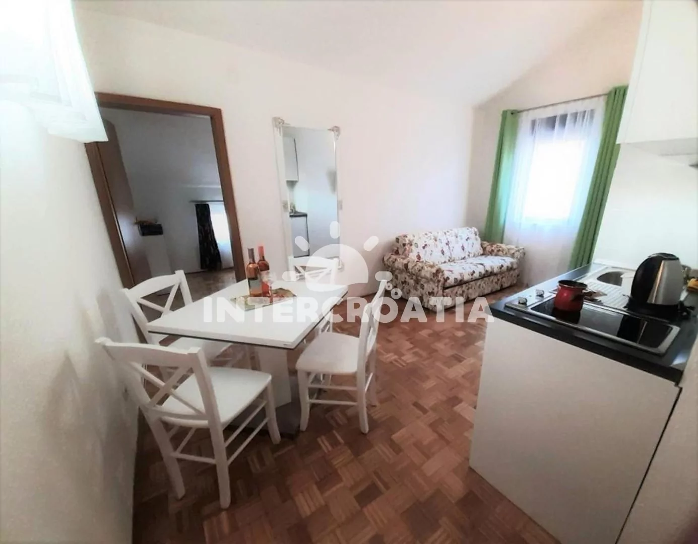 Apartmán (30 m2) s balkonem, posezením a částečným výhledem na moře se nachází ve 2. patře domu. Apartmán má 1 ložnici a je vhodný pro 2 až 3 osoby. Obývací pokoj je spojený s kuchyní. Kuchyňská linka je vybavena dvouplotýnkovým vařičem, rychlovarnou konvicí, toustovačem, kávovarem, nádobím a lednicí s mrazákem. Obývací pokoj s jídelním stolem, pohovkou (rozložitelná na extra lůžko pro 1 osobu), televizí a klimatizací. Ložnice s jedním dvoulůžkem. Koupelna se sprchovým koutem, umyvadlem, fénem a wc. Hostům je k dispozici parkování u objektu zdarma.