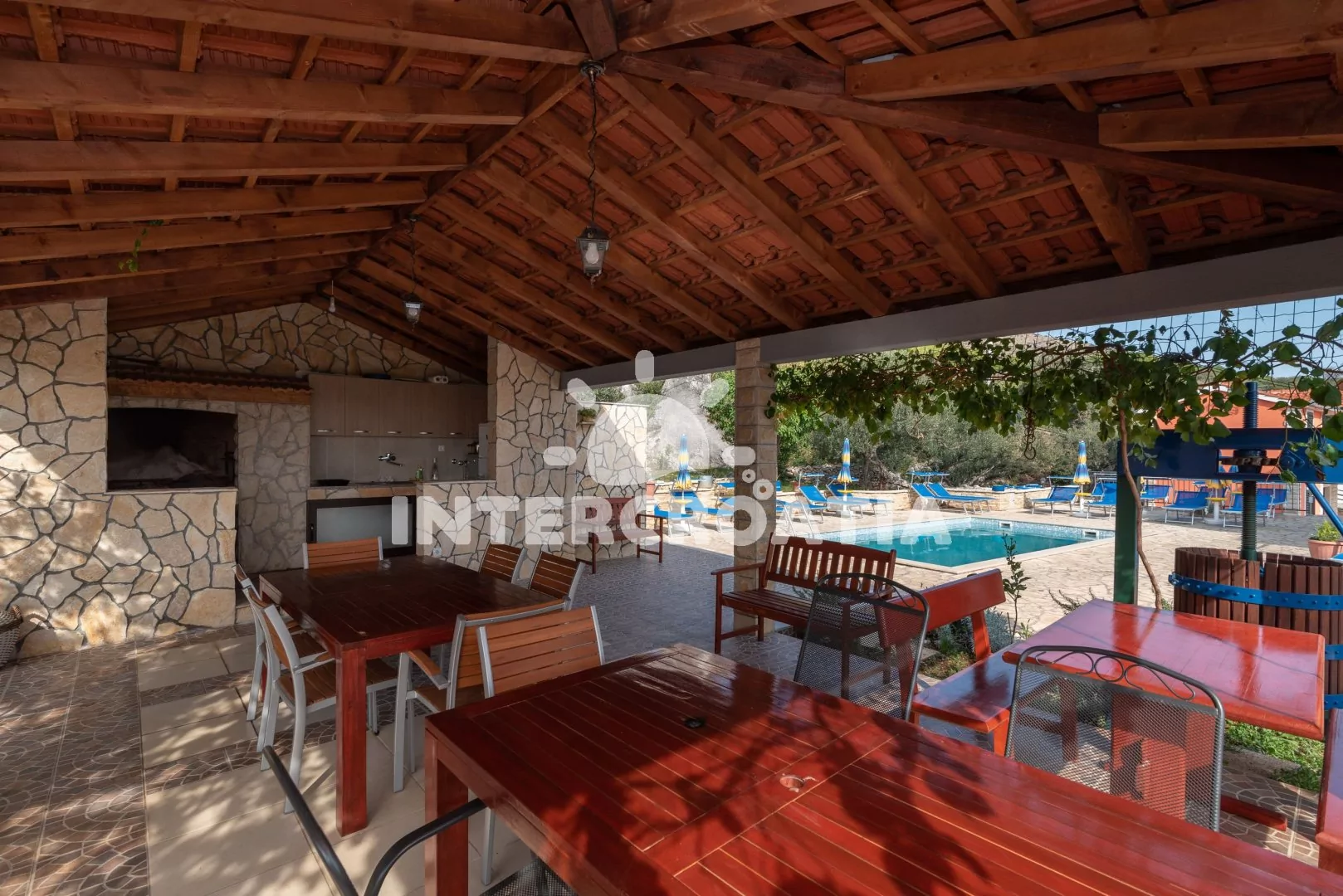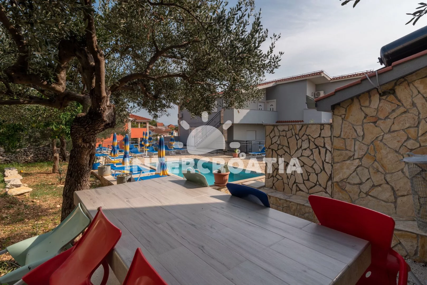 Moderní apartmánová vila s venkovním bazénem, lehátky u bazénu, solární sprchou, pergolou s posezením a zděným grilem. Vila nabízí ubytování ve 4 klimatizovaných apartmánech s lodžiemi a posezením. Přímo u vily je k dispozici dlážděné parkoviště pro automobily.
