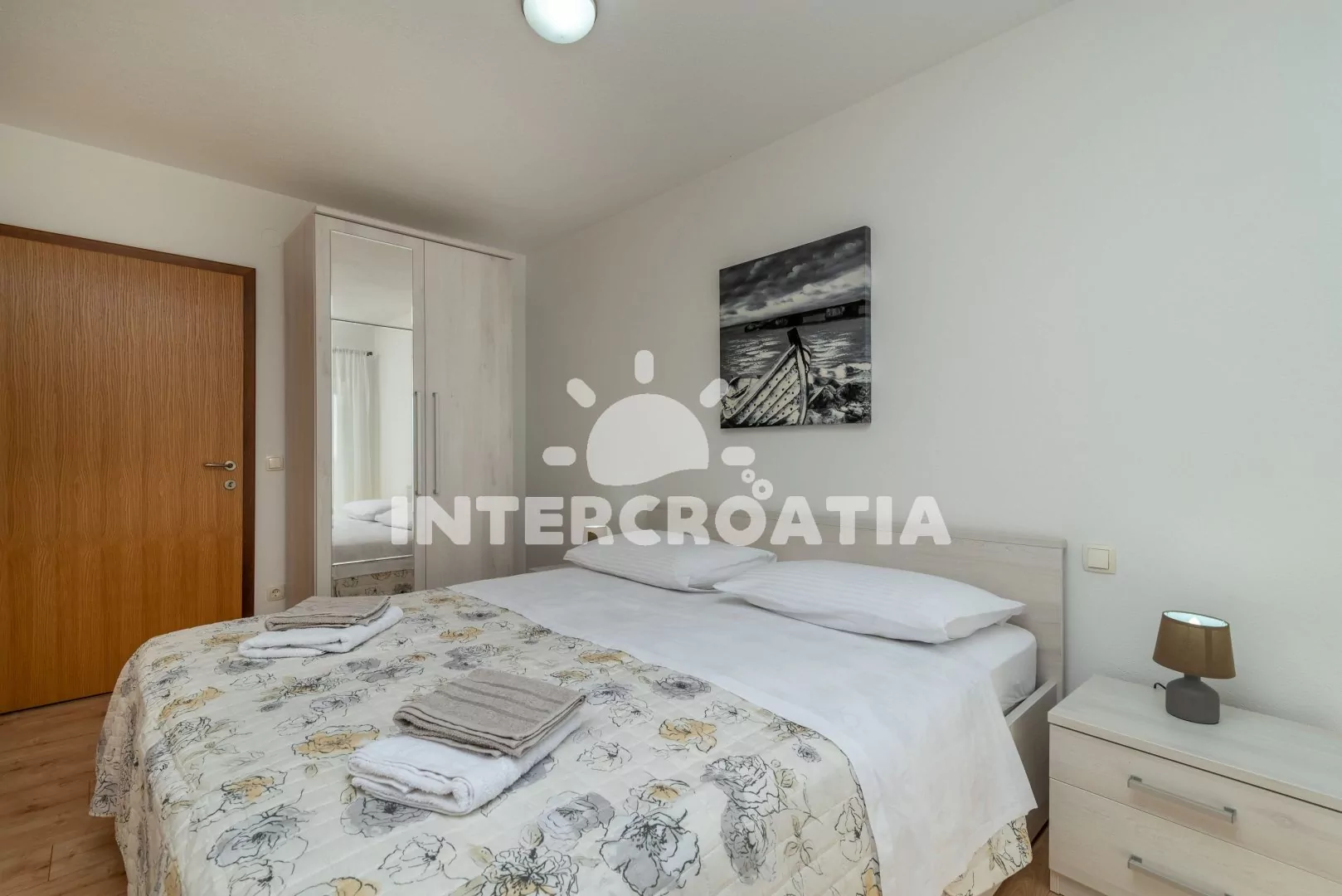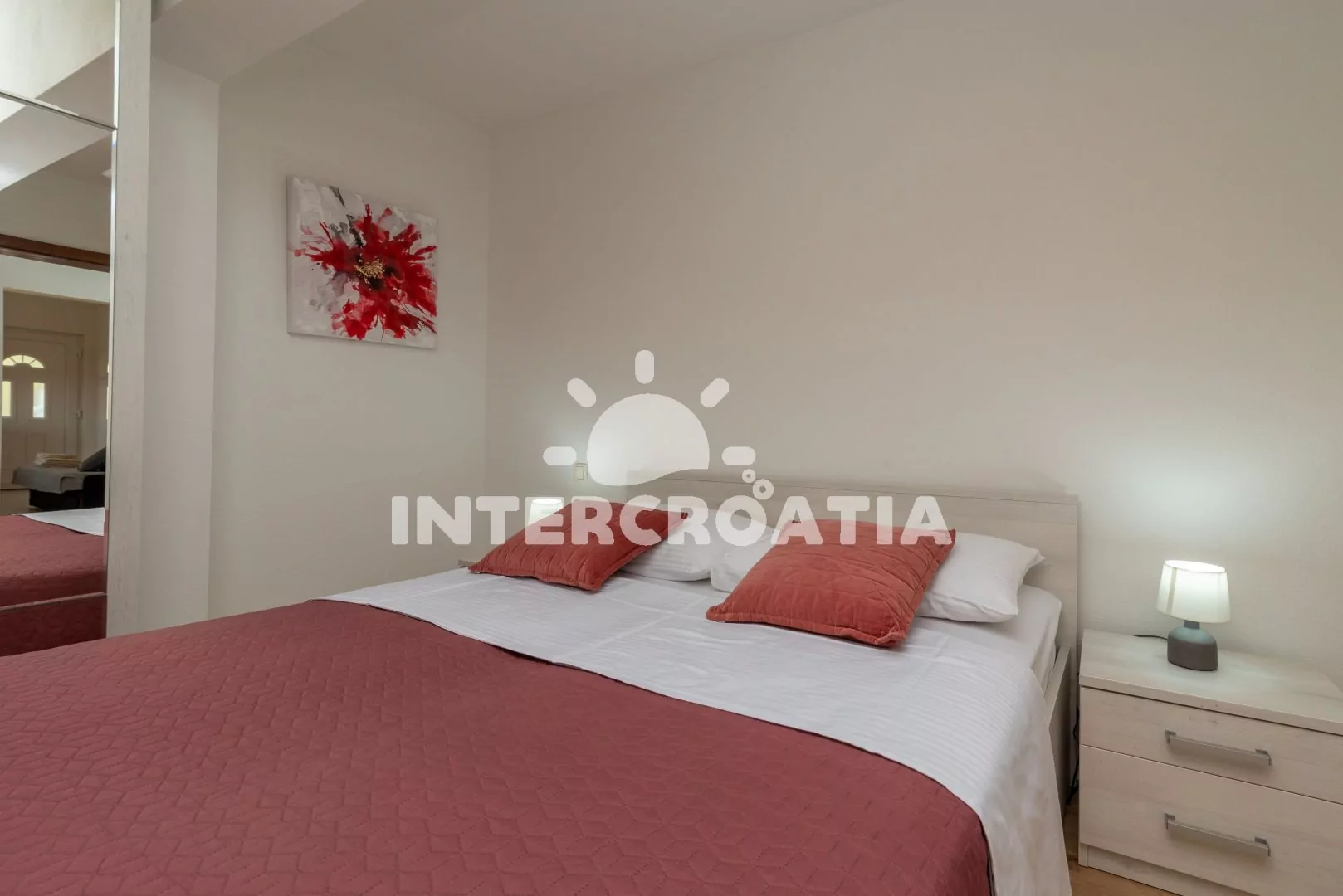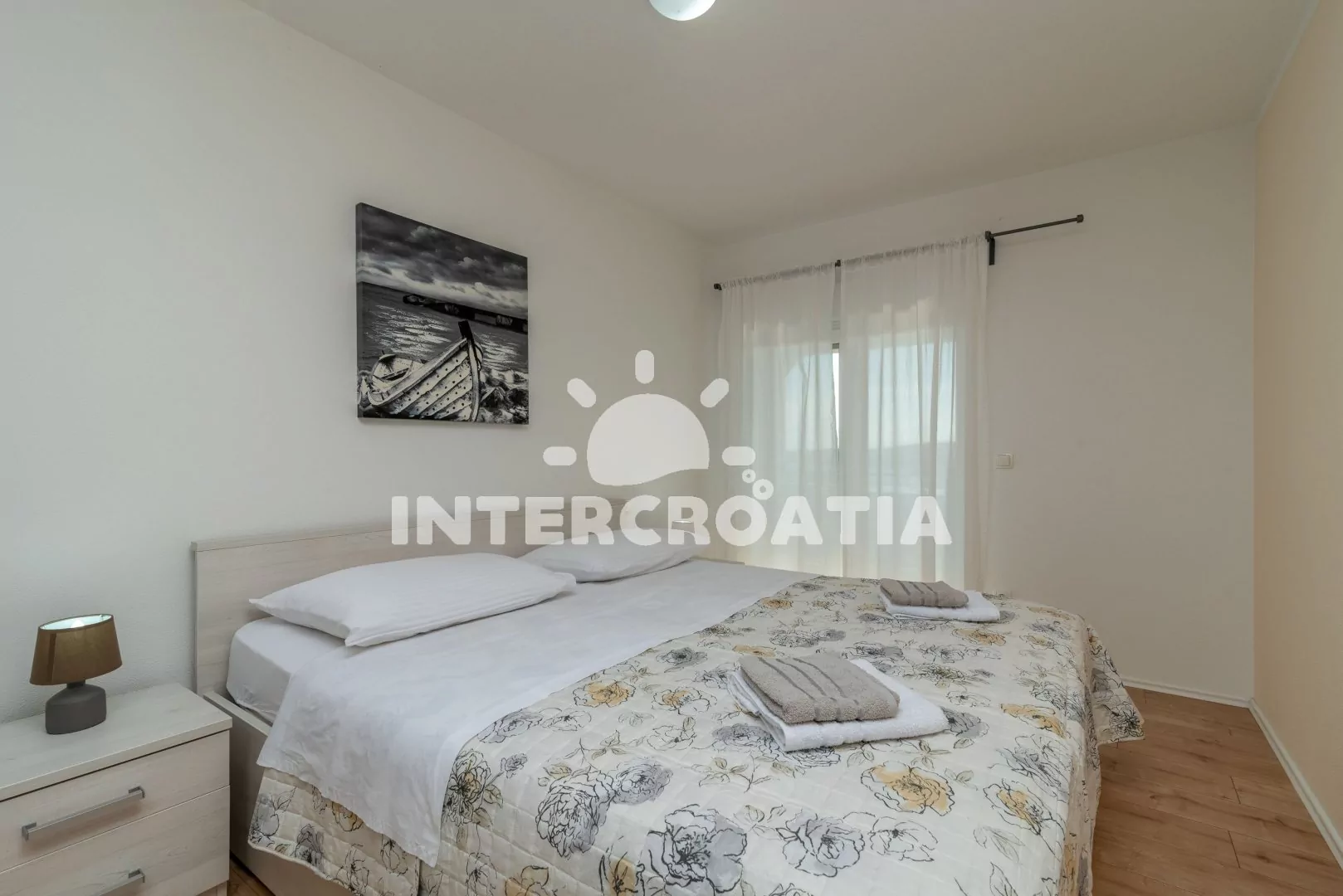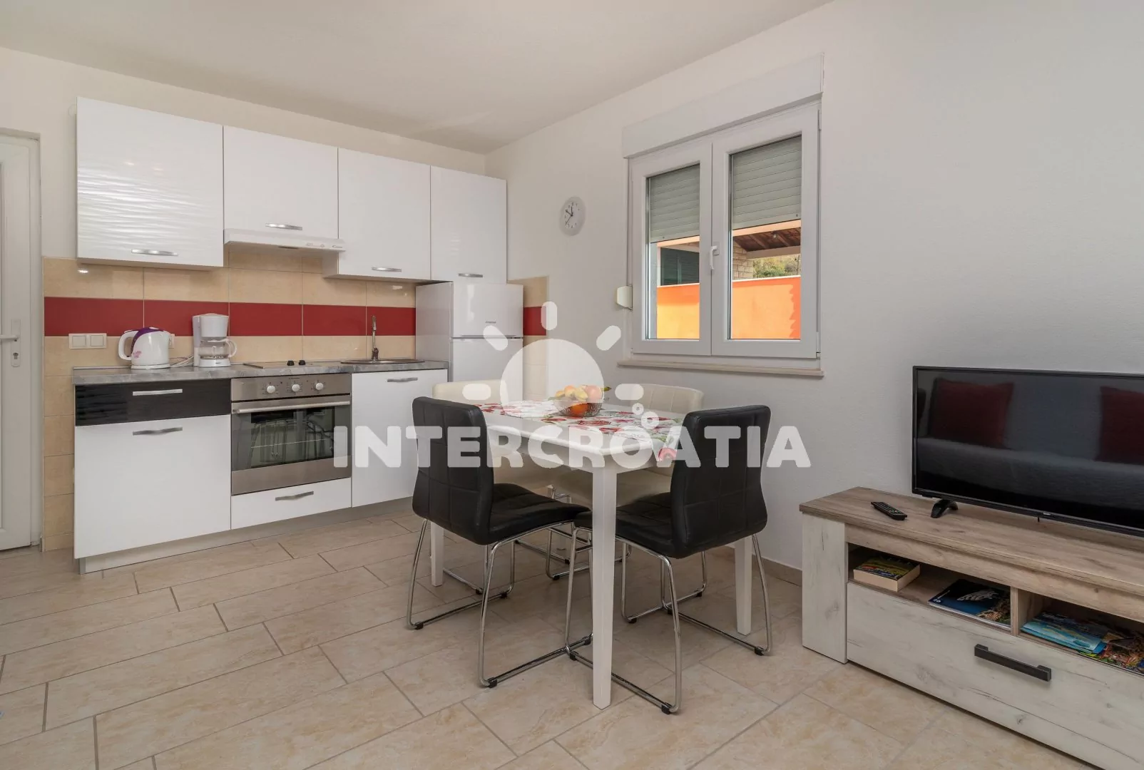 Apartmán (60 m2) s terasou, posezením a výhledem na moře se nachází v 1. patře vily. Apartmán má 2 ložnice a je vhodný pro 4 až 5 osob. Obývací pokoj je spojený s kuchyní. Kuchyňská linka je vybavena dvouplotýnkovým vařičem, digestoří, vestavěnou troubou, kávovarem, toustovačem, nádobím a lednicí s mrazákem. Obývací pokoj s jídelním stolem pro 4 osoby, pohovkou (rozložitelná na extra lůžko pro 1 osobu), televizí se satelitním programem a klimatizací. První ložnice s dvoulůžkem a vstupem na terasu. Druhá ložnice s dvoulůžkem. Koupelna se sprchovým koutem, umyvadlem, fénem a wc. Hostům je k dispozici parkování u objektu zdarma.